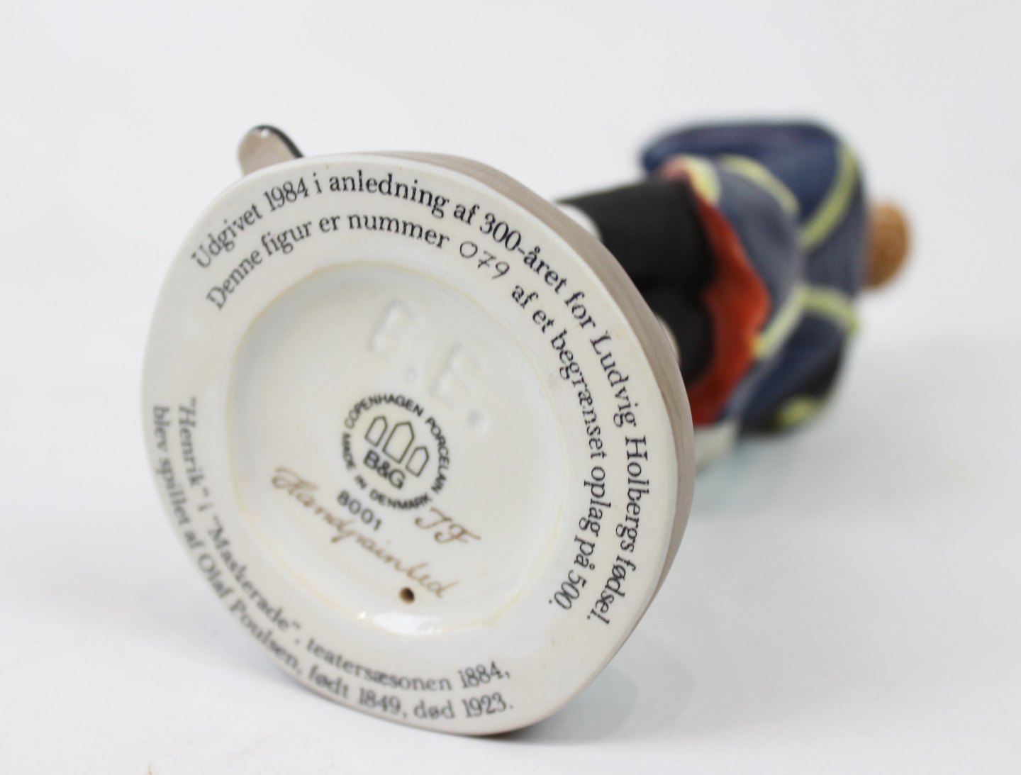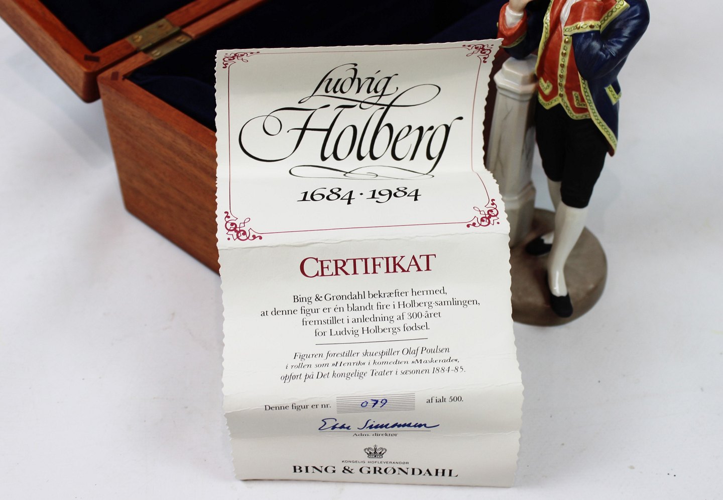 Ludvig Holberg figur udgivet i 1984 i anledning af 300 året for Ludvig Holbergs fødsel af B&G. Figuren er nummer 079 ud af 500 lavet, original kasse samt certifikat medfølger. Figuren forestiller skuespiller Olaf Poulsen i rollen som "Henrik" i komedien "Maskerade" opført på det kongelige teater i sæsonen 1884-1885.