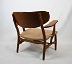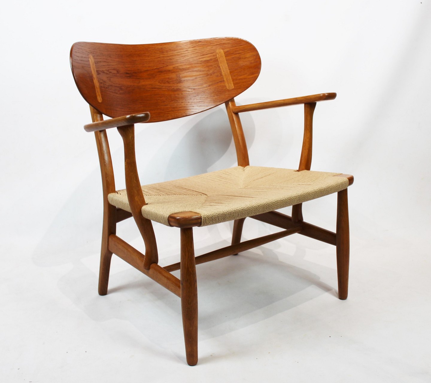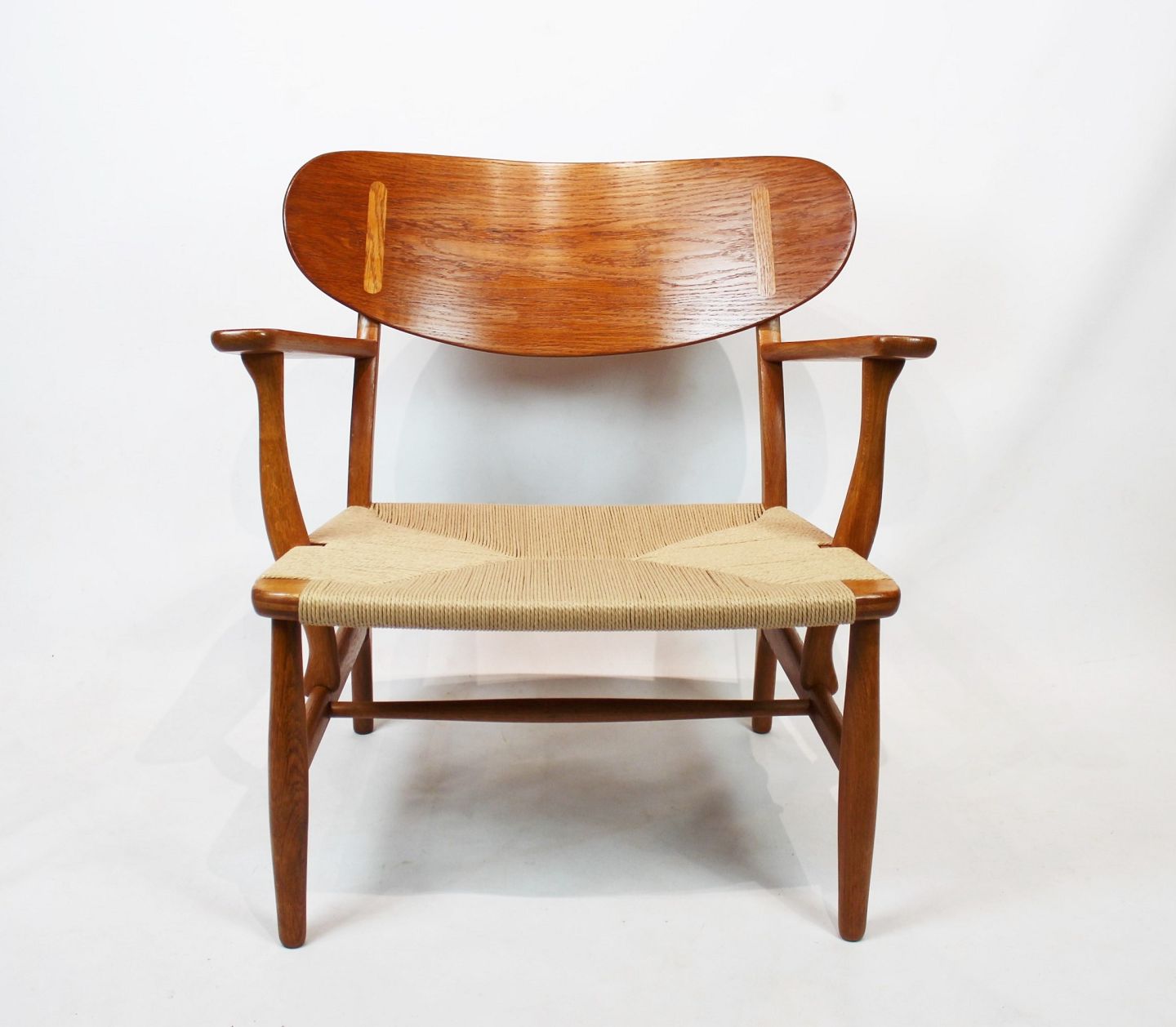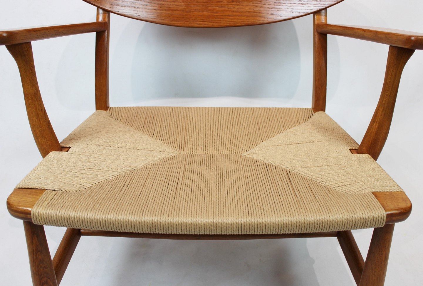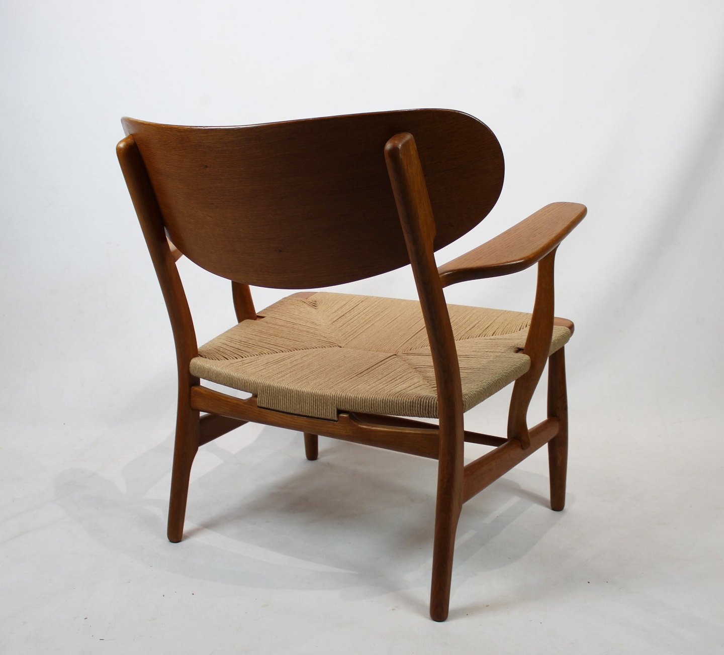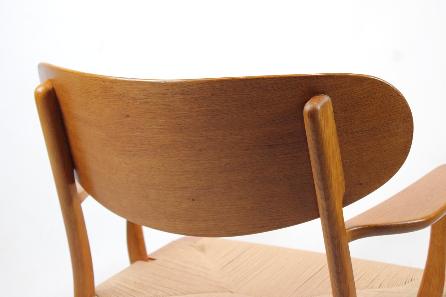 SolgtArmstol, model CH22, i egetræ og papirflet designet af Hans J. Wegner og fremstillet af Carl Hansen & Søn i 1950erne. Stolen er i flot original stand med ny flet.