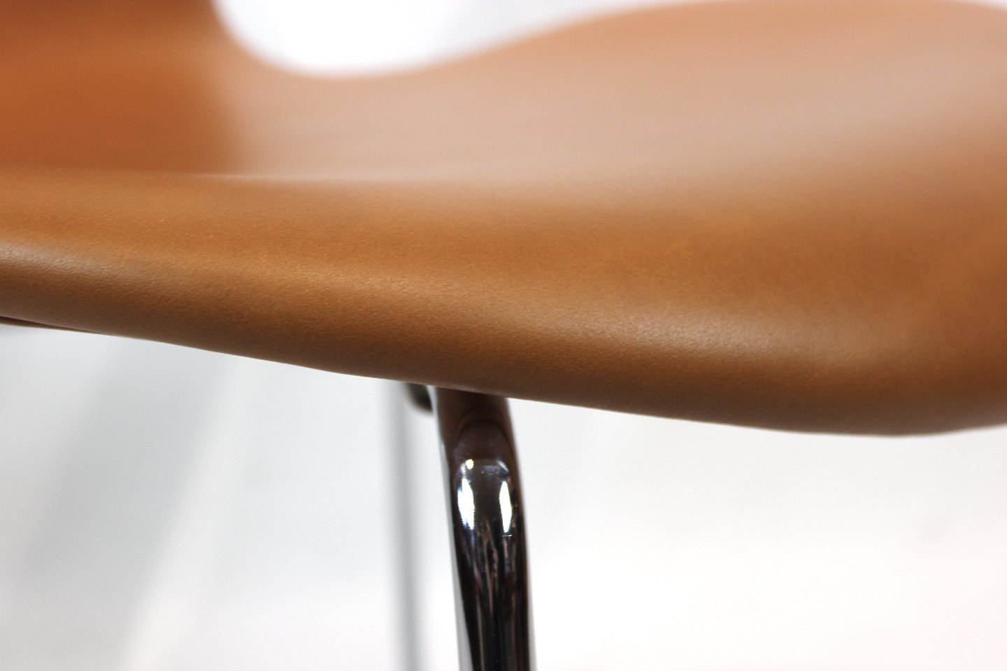 Stolene har en enkel og elegant form, der gør dem ideelle til en række indretningsstile. De er konstrueret med en solid ramme og polstret i smukt cognacfarvet klassisk læder, der tilføjer både luksus og komfort til deres design.
