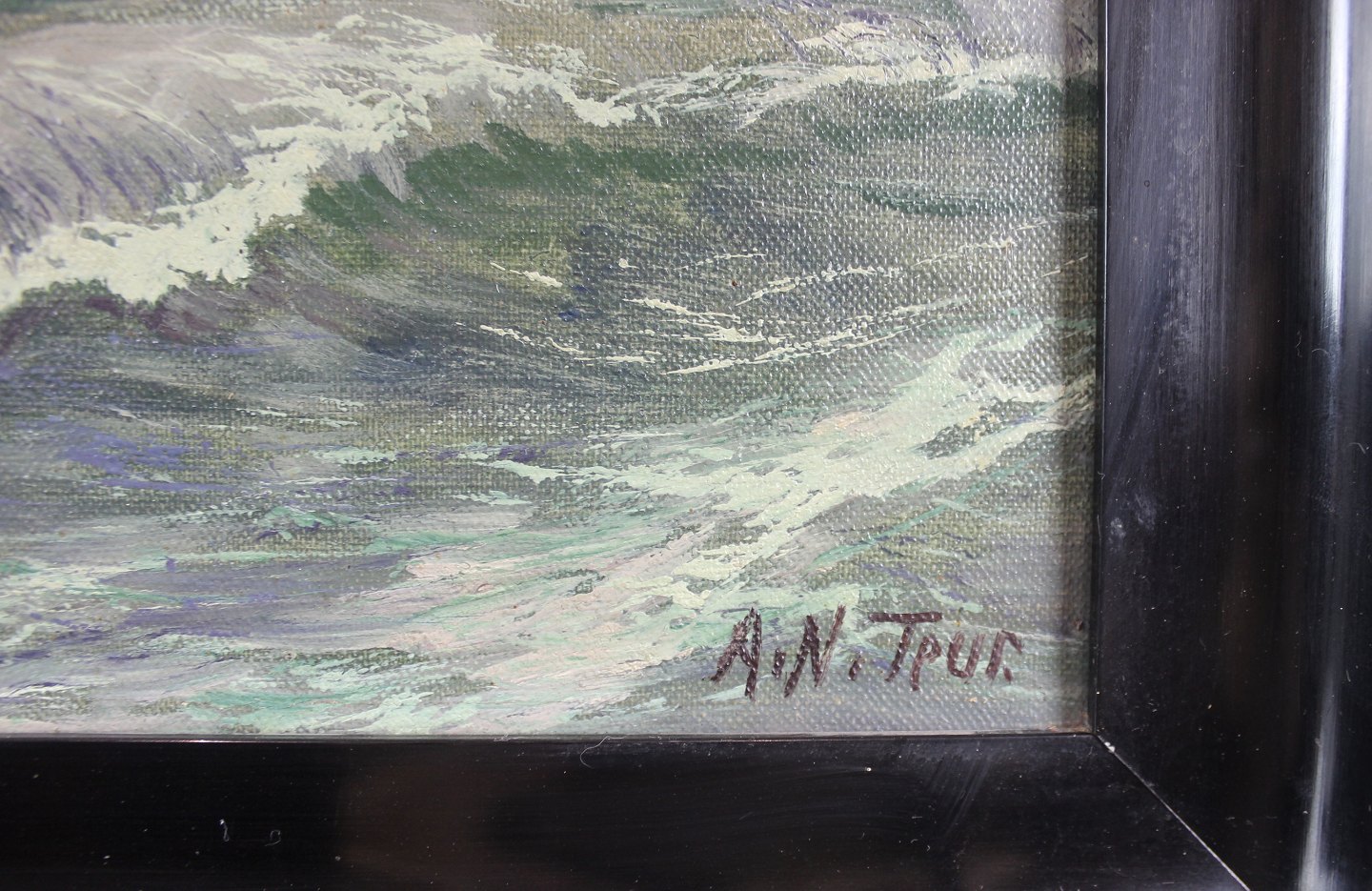 Oil painting with ocean motif and black wooden frame signed A. N. Tpur.