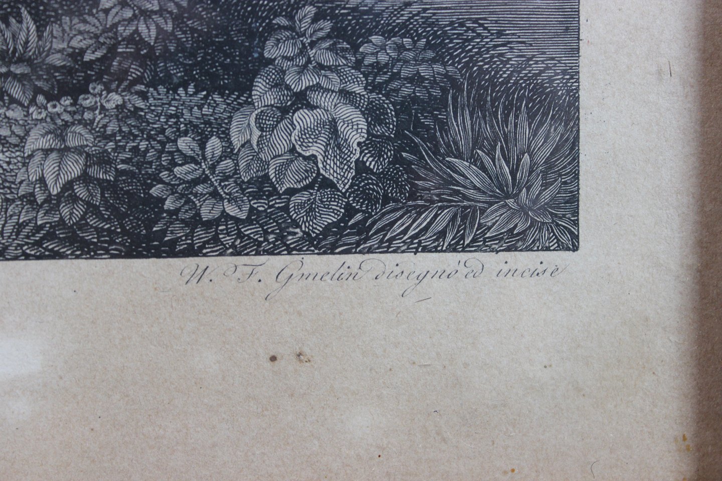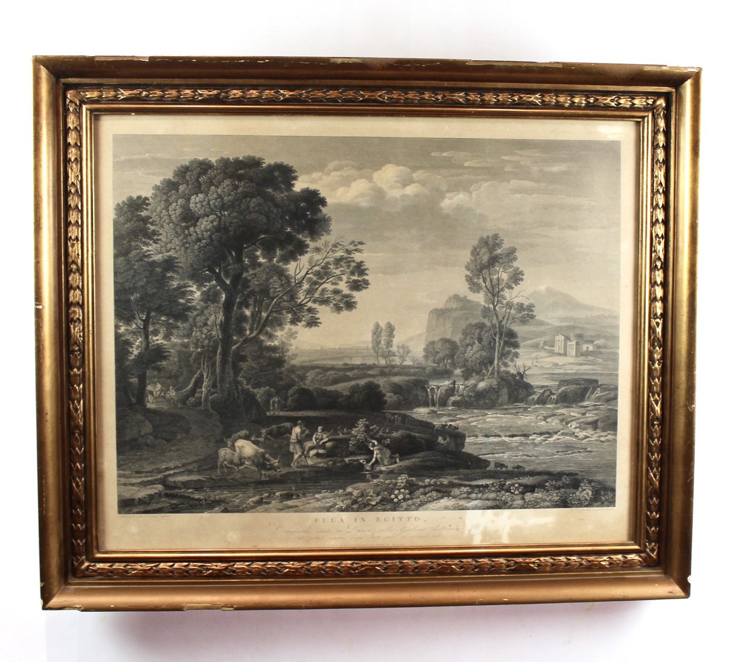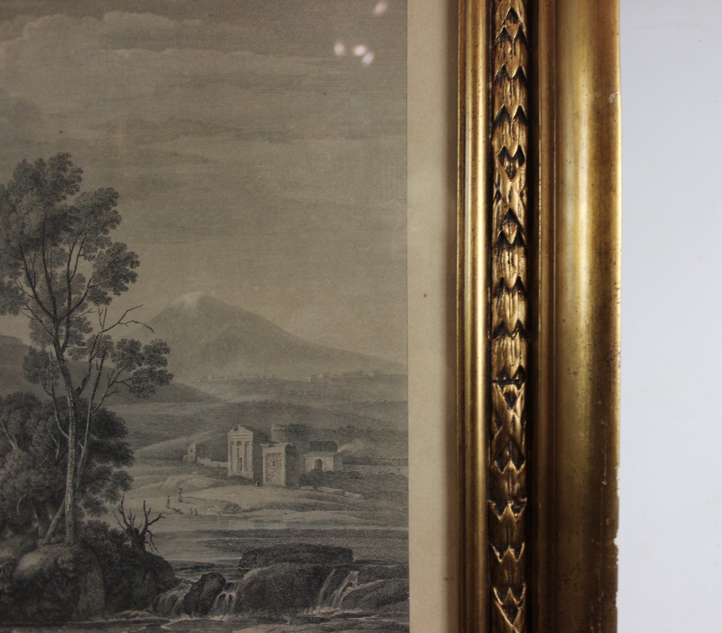 Copper engraving with nature landscape with gilded frame.