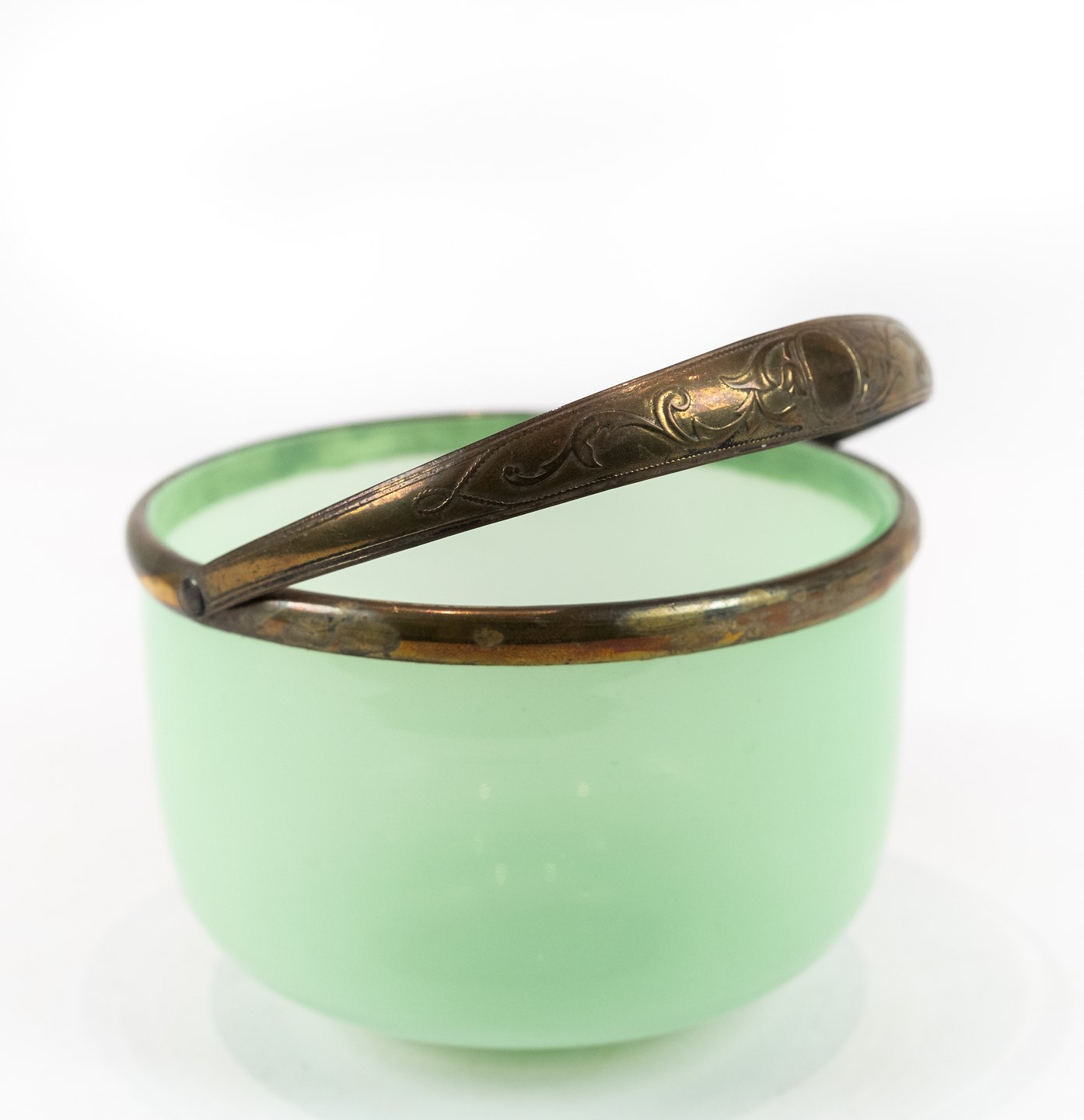 SoldGreen candy bowl of opaline glass with silver edge and handle decorated with engravings from Fyn's Glassworks. The bowl is in great vintage condition.