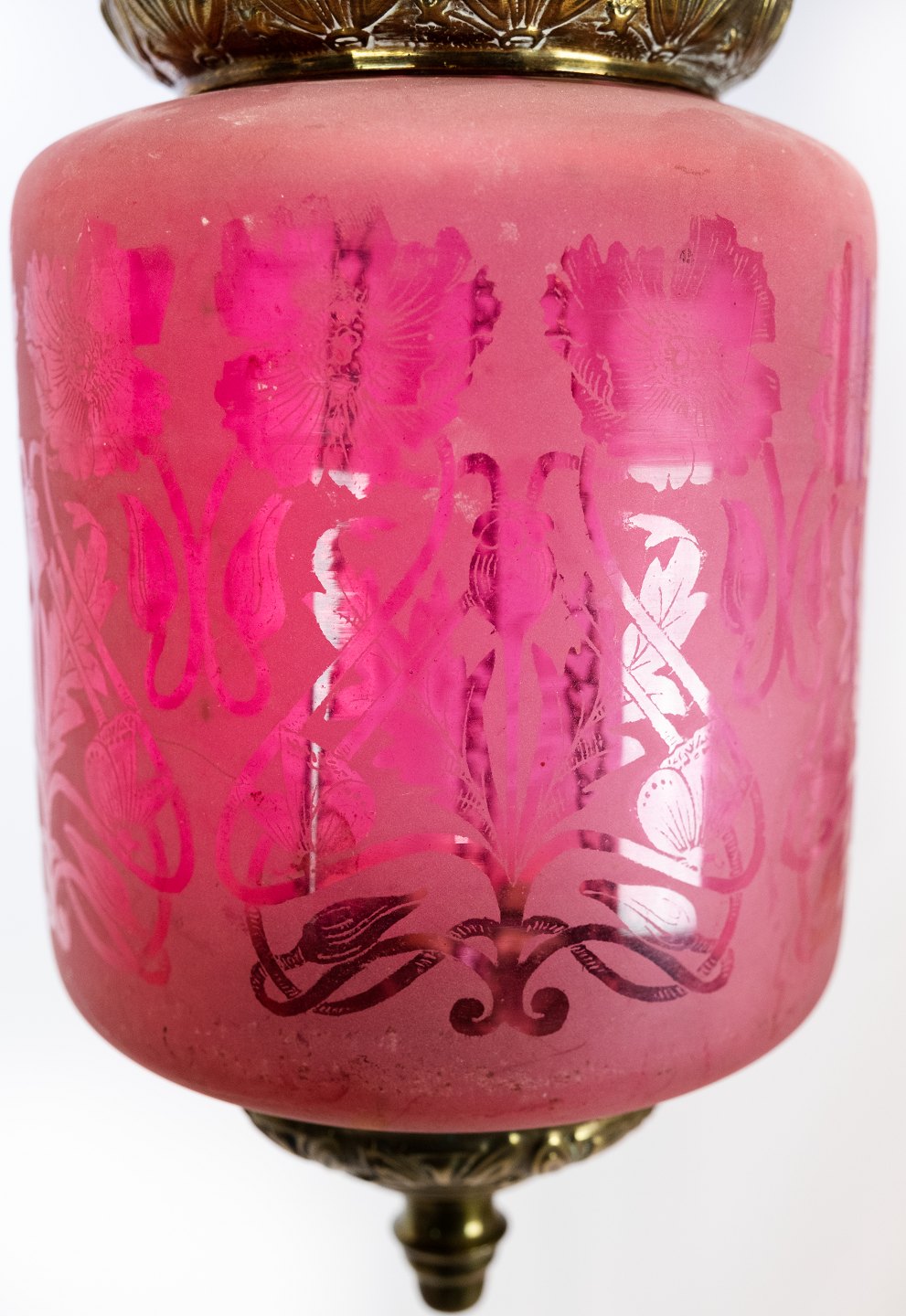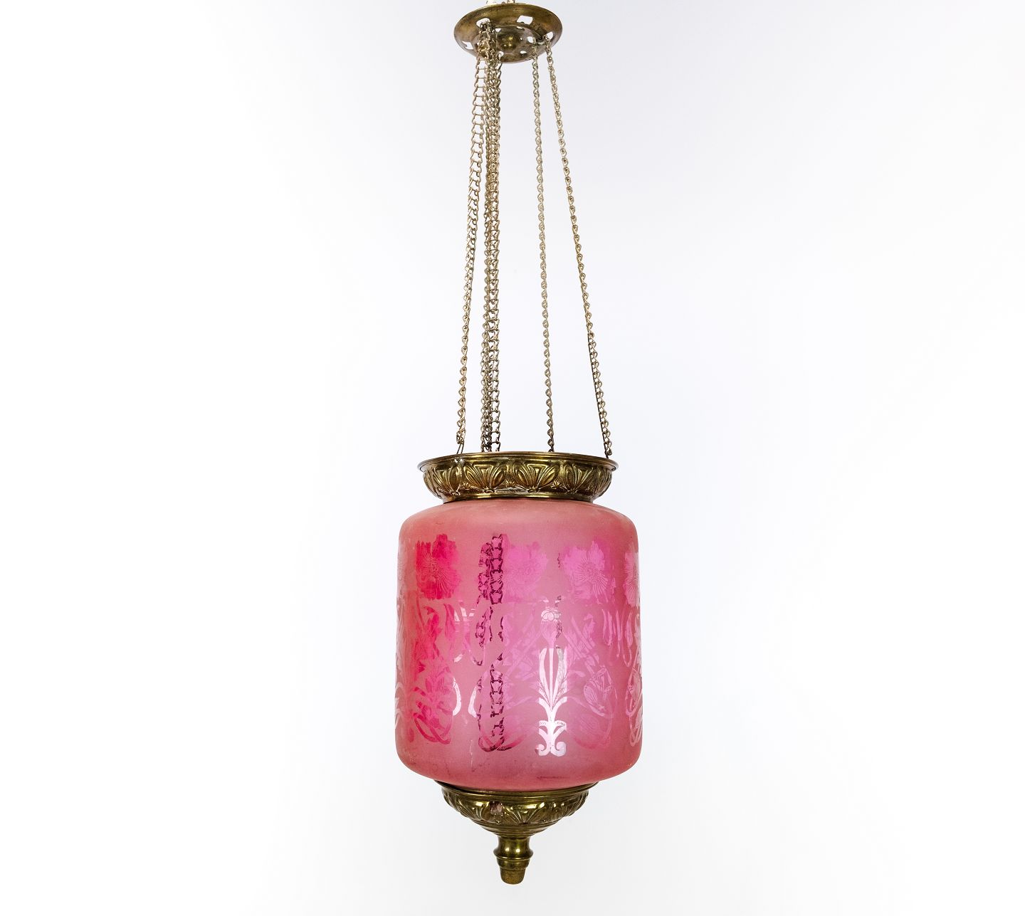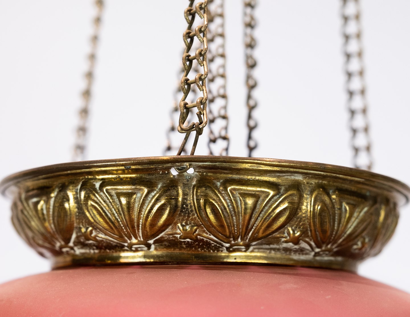 Antik Ampel med lyserødt opal glas med messing kant og ophæng, fra omkring år 1860.