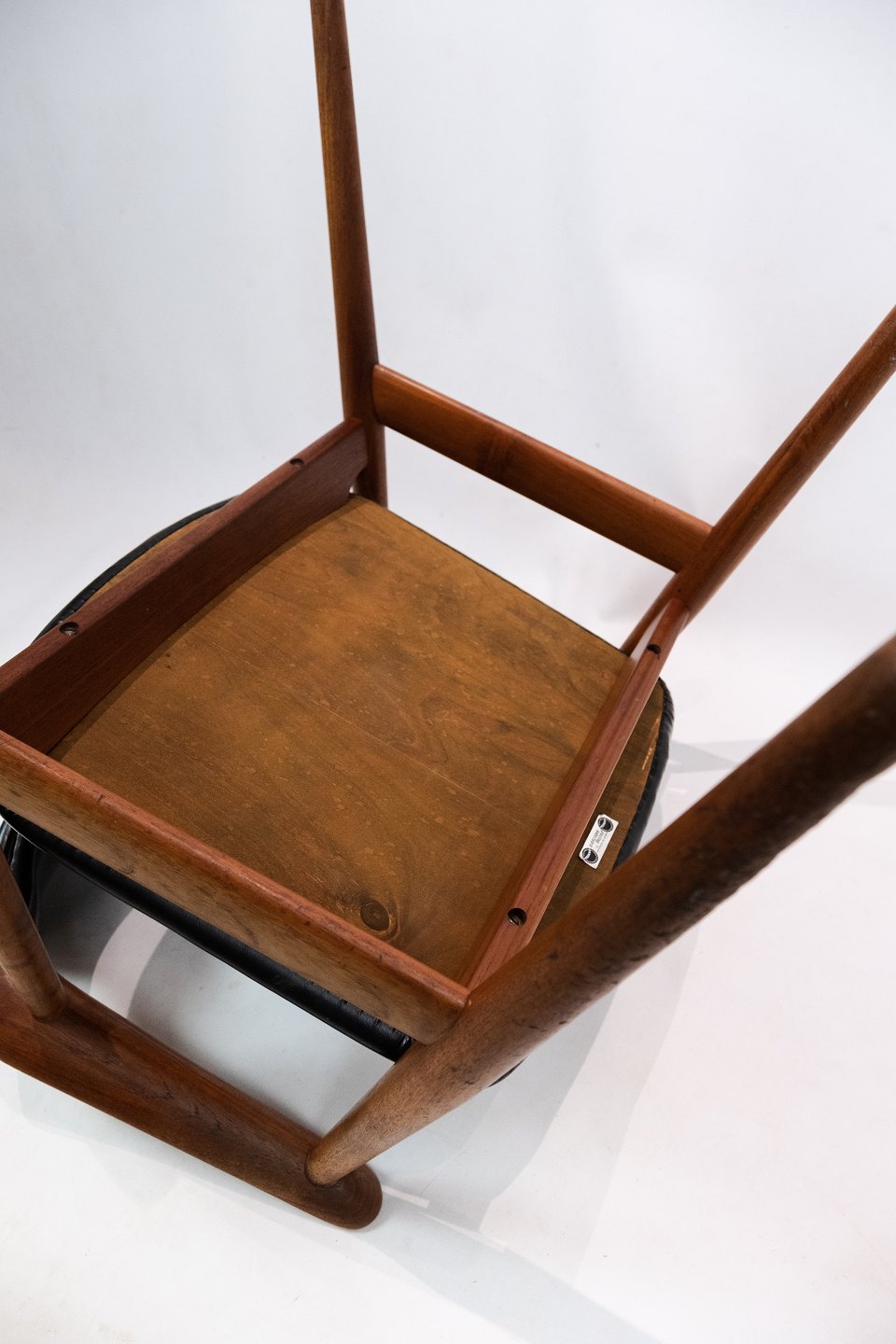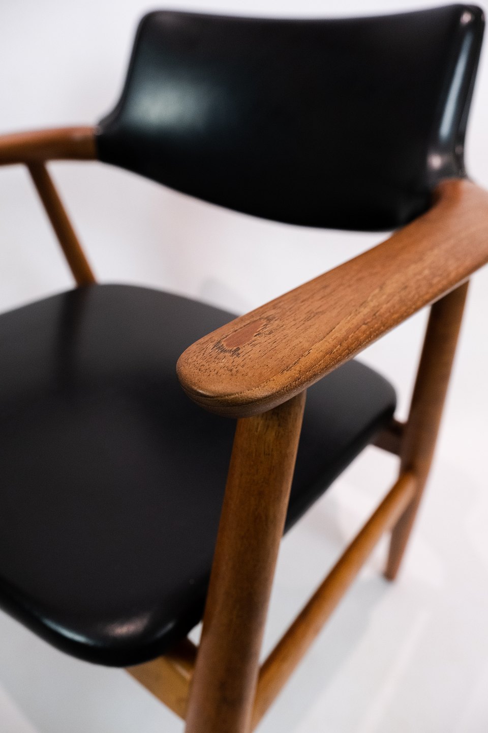 Armstol i teak og sort læder designet af Erik Kirkegaard og fremstillet af Glostrup Møbelfabrik i 1960erne.