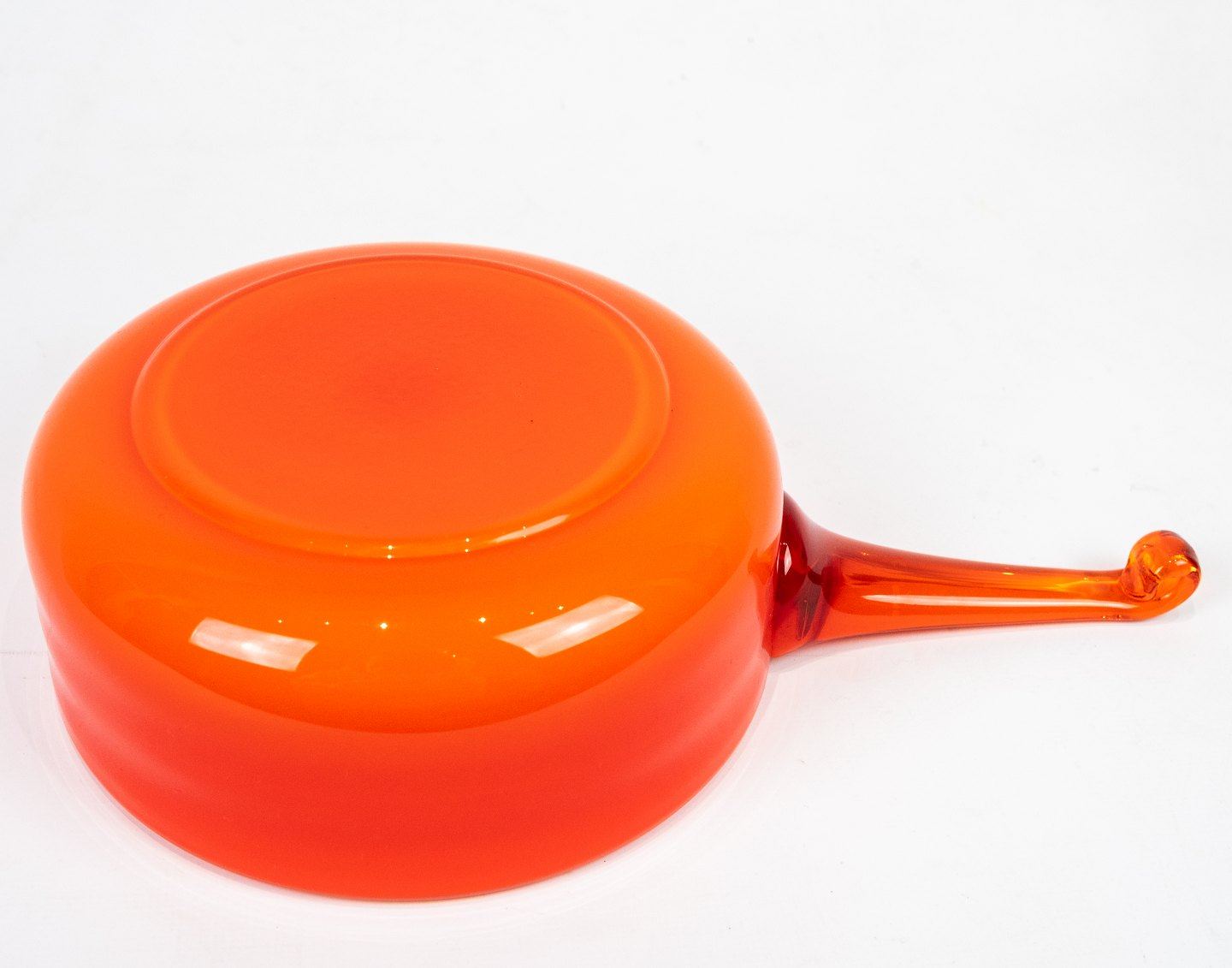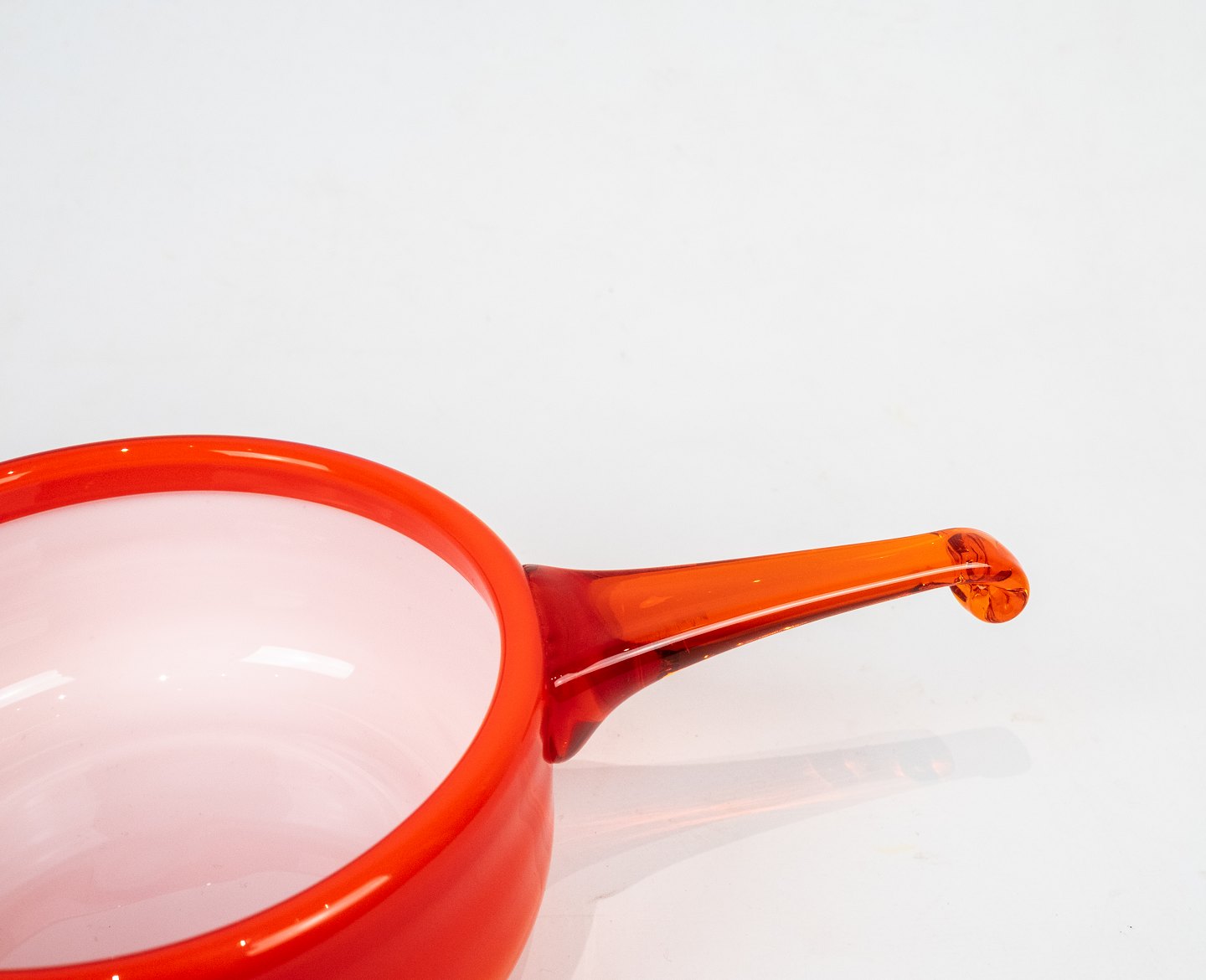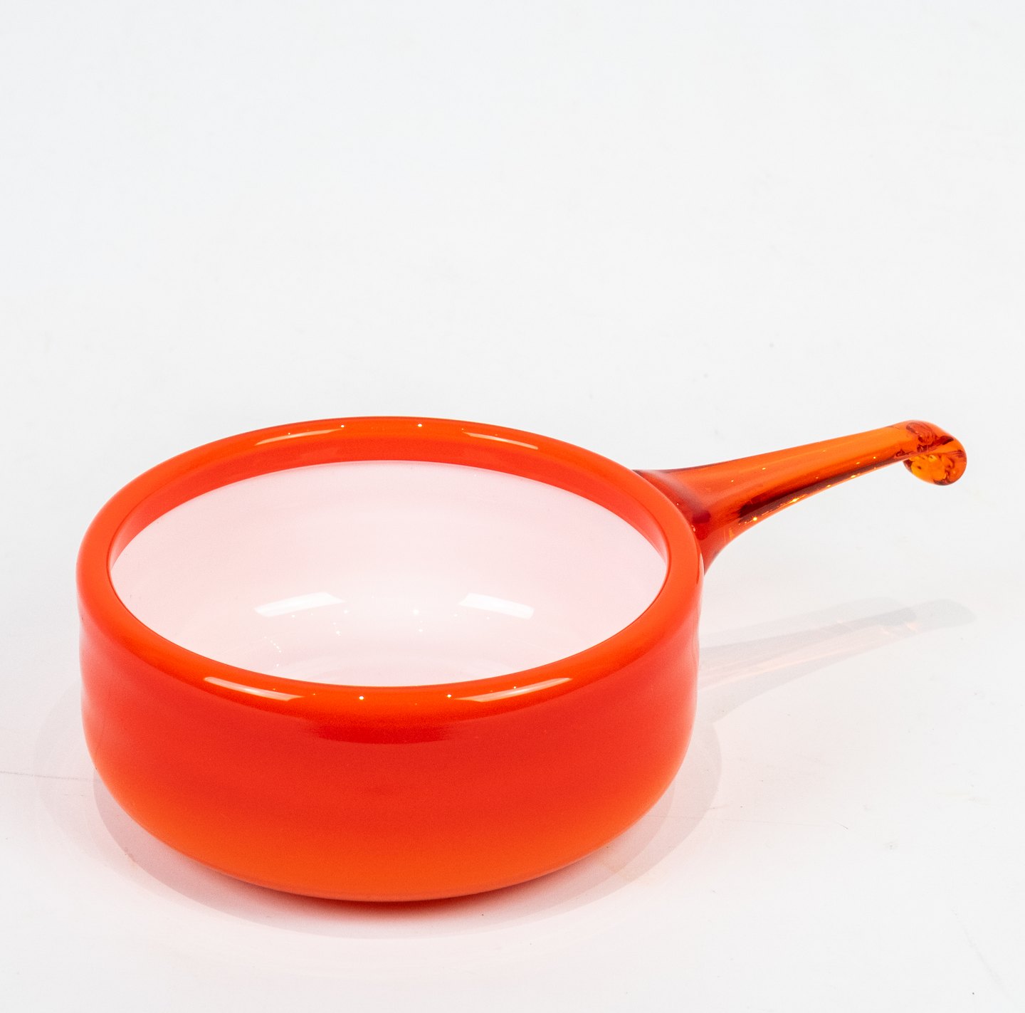 SoldRed glass bowl with handle and white opaline glass on the inside from the Palet series by Michael Bang for Holmegaard.
