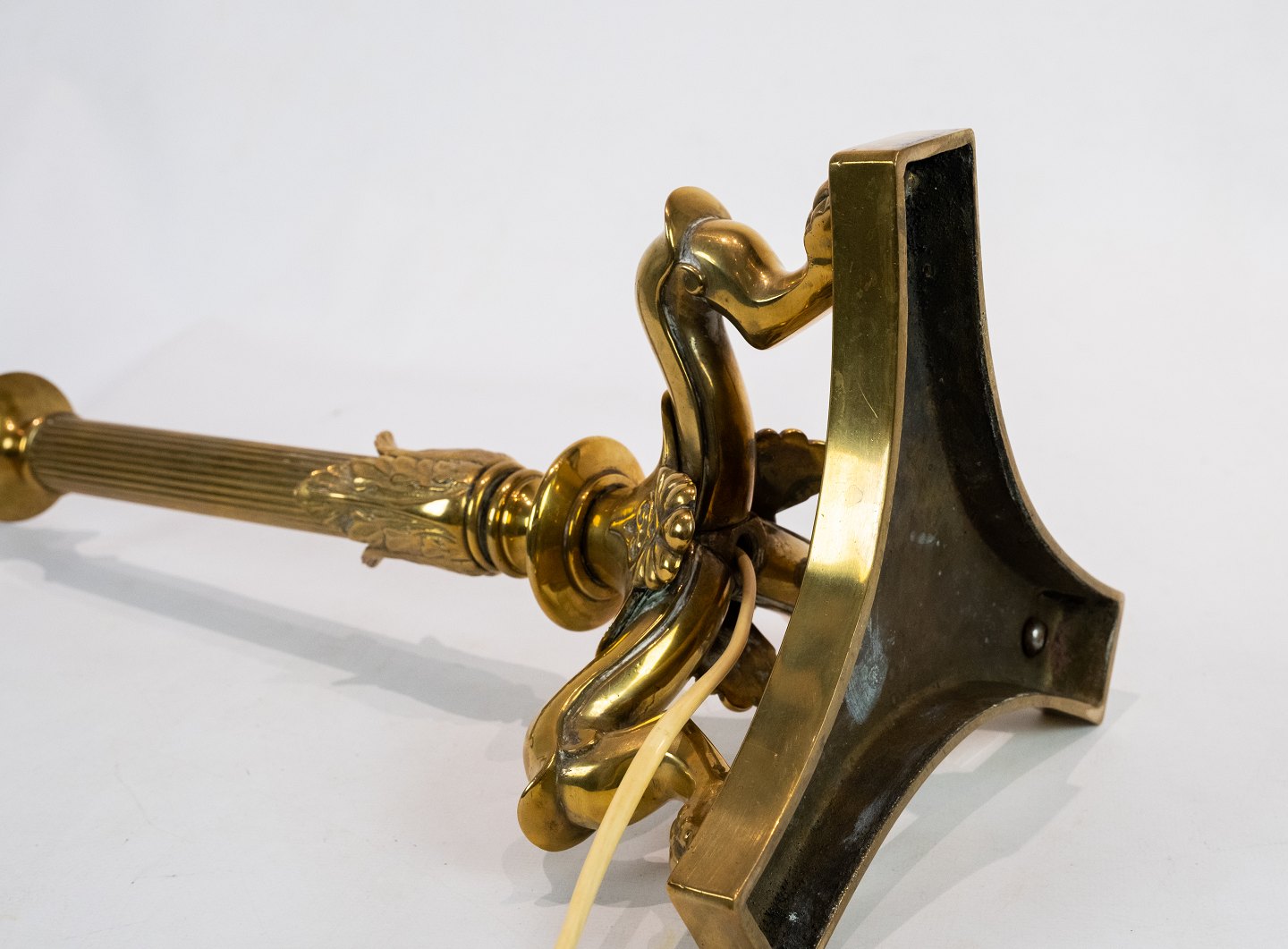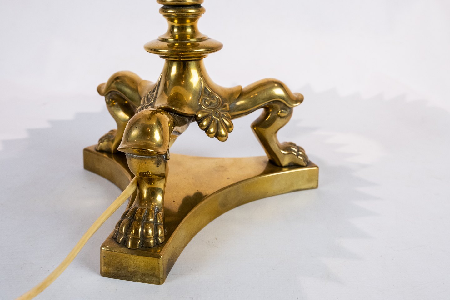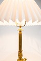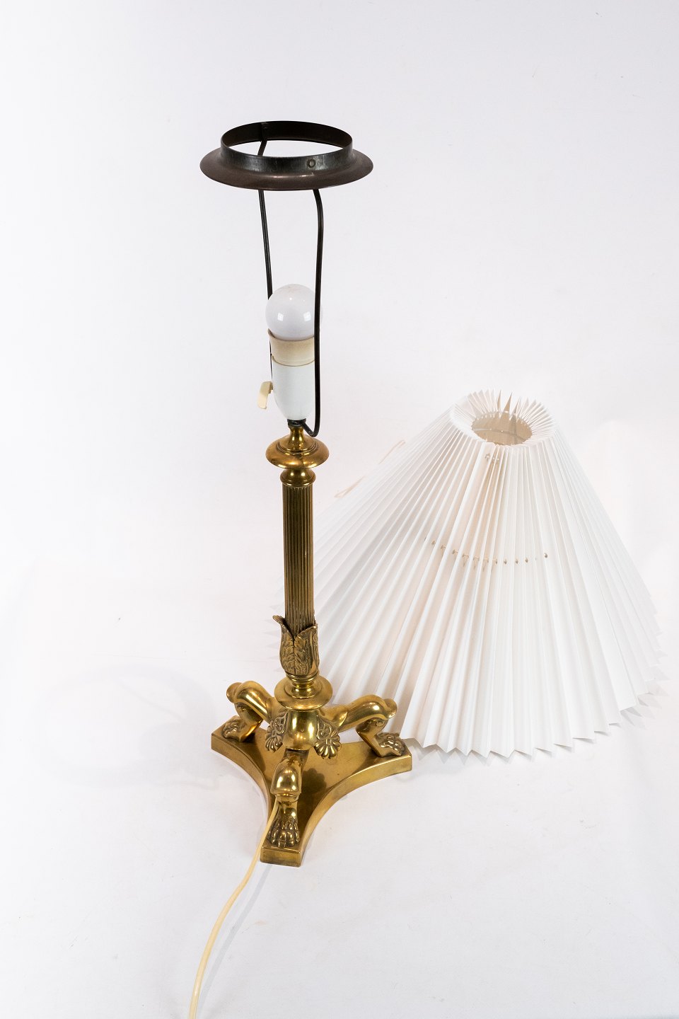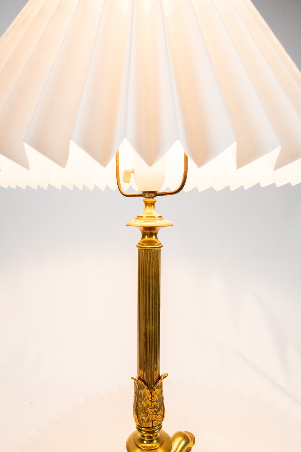 SoldTall tablelamp in polished brass with beautifully decorated tripod stand from the 1920s. The shade is handpainted and hand folded in paper.
