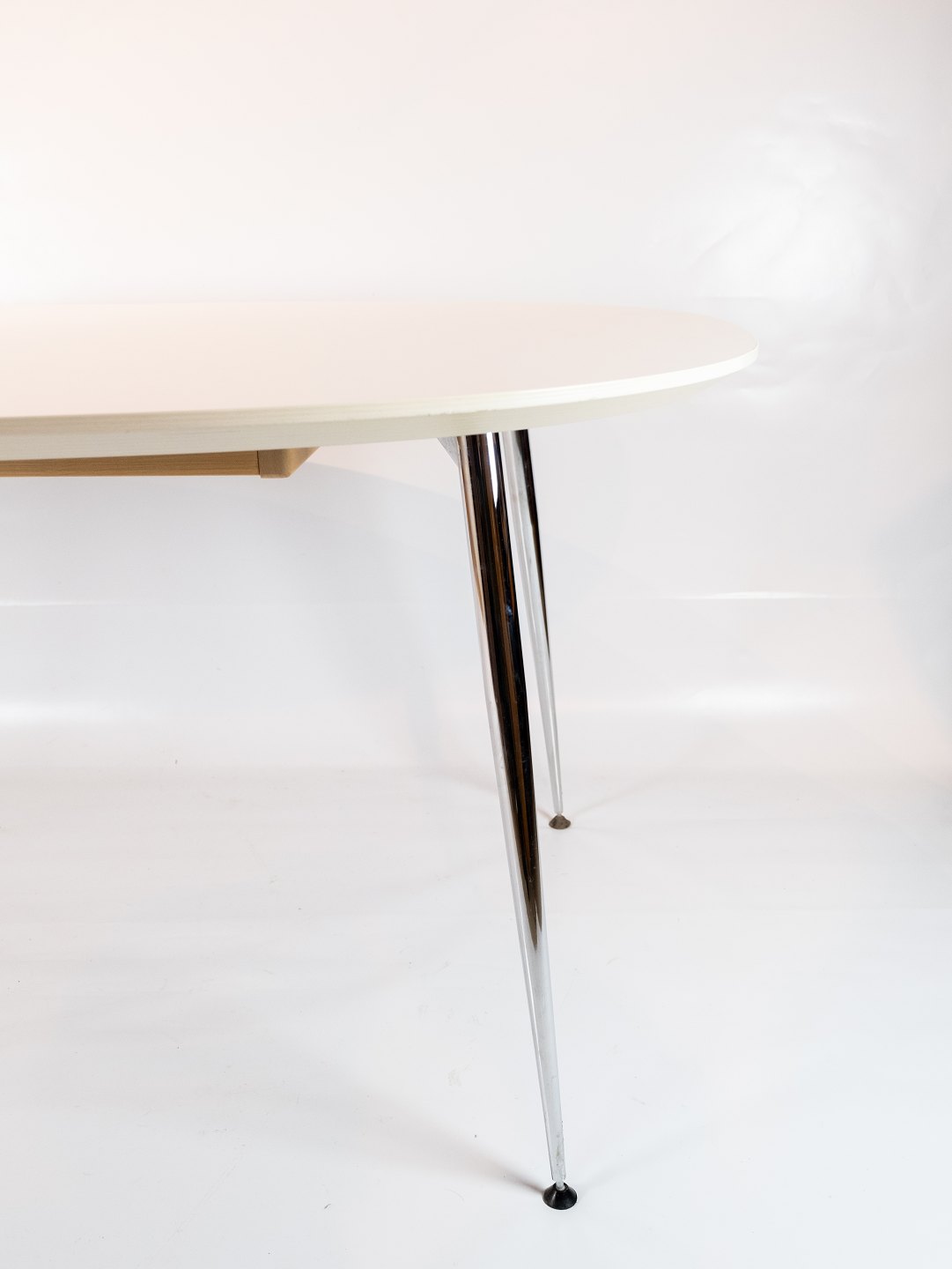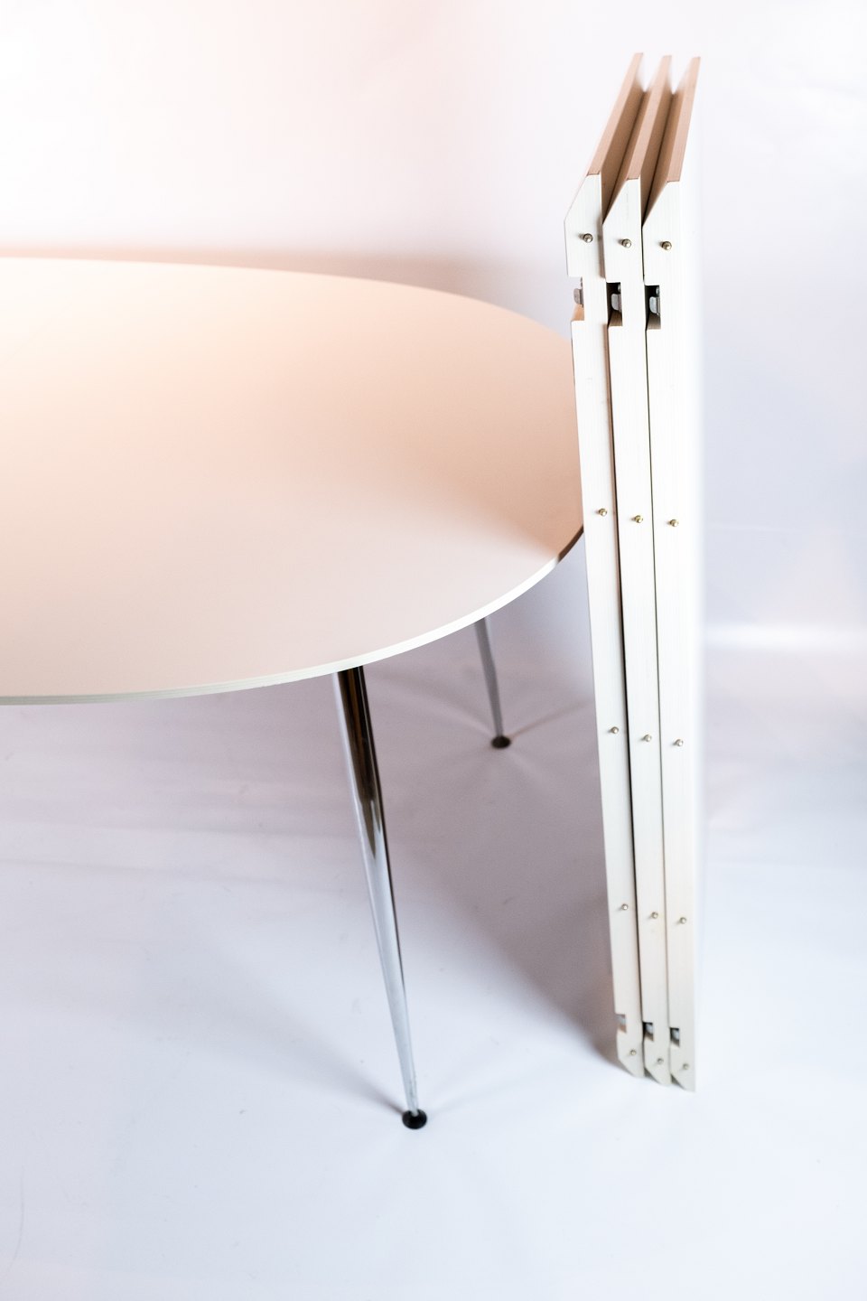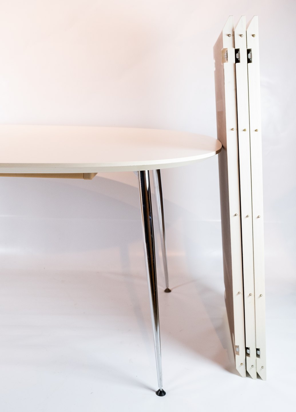 SoldDining table in white laminate of danish design manufactured by Zeta Furniture. The table is in great used condition.