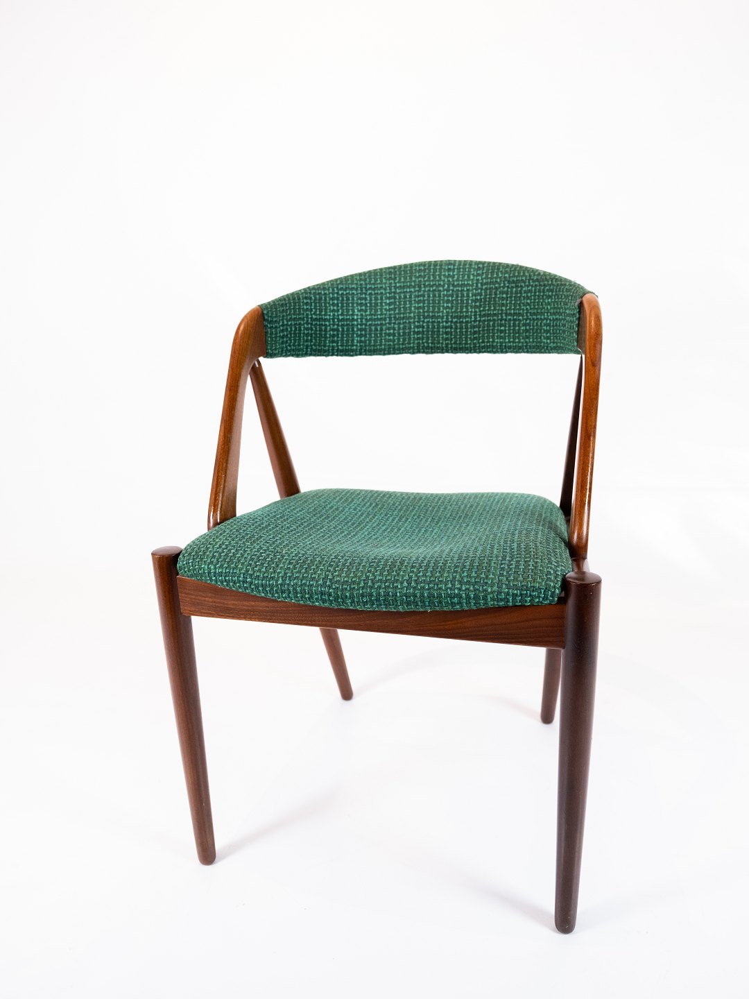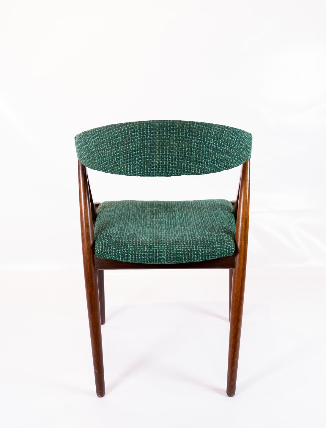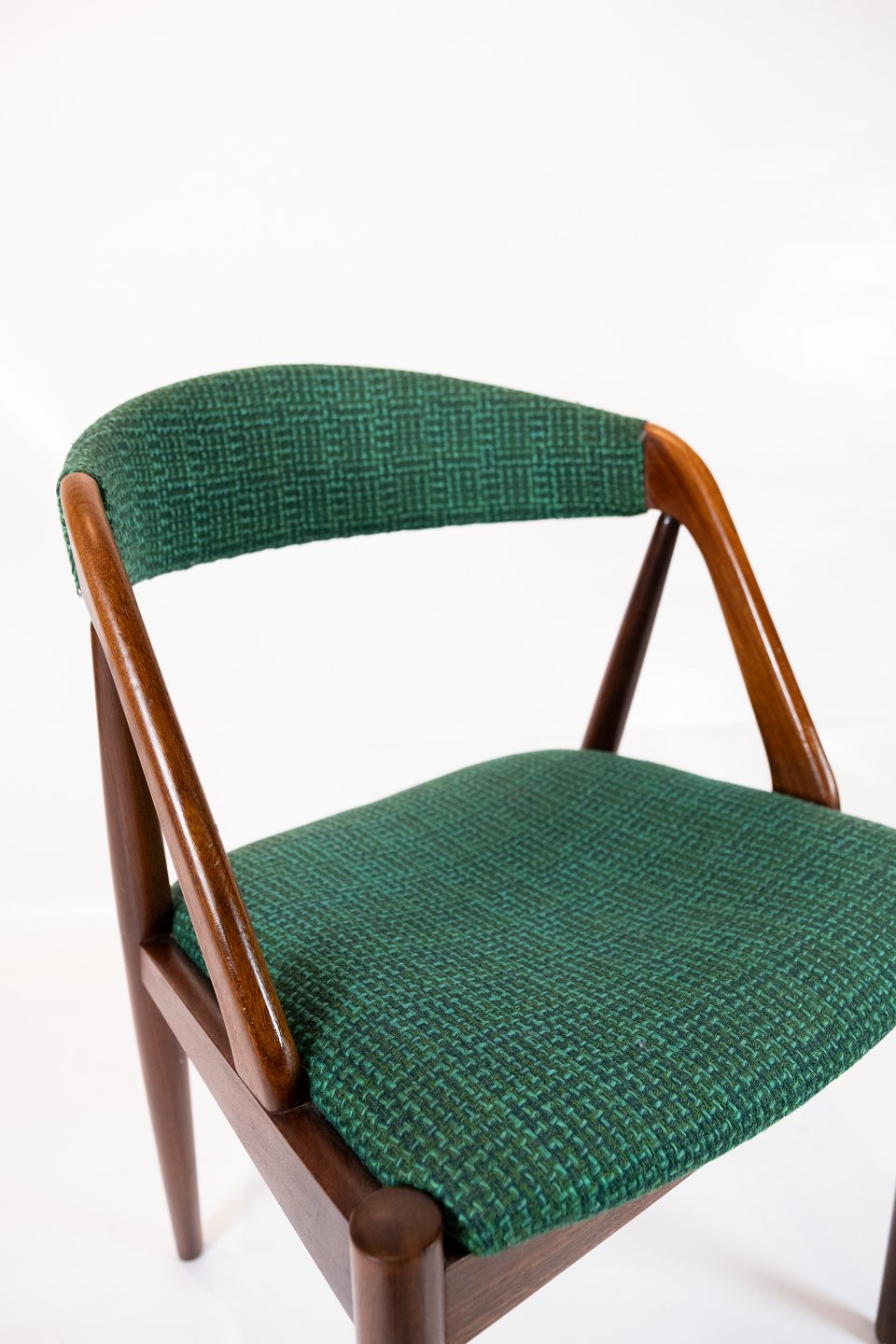 A set of six dining room chairs, model 31, designed by Kai Kristiansen in 1956 and manufactured by Schou Andersen in the 1960s. The chairs are of teak and upholstered in dark green fabric.