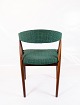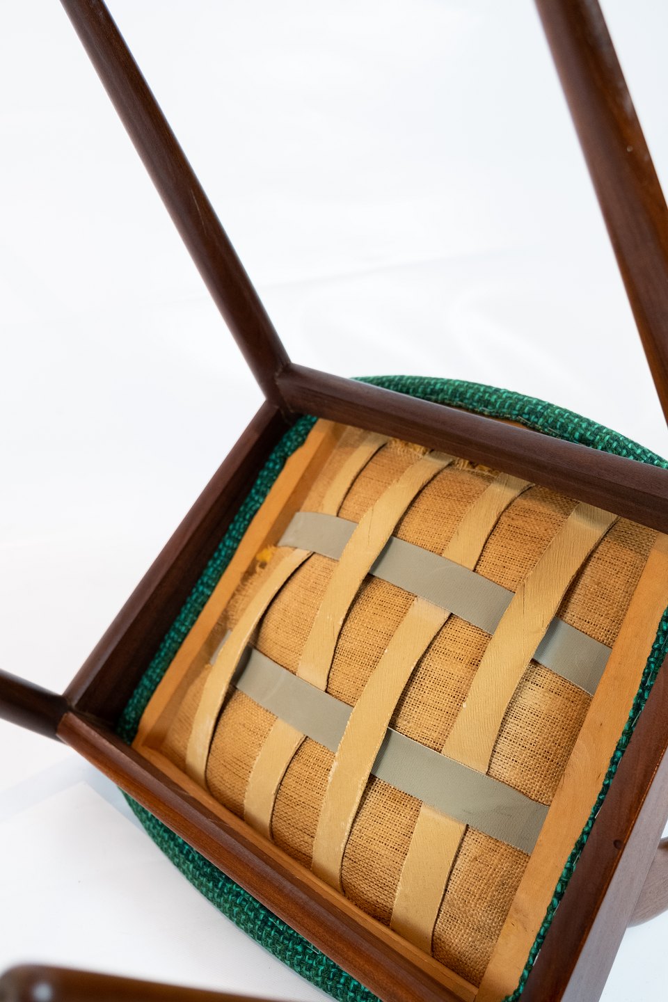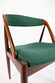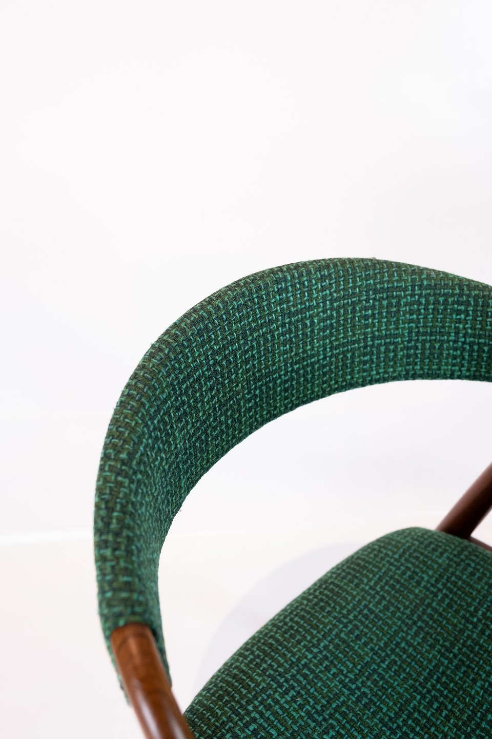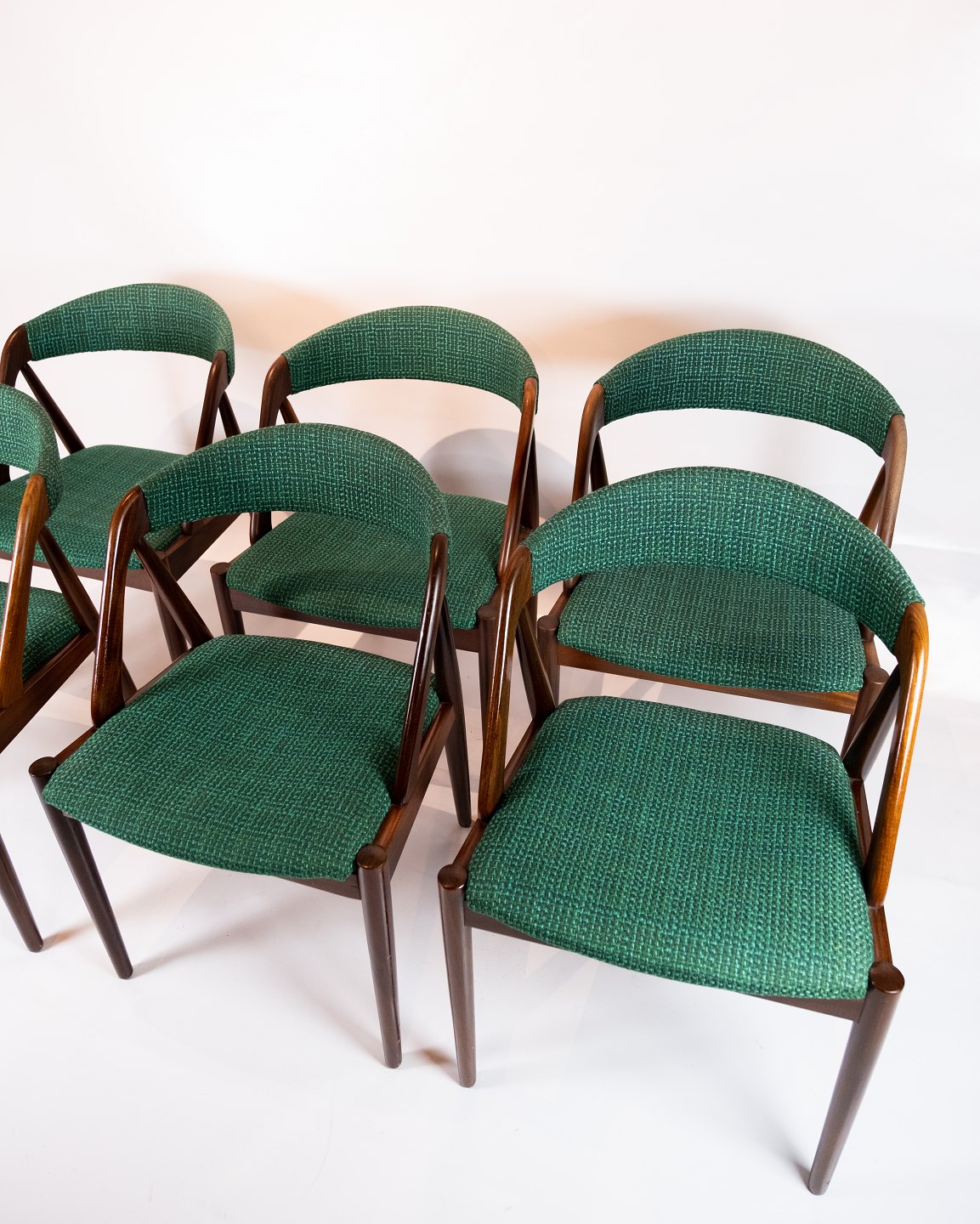 A set of six dining room chairs, model 31, designed by Kai Kristiansen in 1956 and manufactured by Schou Andersen in the 1960s. The chairs are of teak and upholstered in dark green fabric.