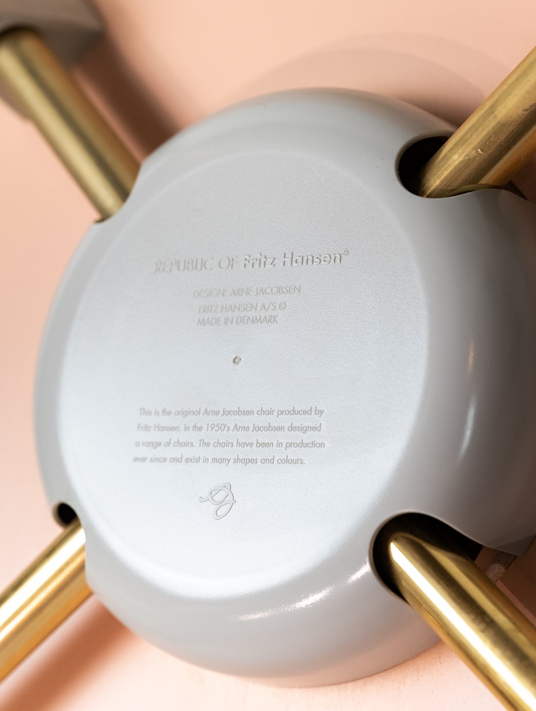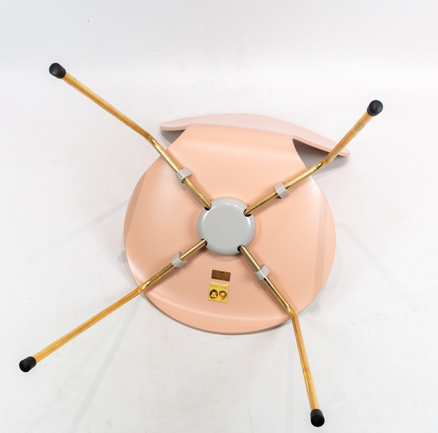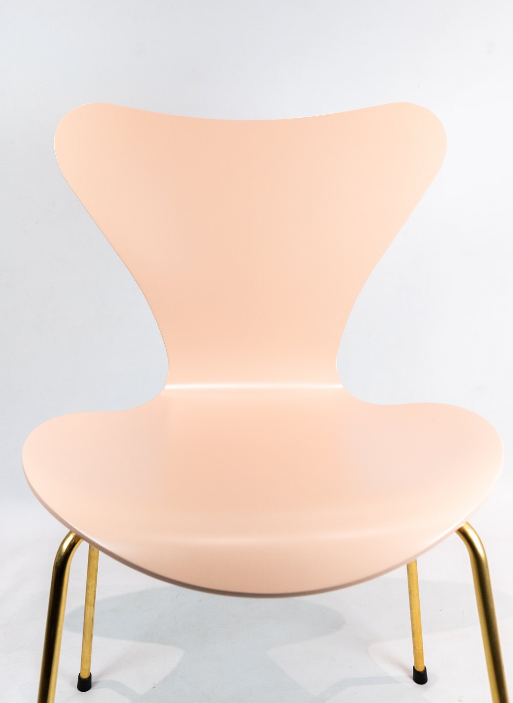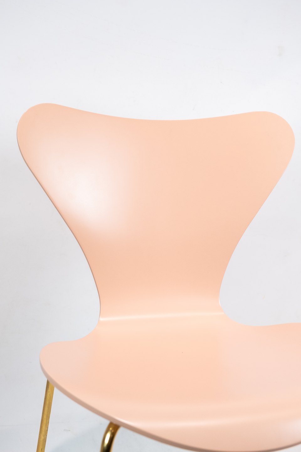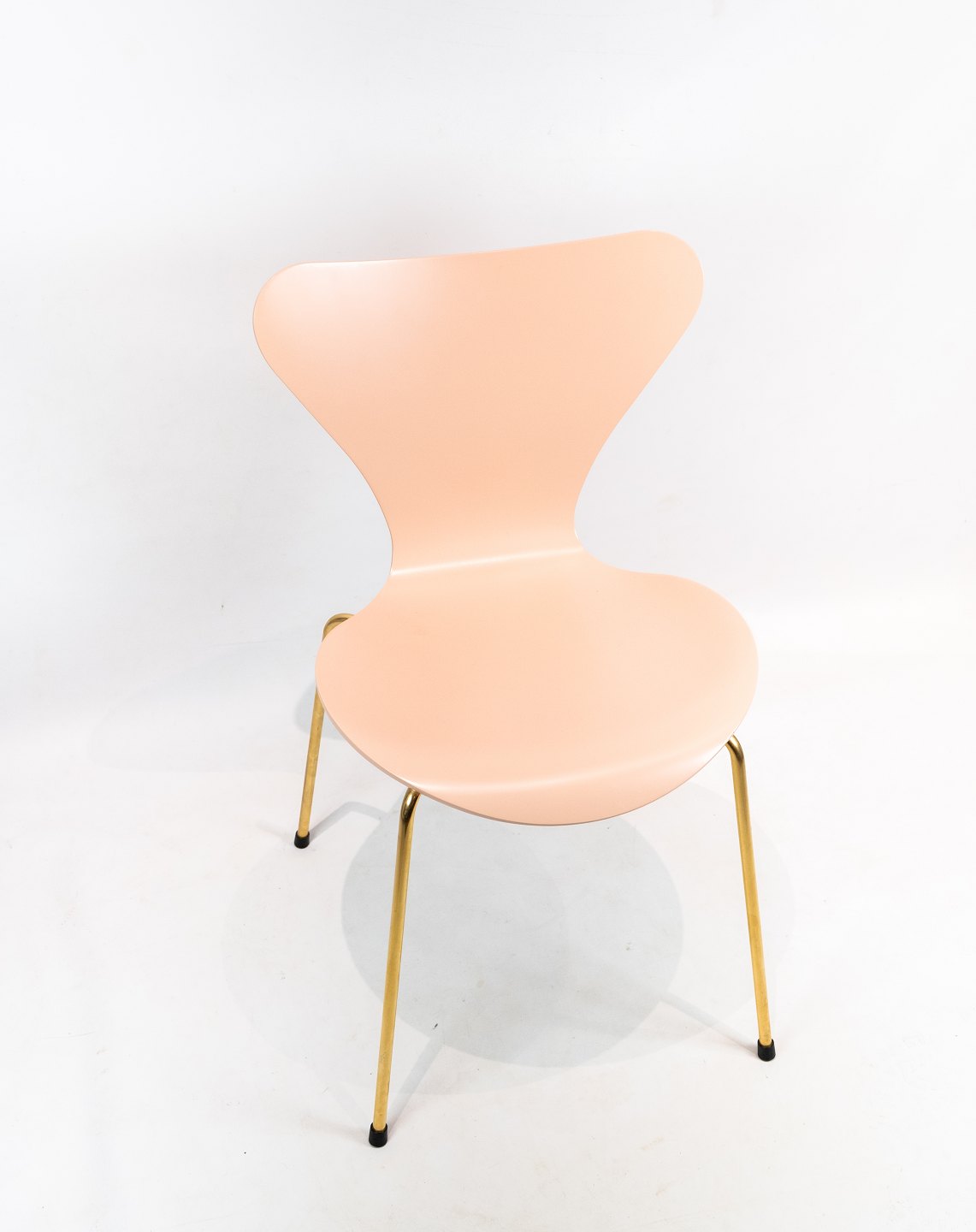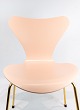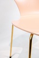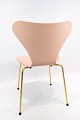 SolgtSyver stol, model 3107, designet af Arne Jacobsen og fremstillet hos Fritz Hansen i 2015 i anledning af stolen 60 års jubilæum. Stolen er lakeret rosa, med messing farvet stel og serienummer 6819.
