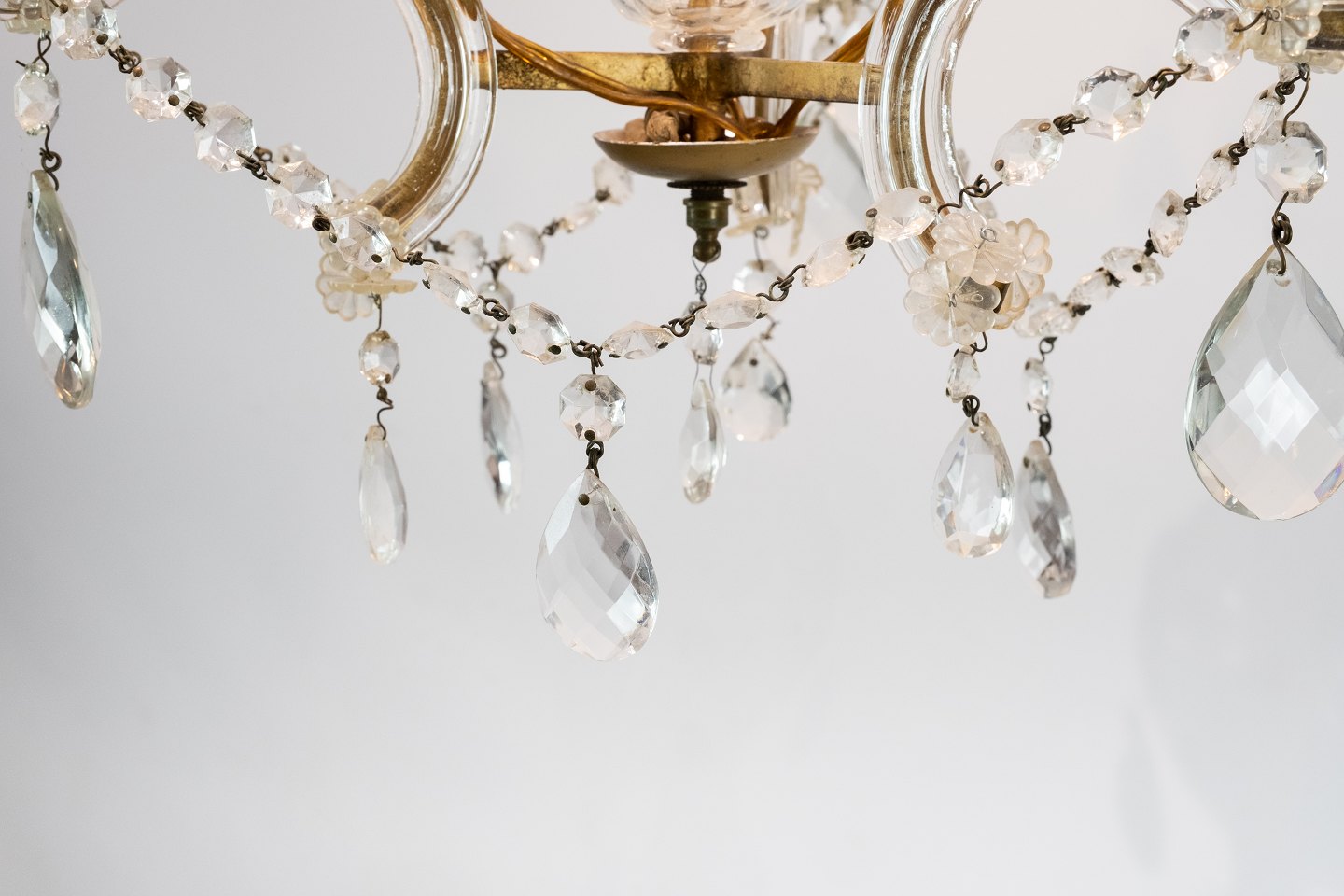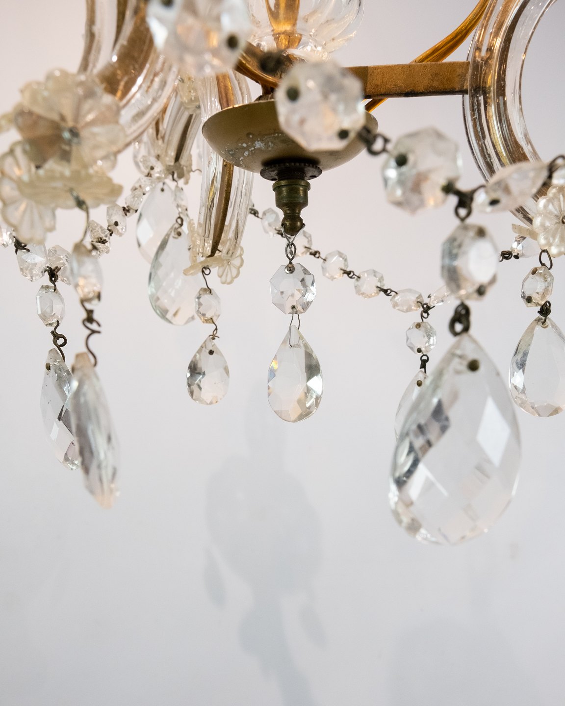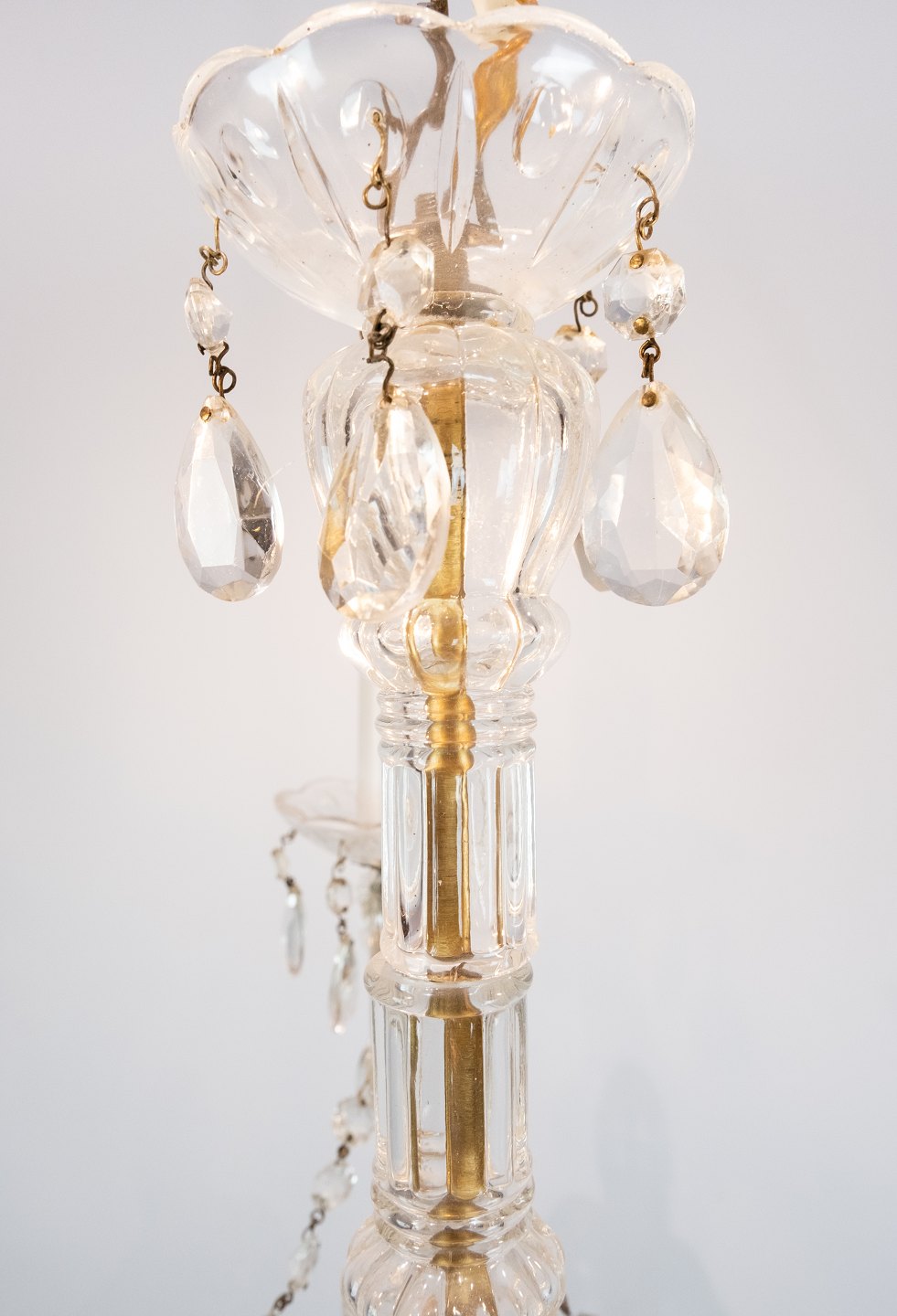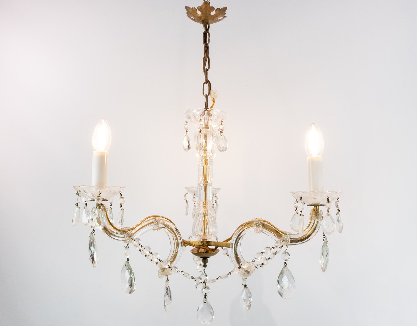 SolgtPrismekrone af messing med tre arme, kronen er i flot antik stand.