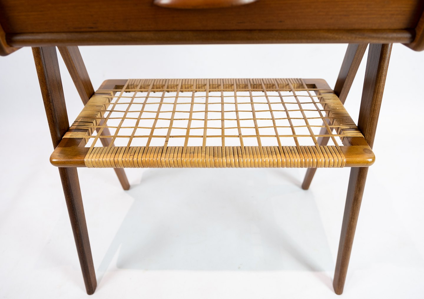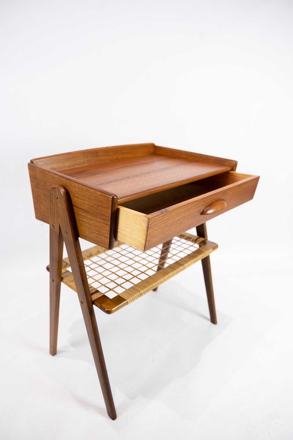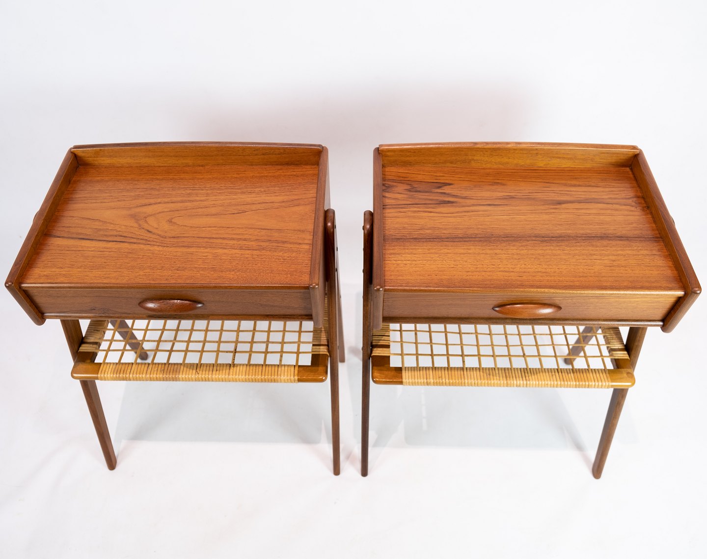 A pair of side tables in teak with paper cord shelf of danish design from the 1960s.