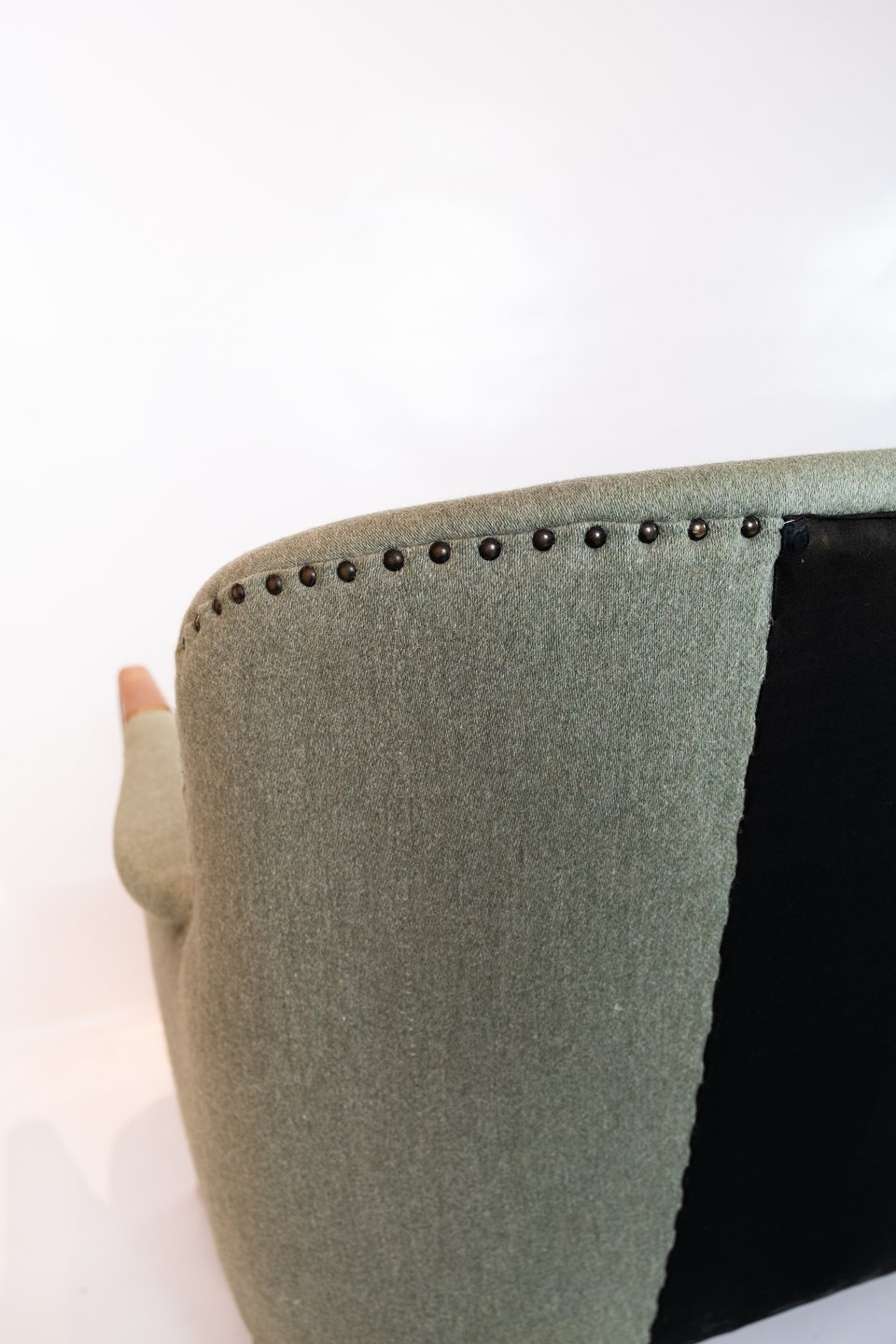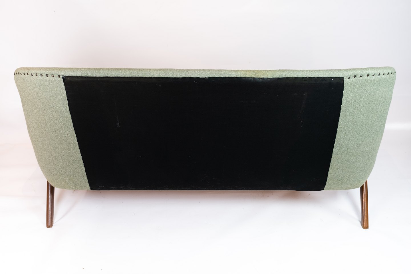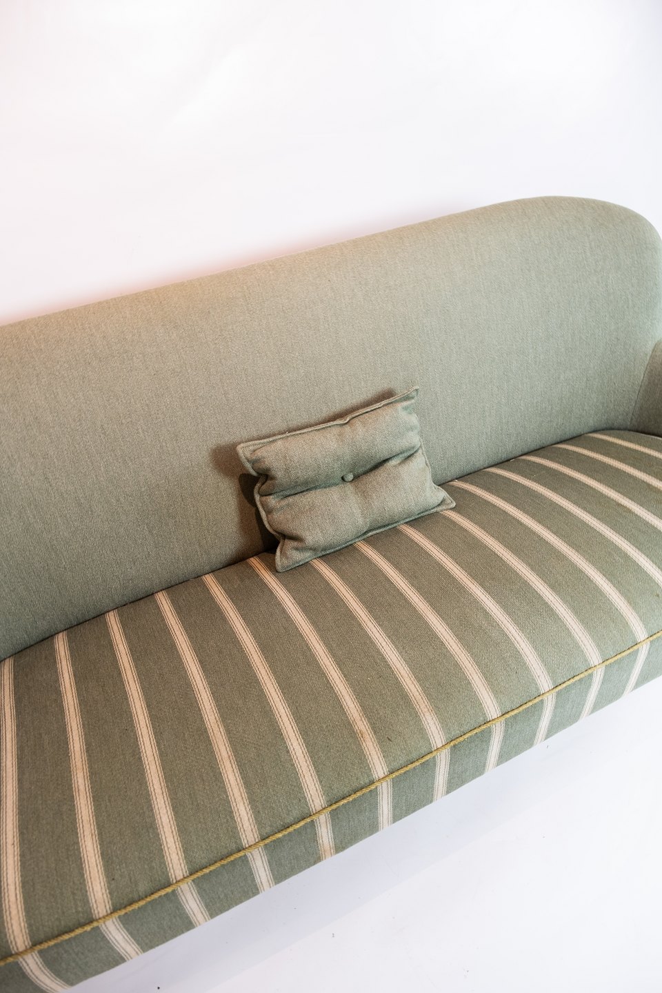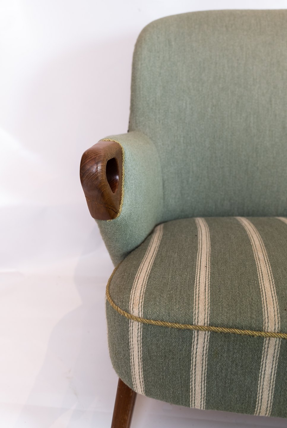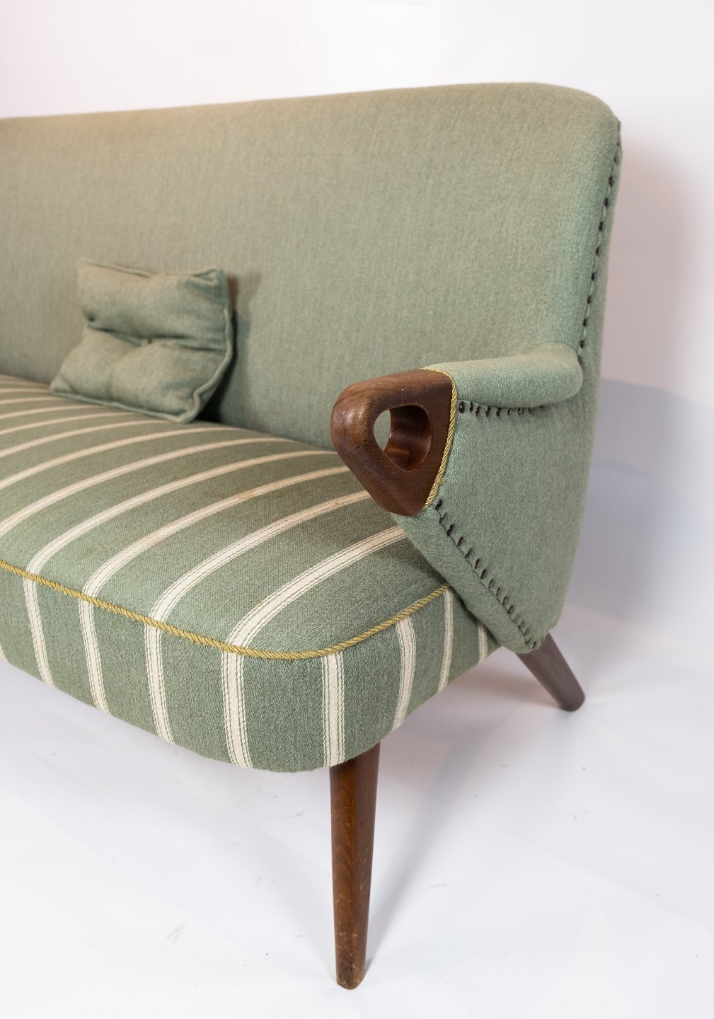 SolgtTo personers sofa polstret med lysegrønt stribet stof med teak ben og arme af dansk design fra 1960erne. Sofaen er i flot brugt stand.