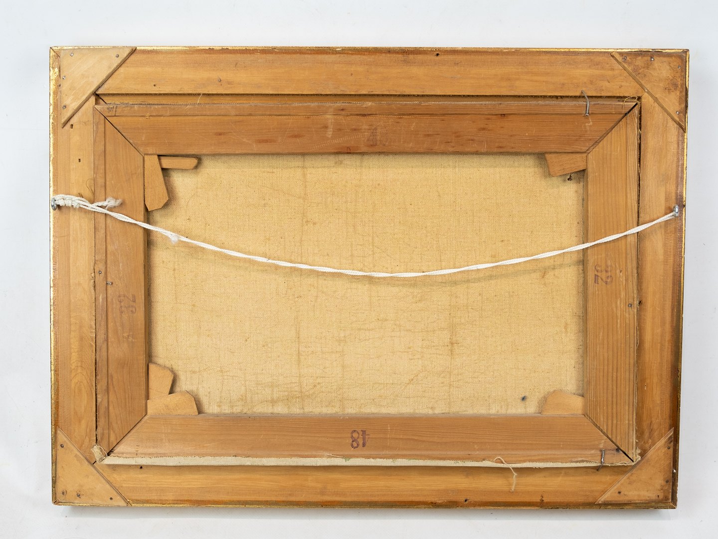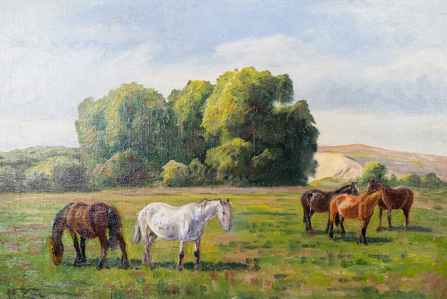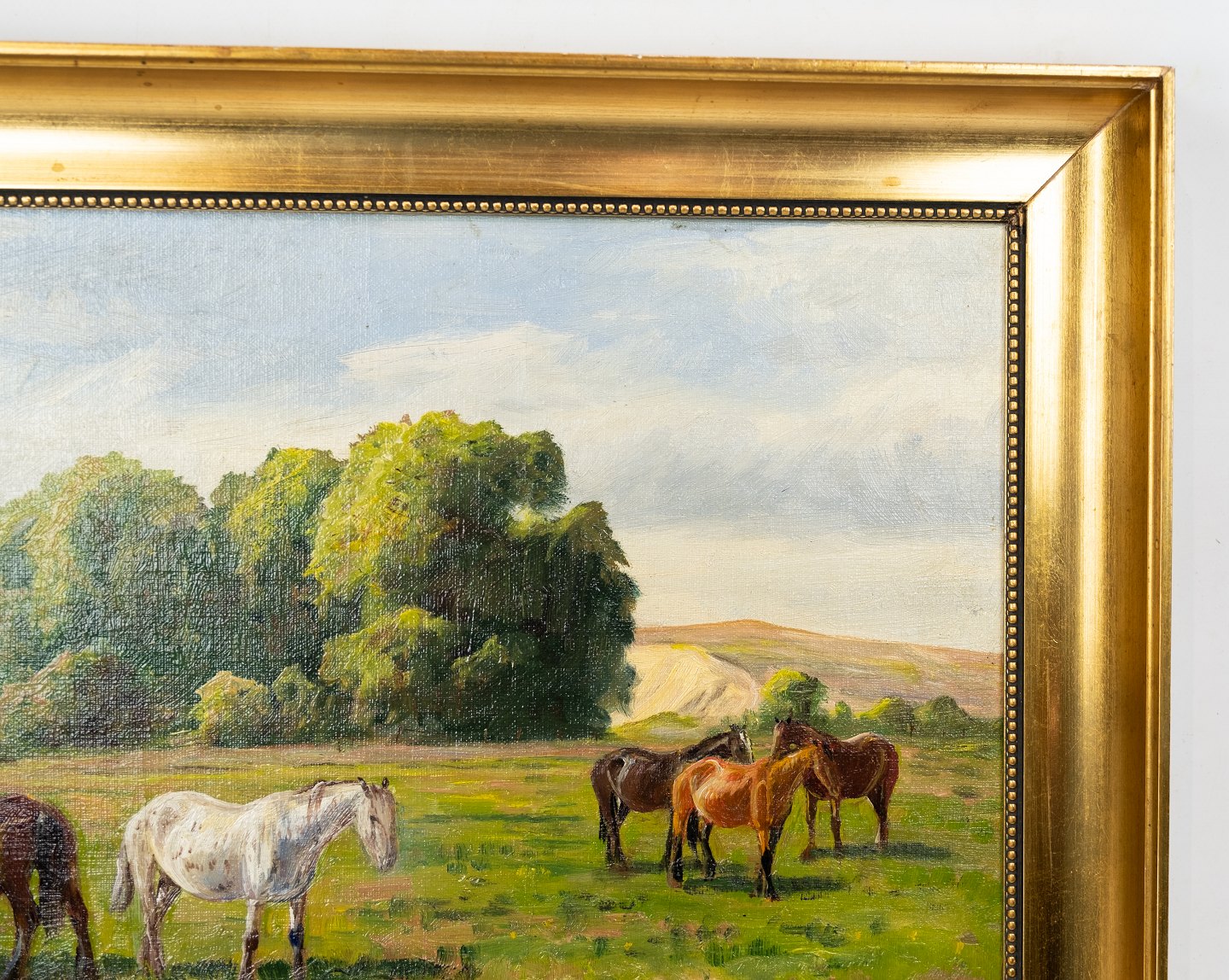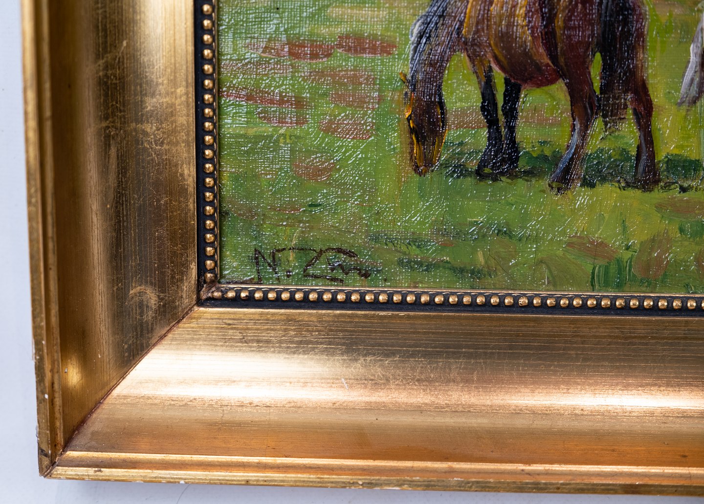 SoldOil painting with horse motif and gilded frame by Niels Christiansen (1873-1960).