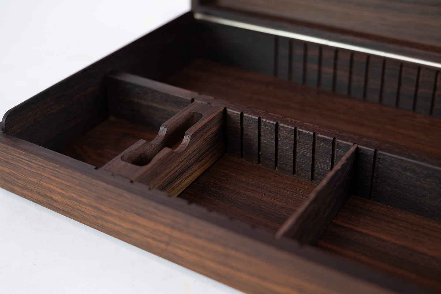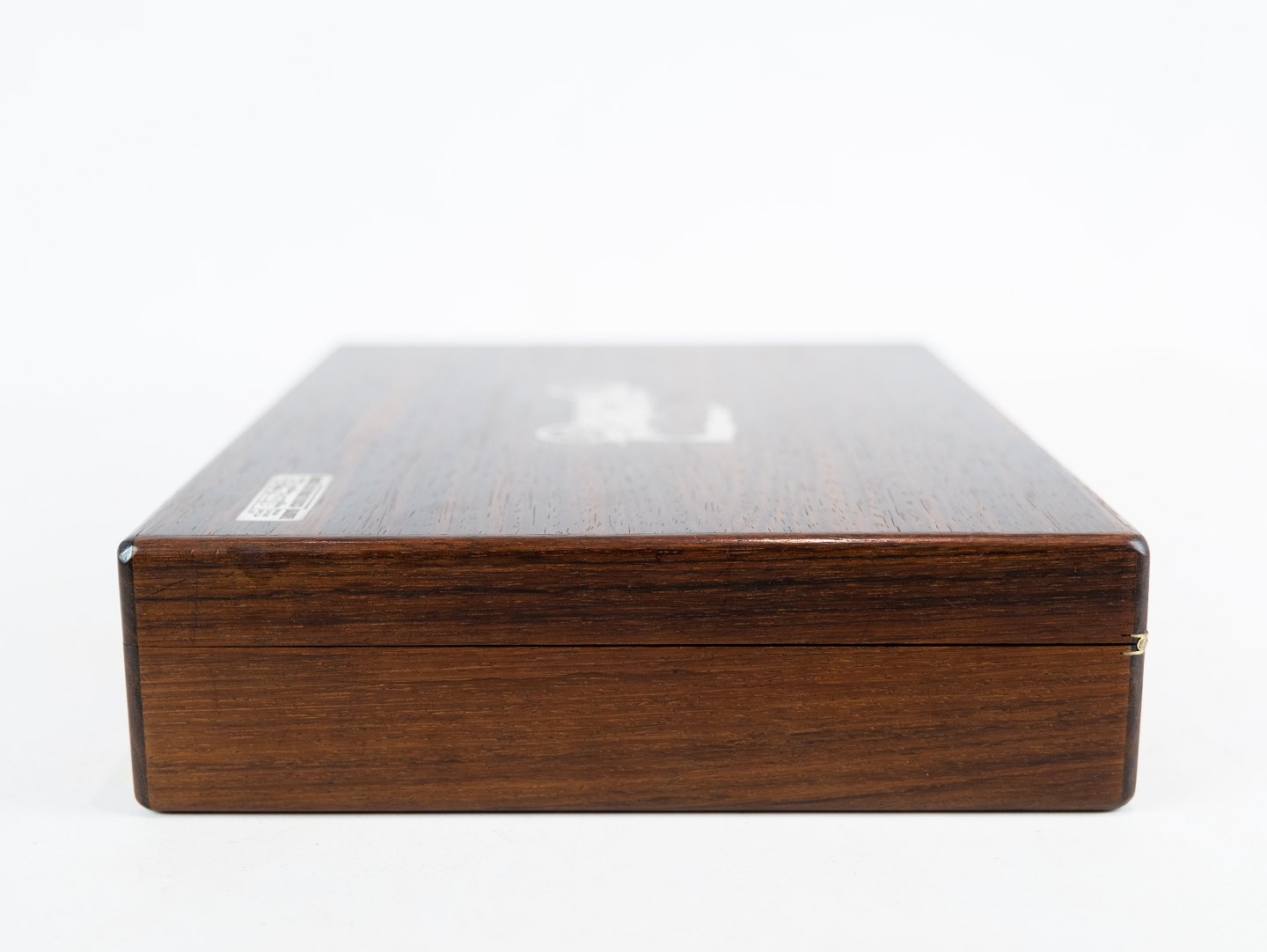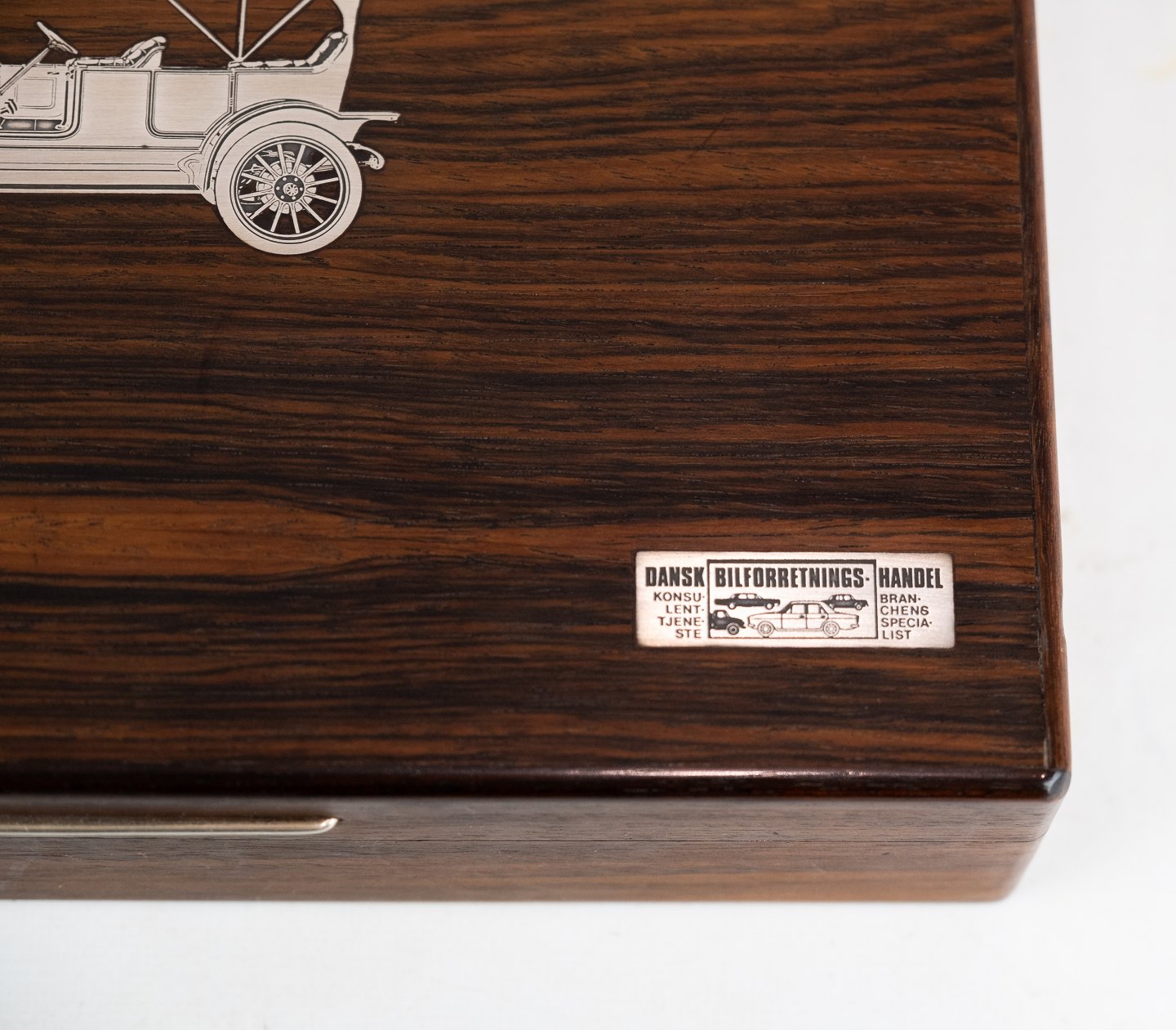 Large box in rosewood decorated with car motif, in great vintage condition.
