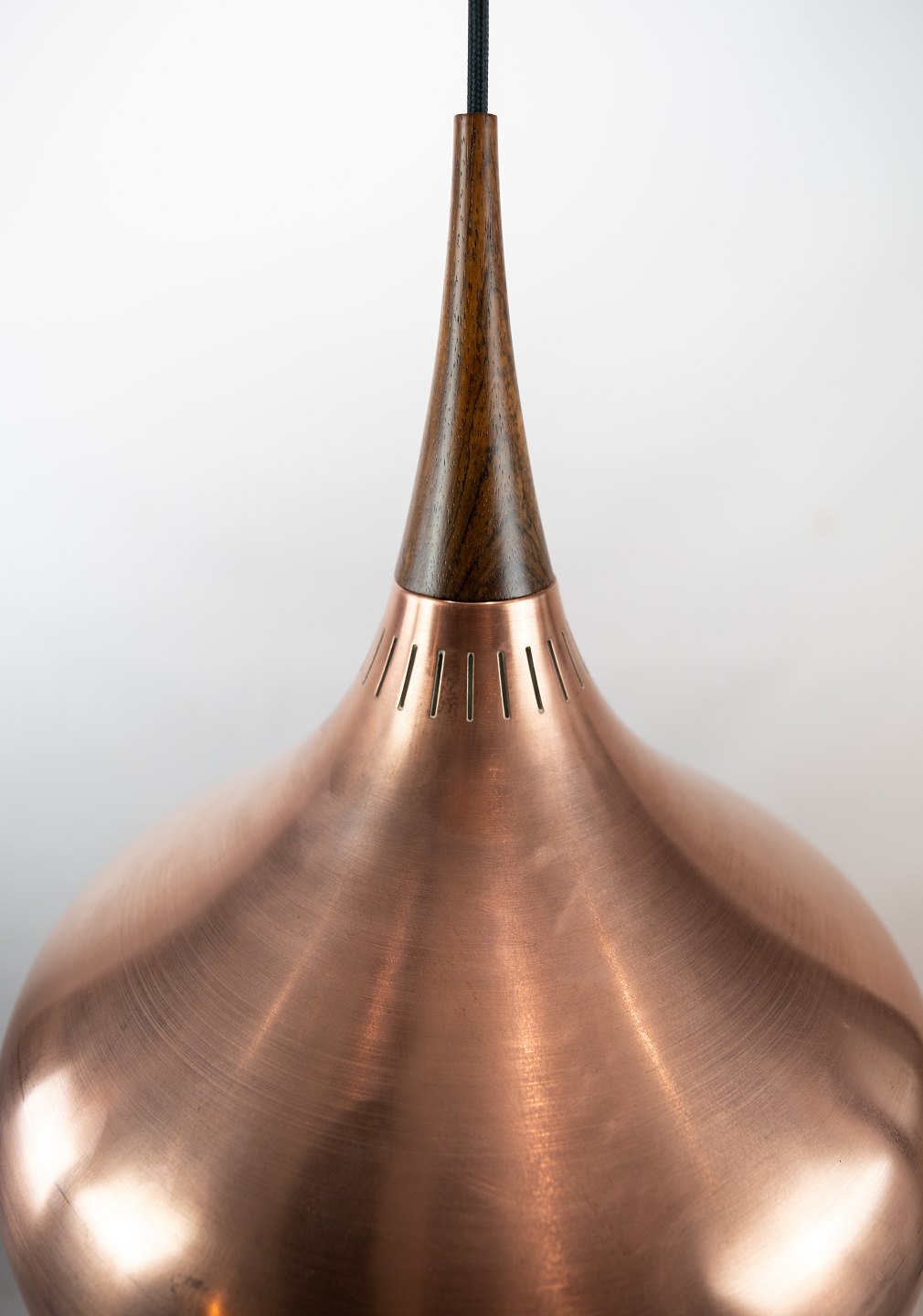 SolgtOrient pendel, model P2, designet af Jo Hammerborg for Fog og Mørup i Danmark i 1960erne. Lampen er af børstet kobber og palisander.