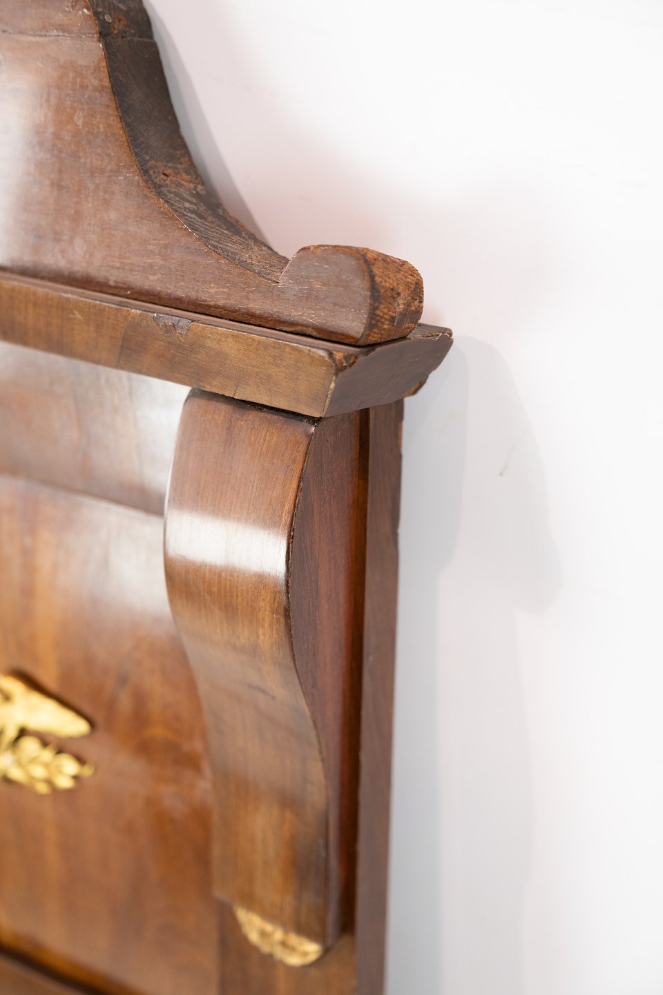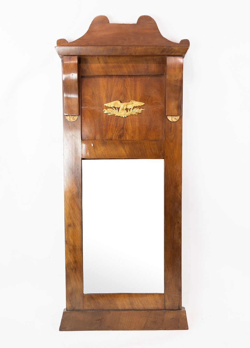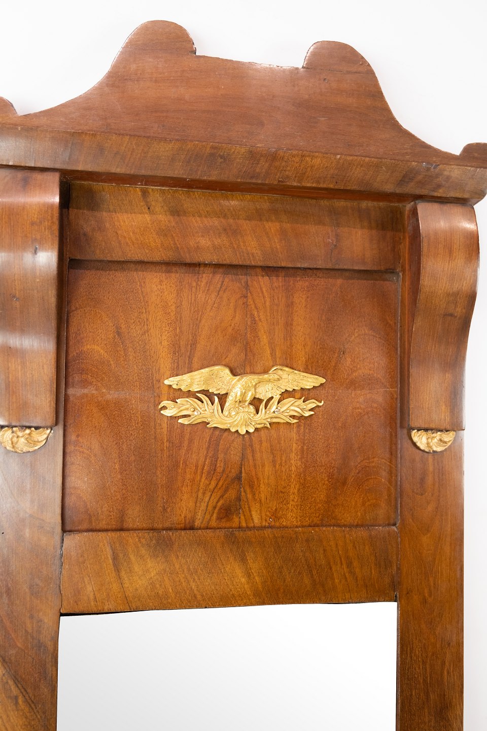 Spejlets mahogniramme, med sine delikate udskæringer og fine detaljer, vidner om den håndværksmæssige dygtighed og elegance fra senempire-perioden. Den varme tone og den skinnende finish på træet tilføjer en aura af luksus og raffinement til rummet, mens de gyldne blade giver et strejf af aristokratisk glamour.