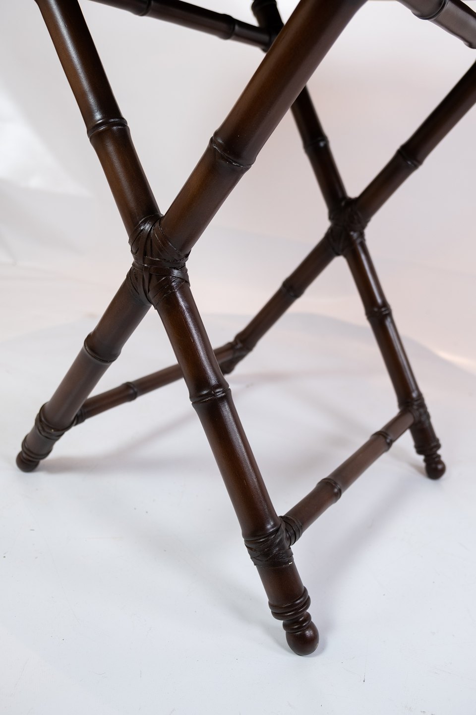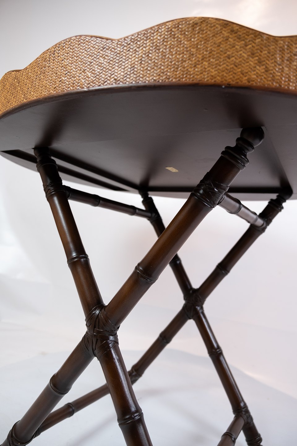Tray table in polished Wood and cord from the 1970s.The tray can be removed and the legs can be folded together.