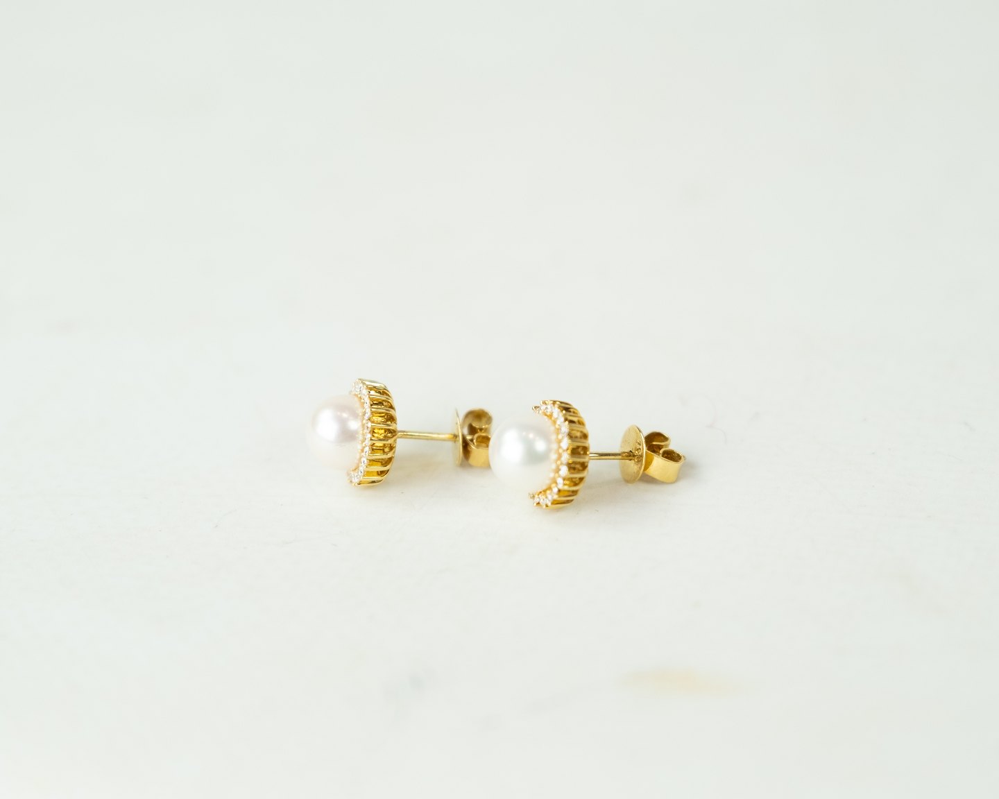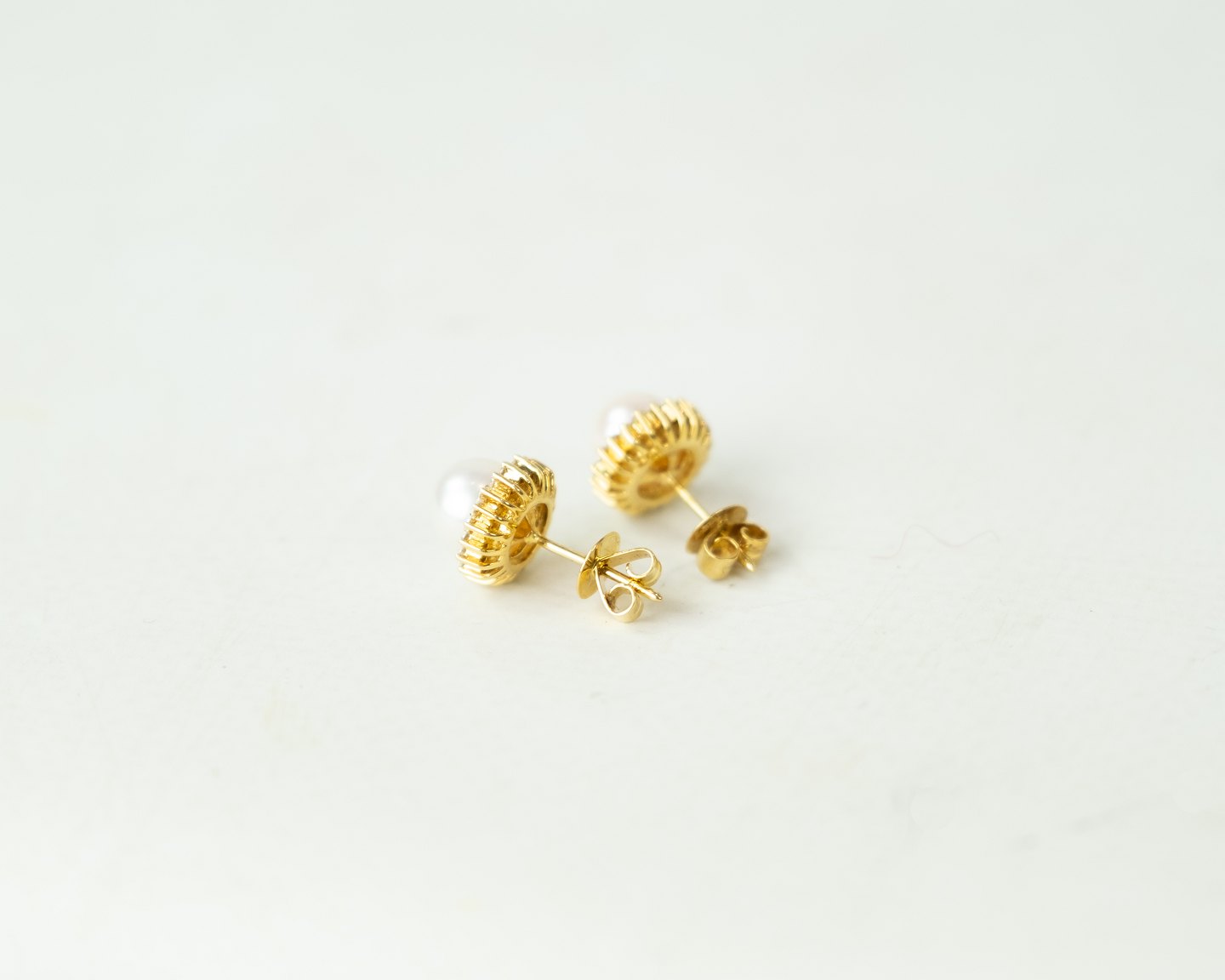 Sæt af øreringe af 18 karat guld med rosa kulturperle omkranset af 21 mindre diamanter.
