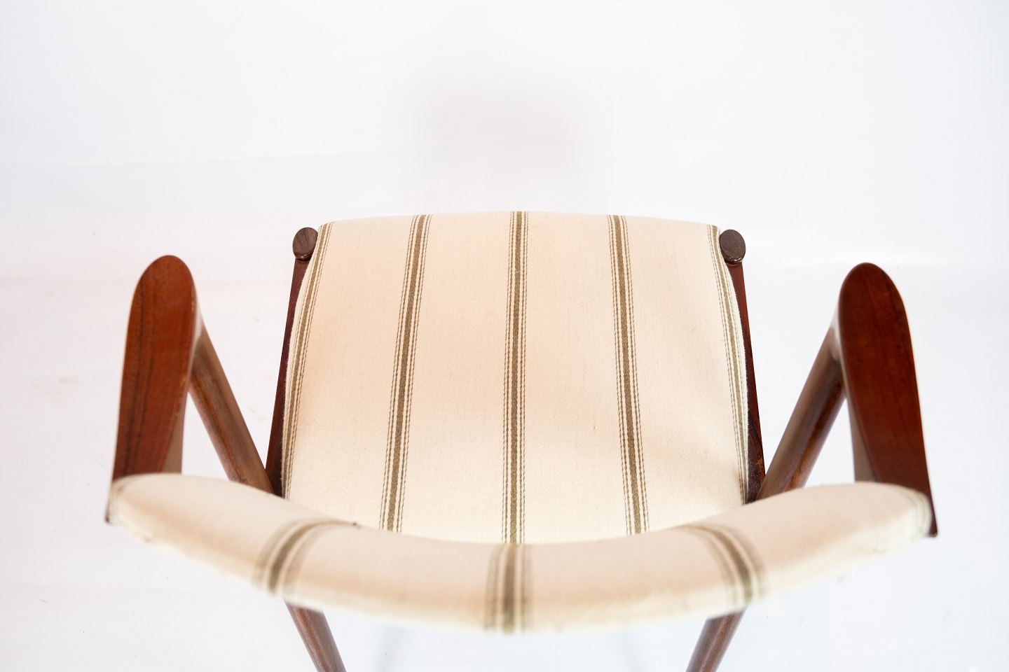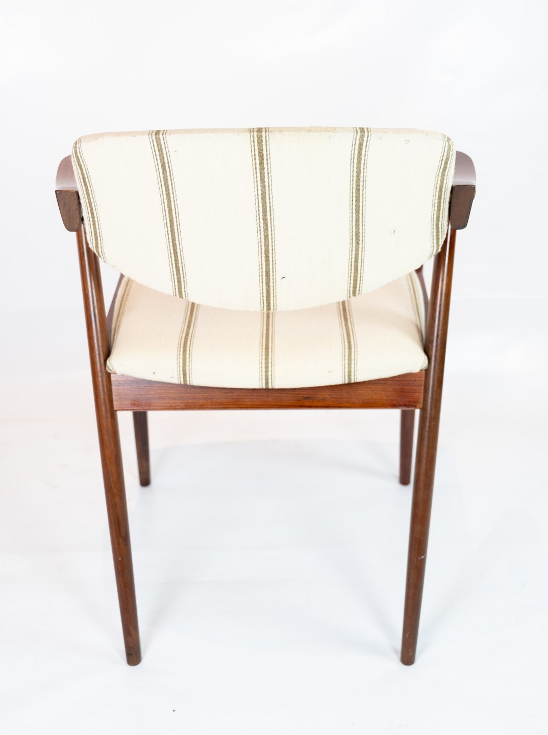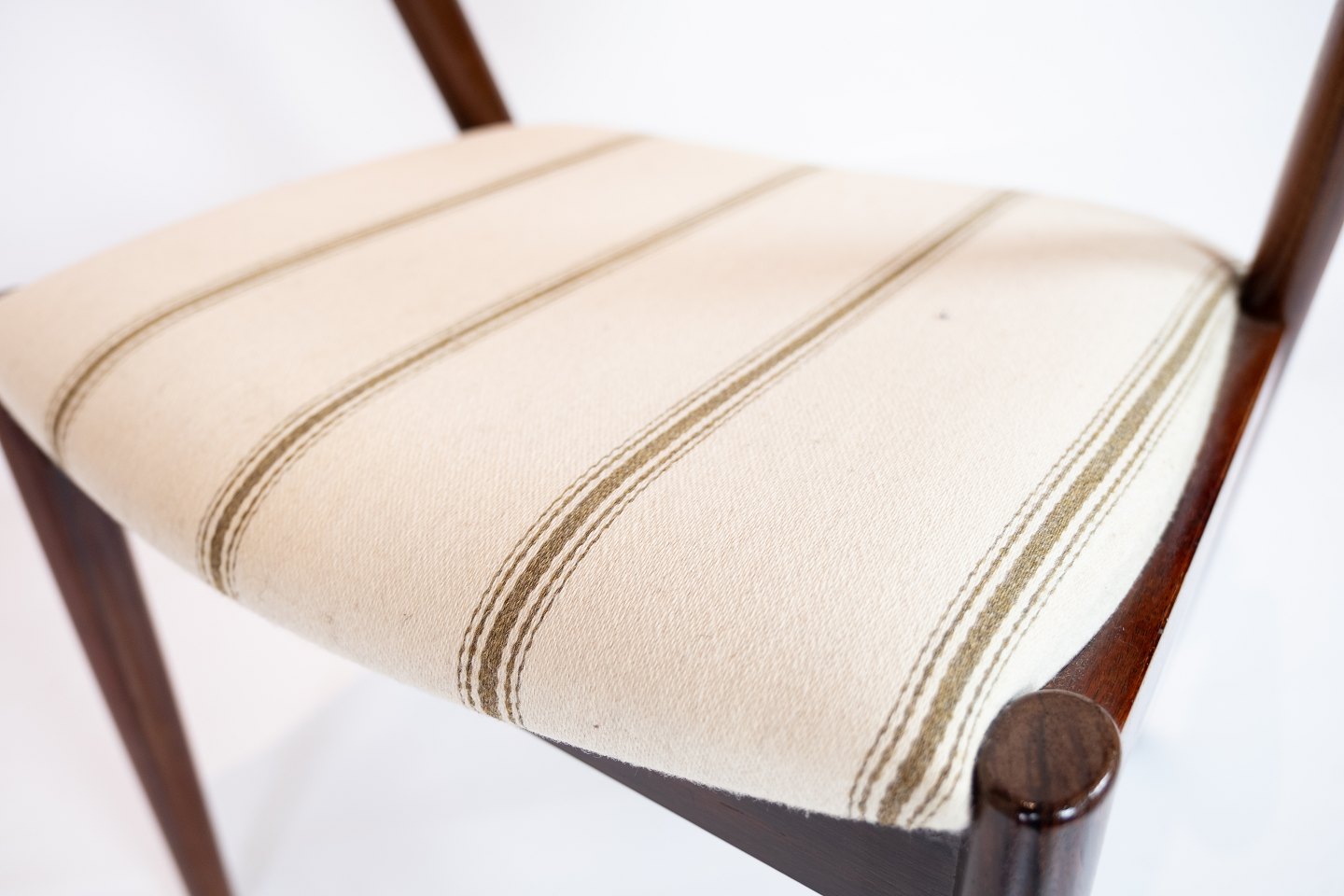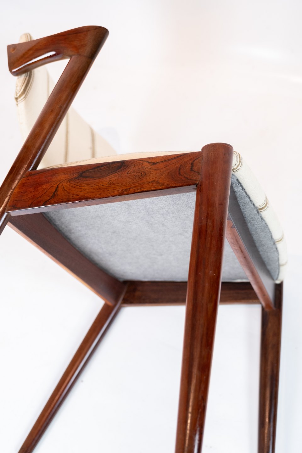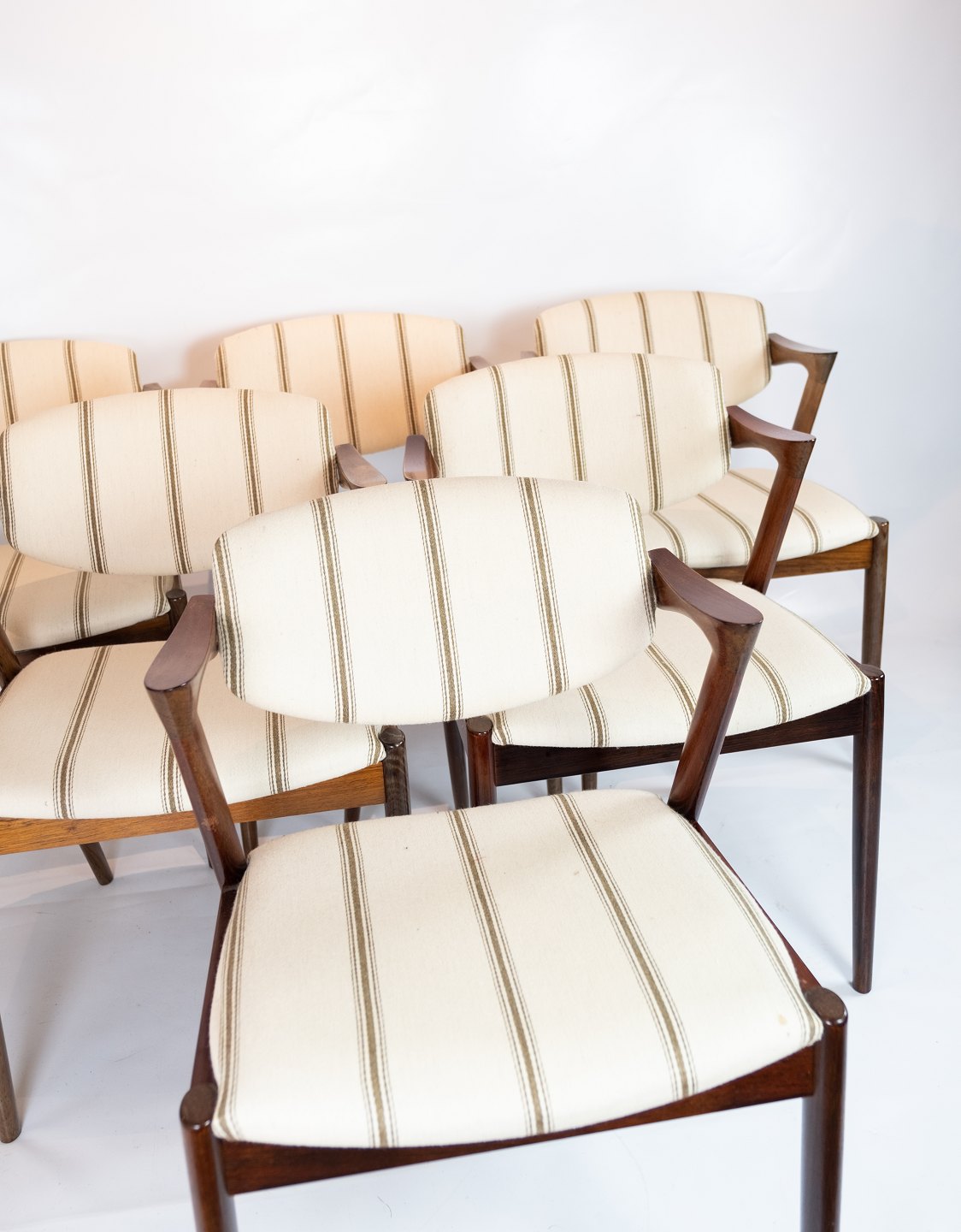 A set of 6 dining chairs, model 42, designed by Kai Kristiansen and manufactured by Schou Andersen in the 1960s. The chairs are of rosewood and upholstered in light wool fabric.