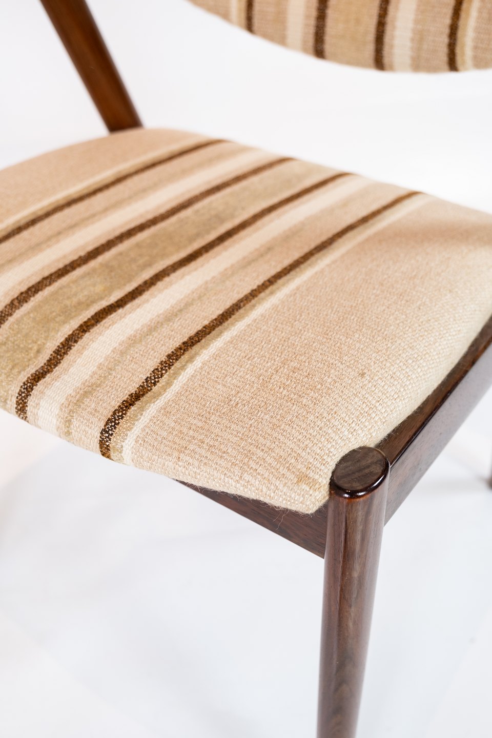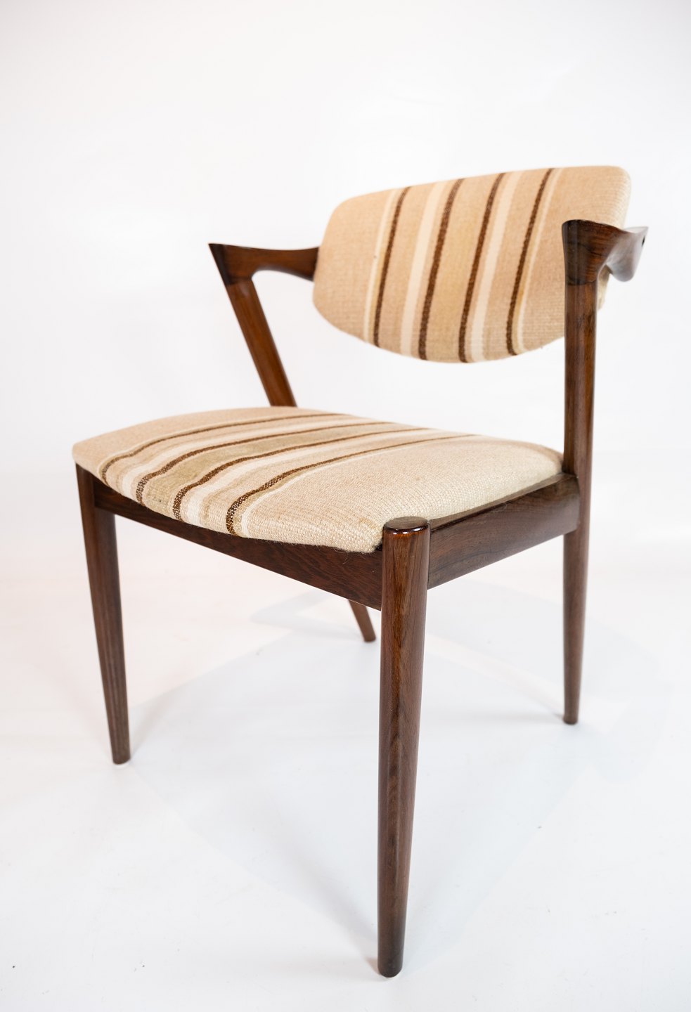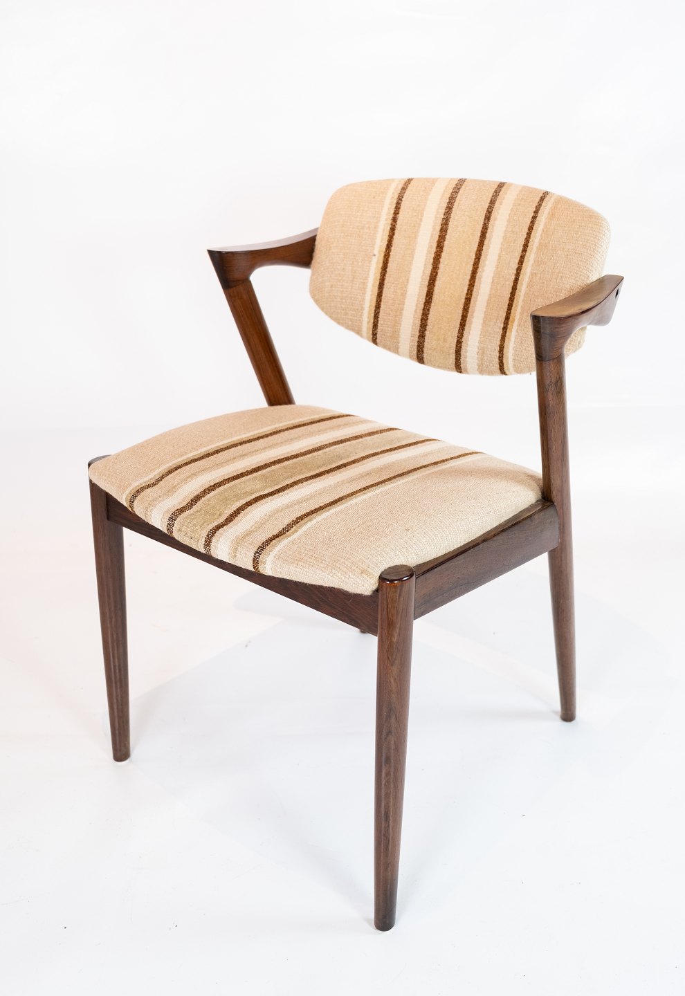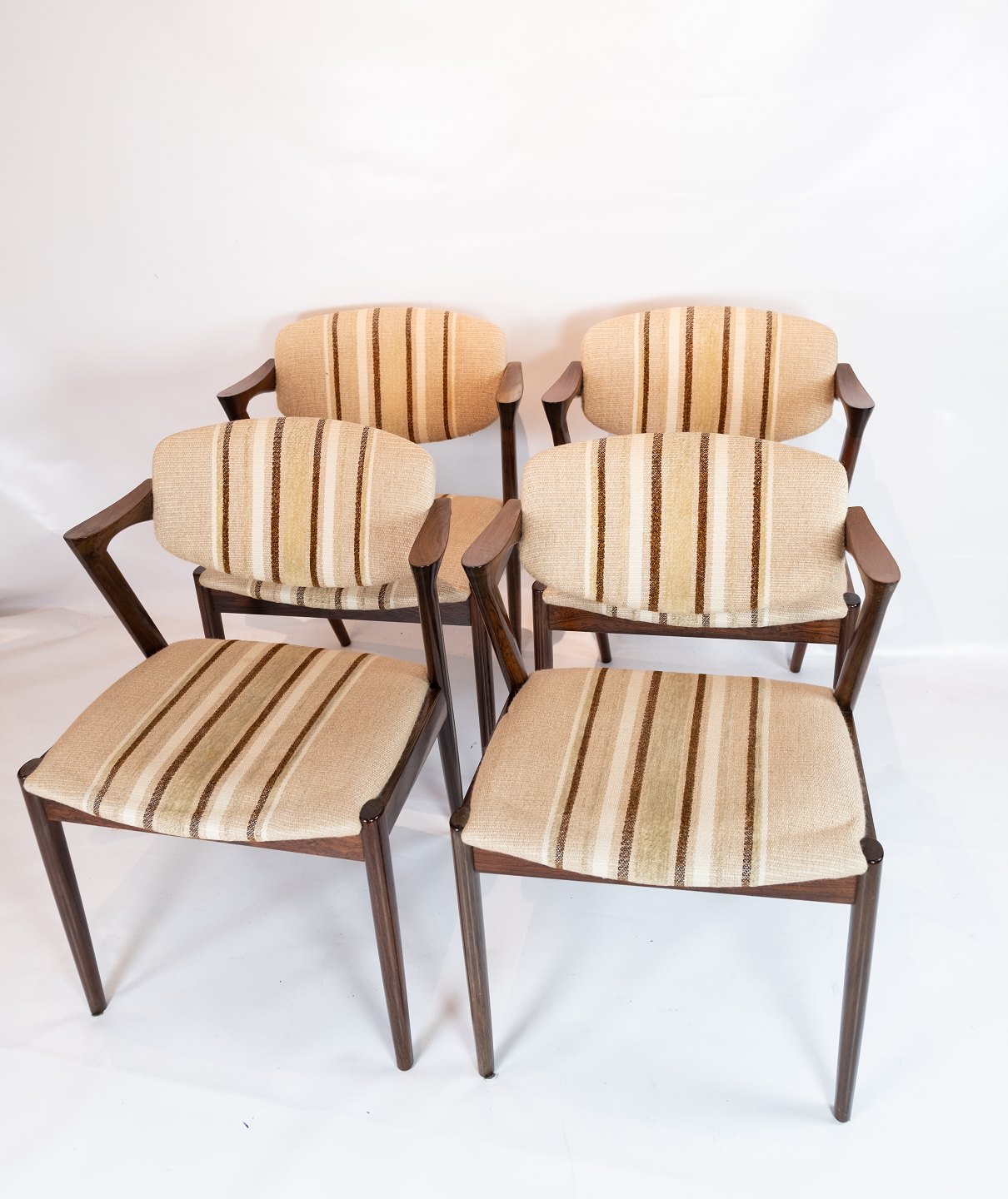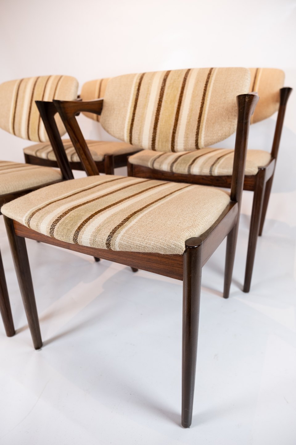 SoldA set of 4 dining chairs, model 42, designed by Kai Kristiansen and manufactured by Schou Andersen in the 1960s. The chairs are of rosewood and upholstered in light striped wool fabric.