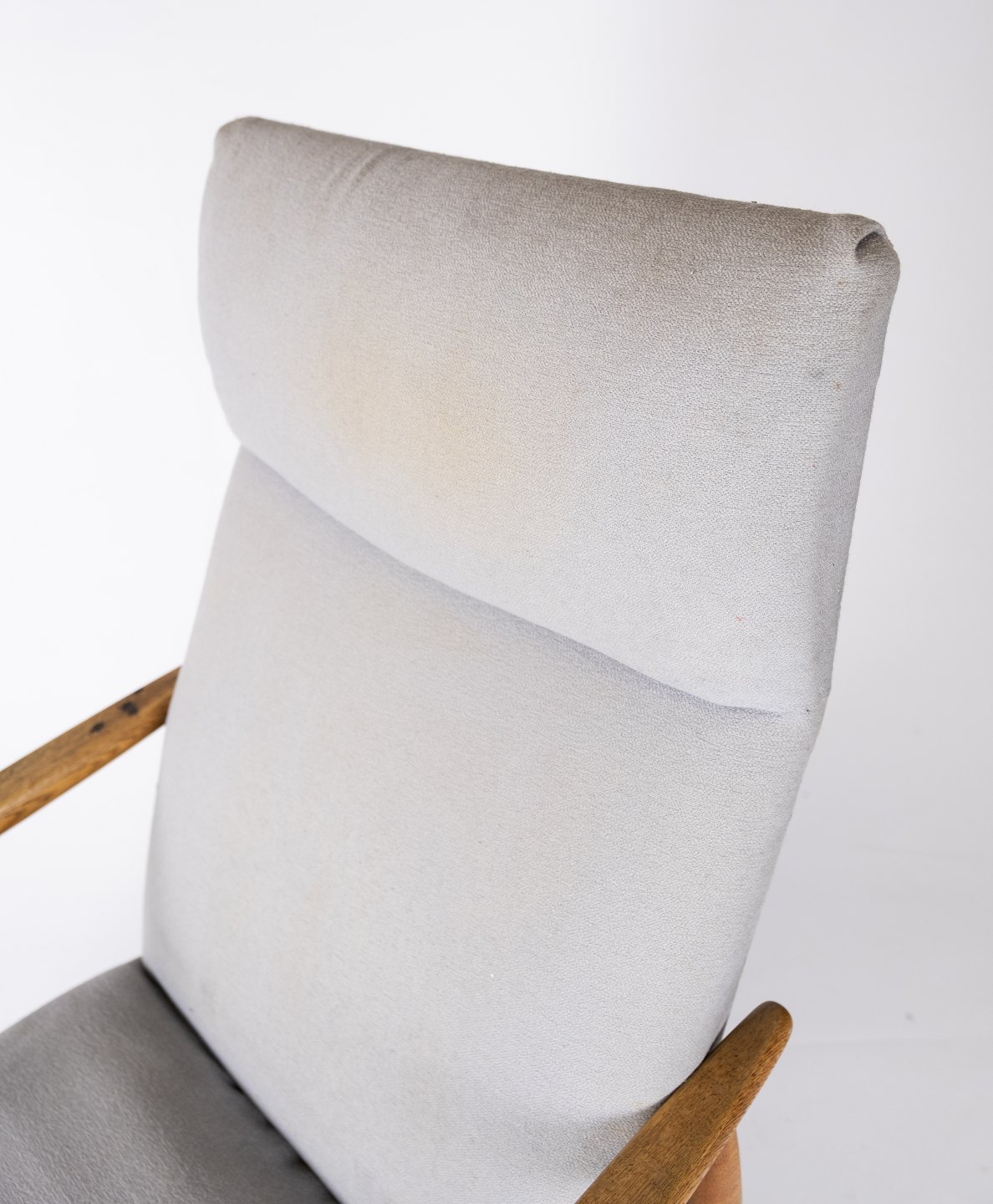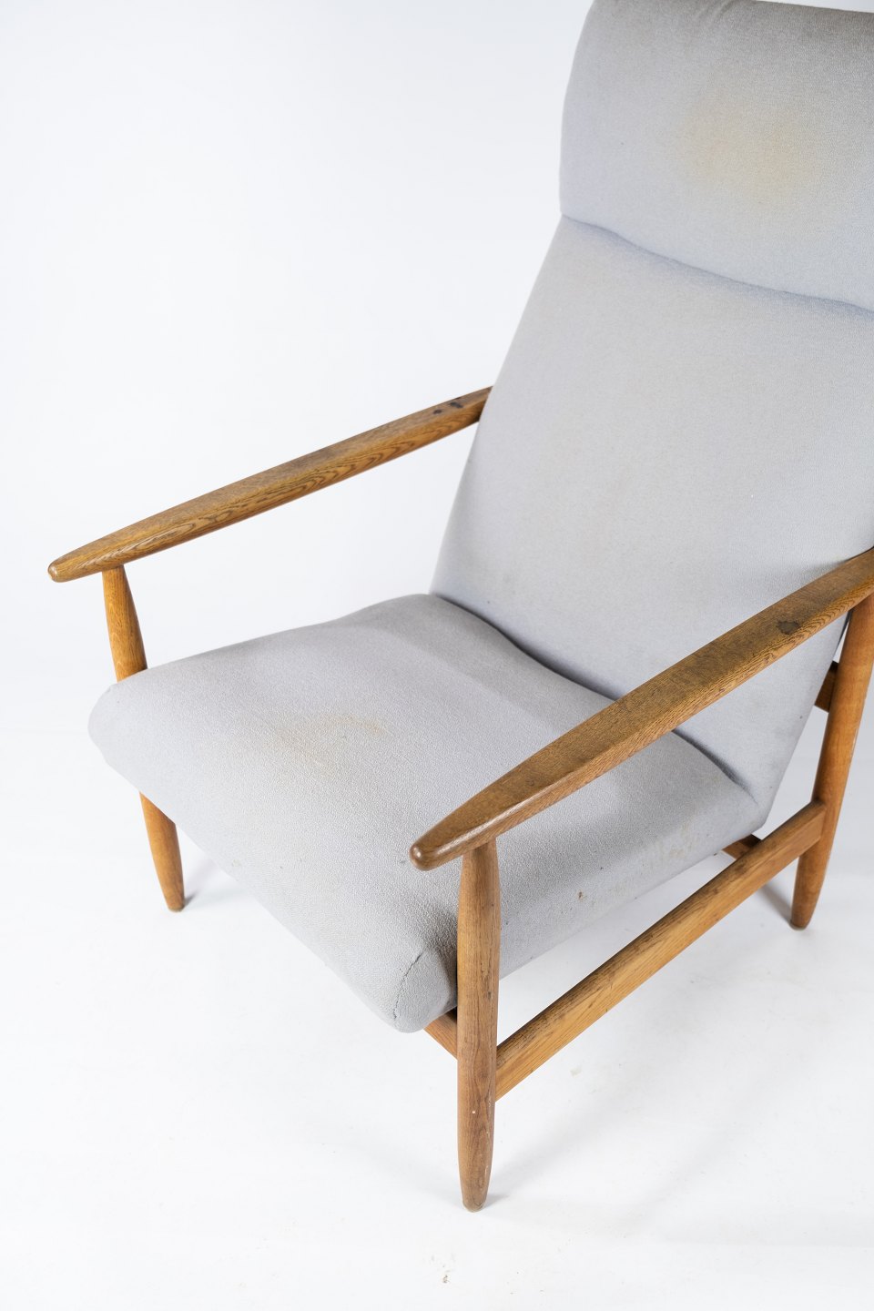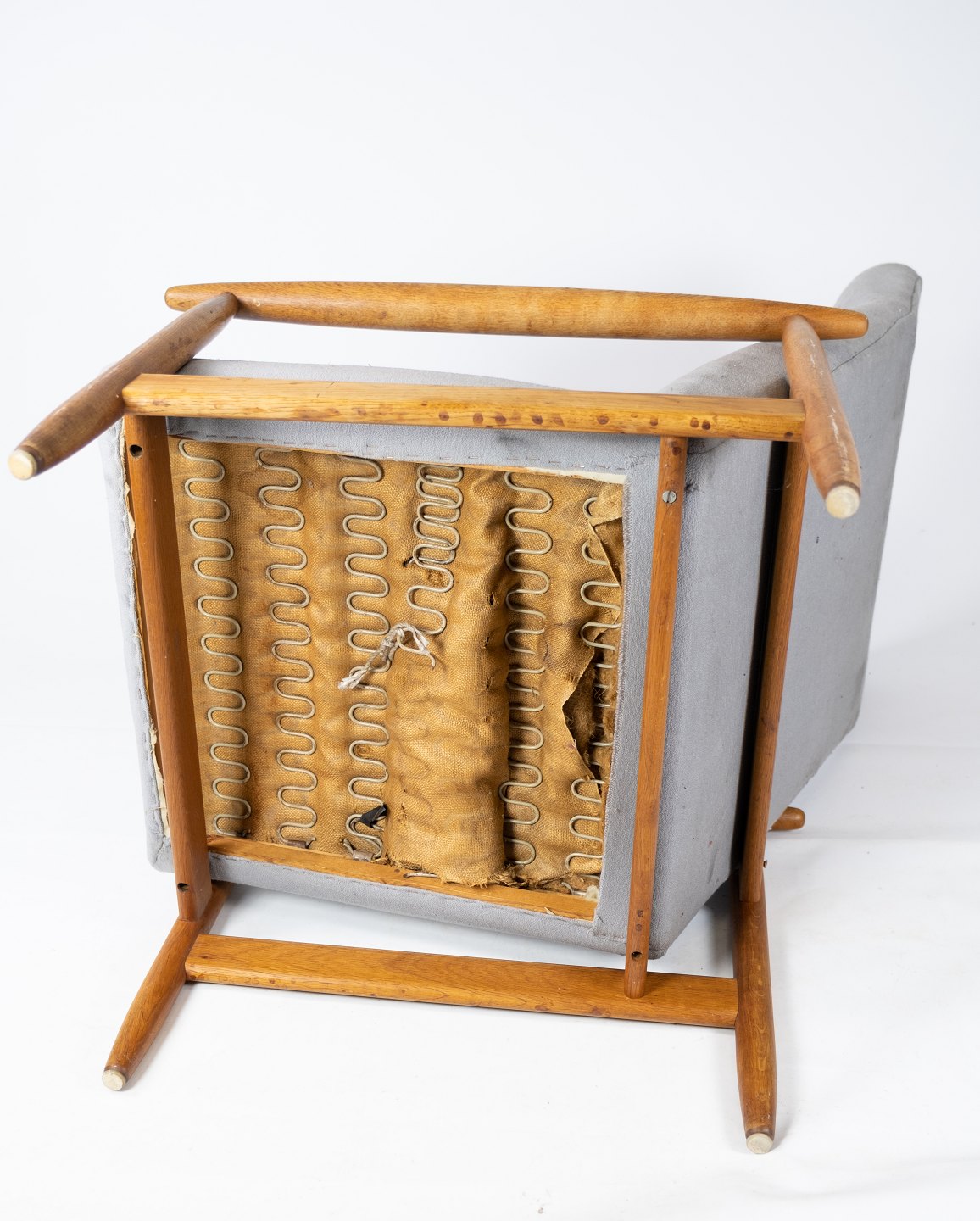 SolgtLænestol, model J65 af lyst træ og polstret med gråt uldstof designet af Ejvind A Johansson for FDB.
