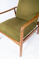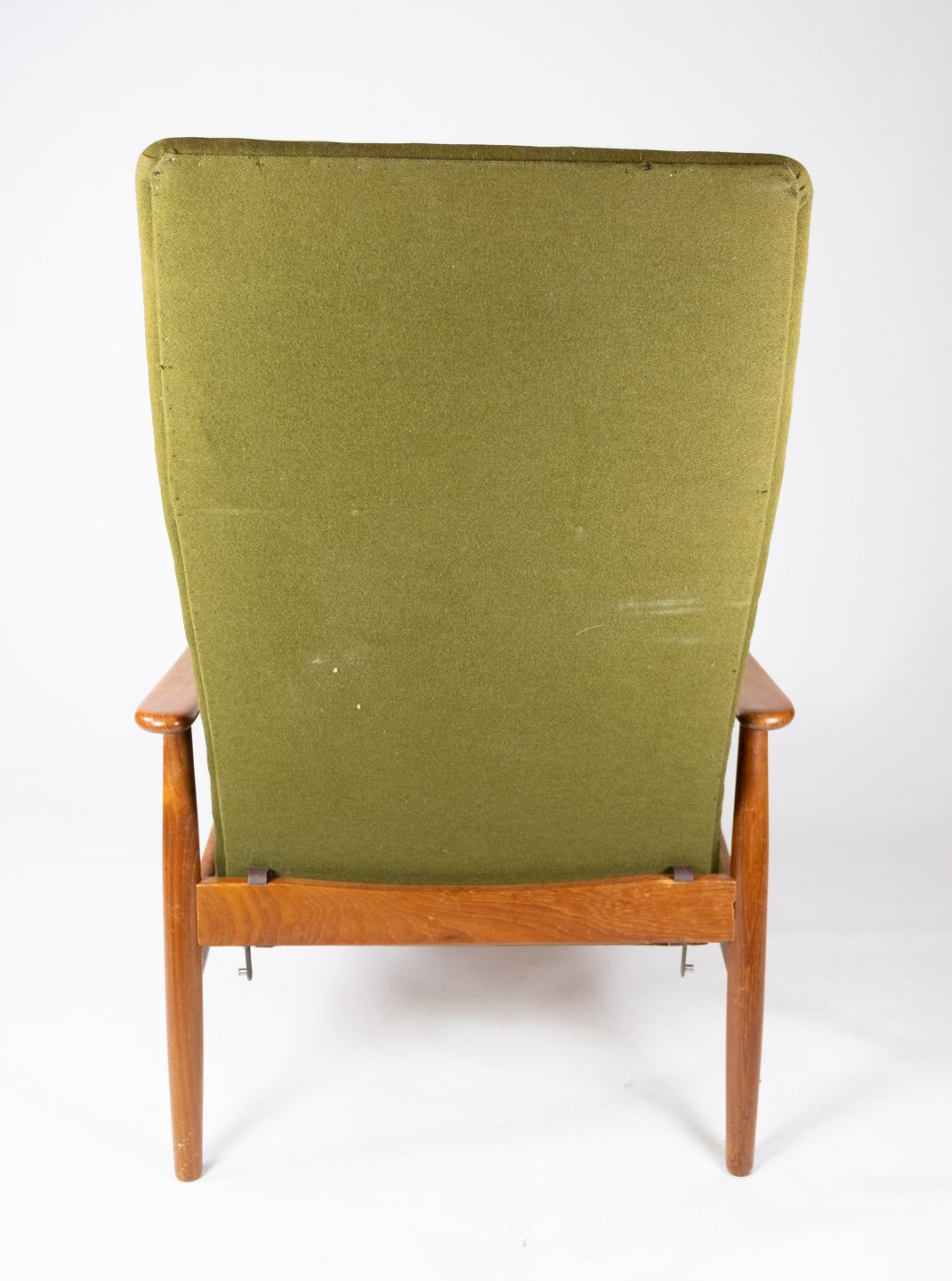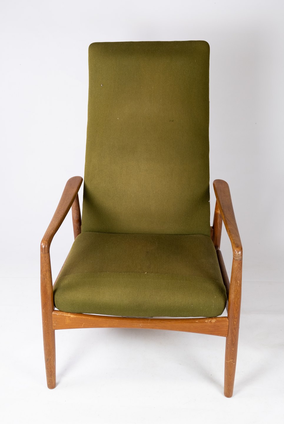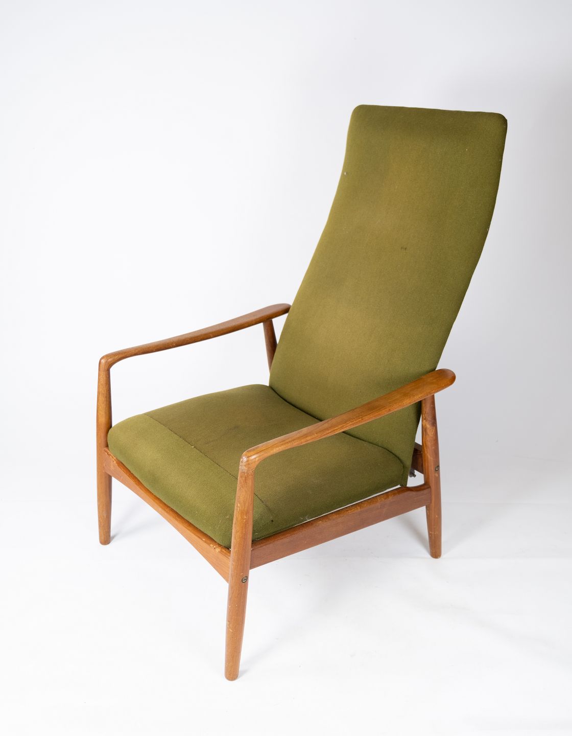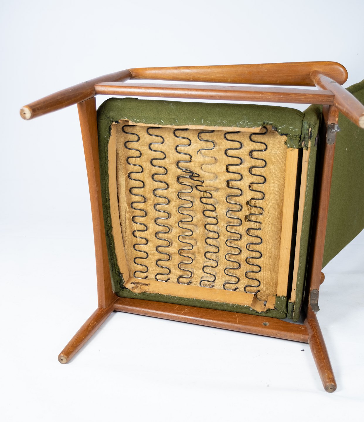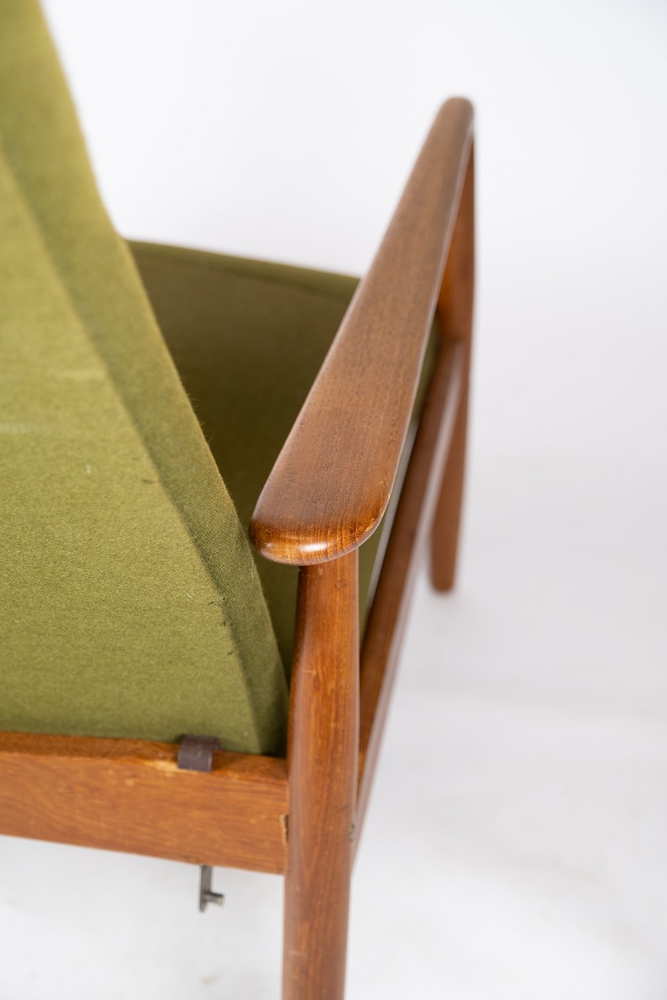 This Easy Chair, designed by Alf Svensson and manufactured by Fritz Hansen in the 1960s, is an example of timeless elegance and comfort. The chair is constructed in teak wood and upholstered with green fabric, which gives it a beautiful and inviting appearance.