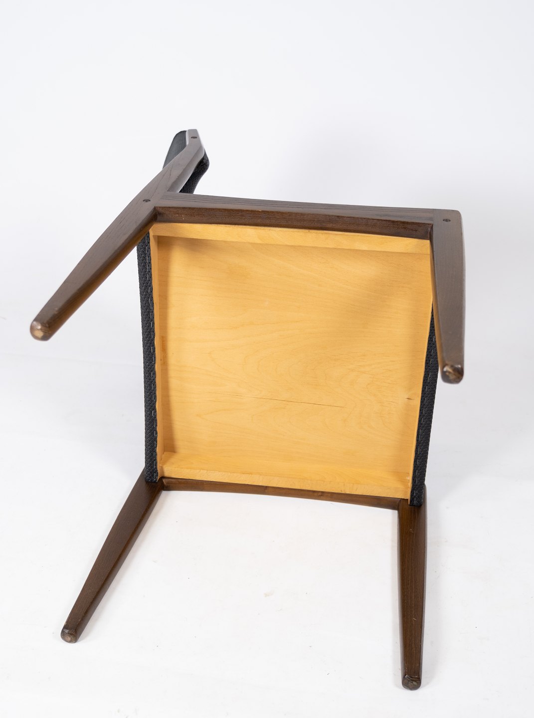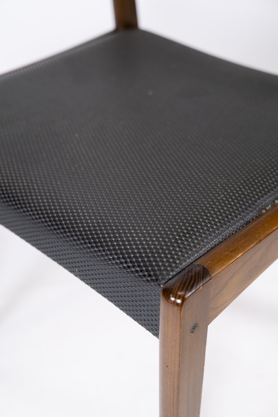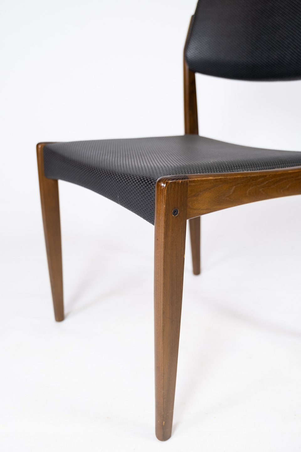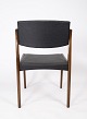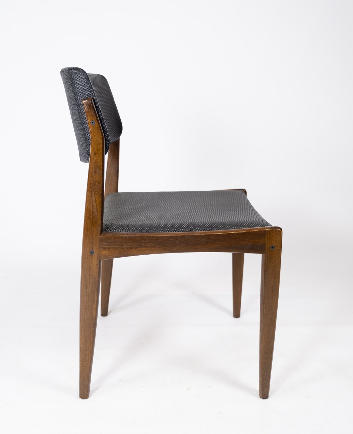 Dette sæt af fire spisestuestole, med sort betræk og mørkt træ, er et tidløst eksempel på dansk design fra 1960'erne. Stolene udstråler en elegant enkelhed og er perfekte til ethvert spiseområde.
