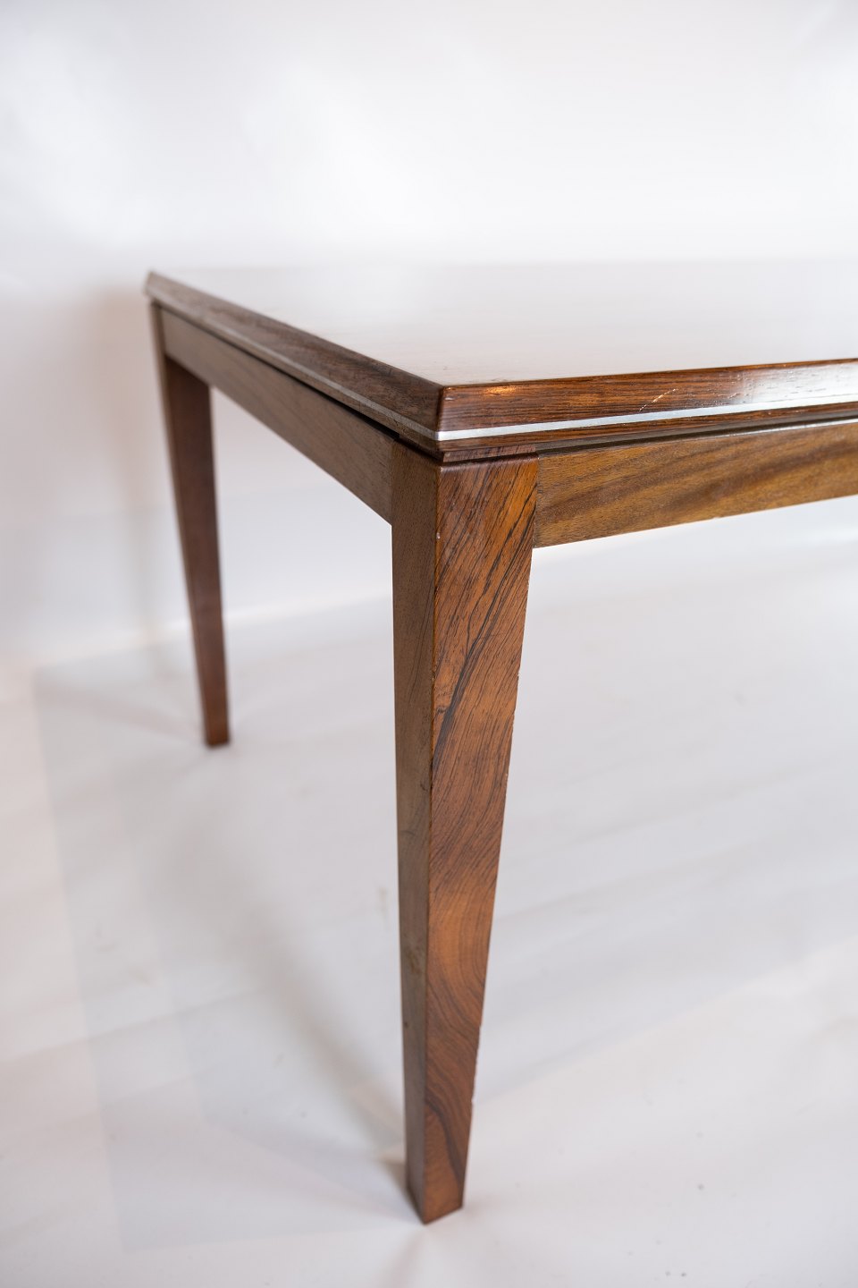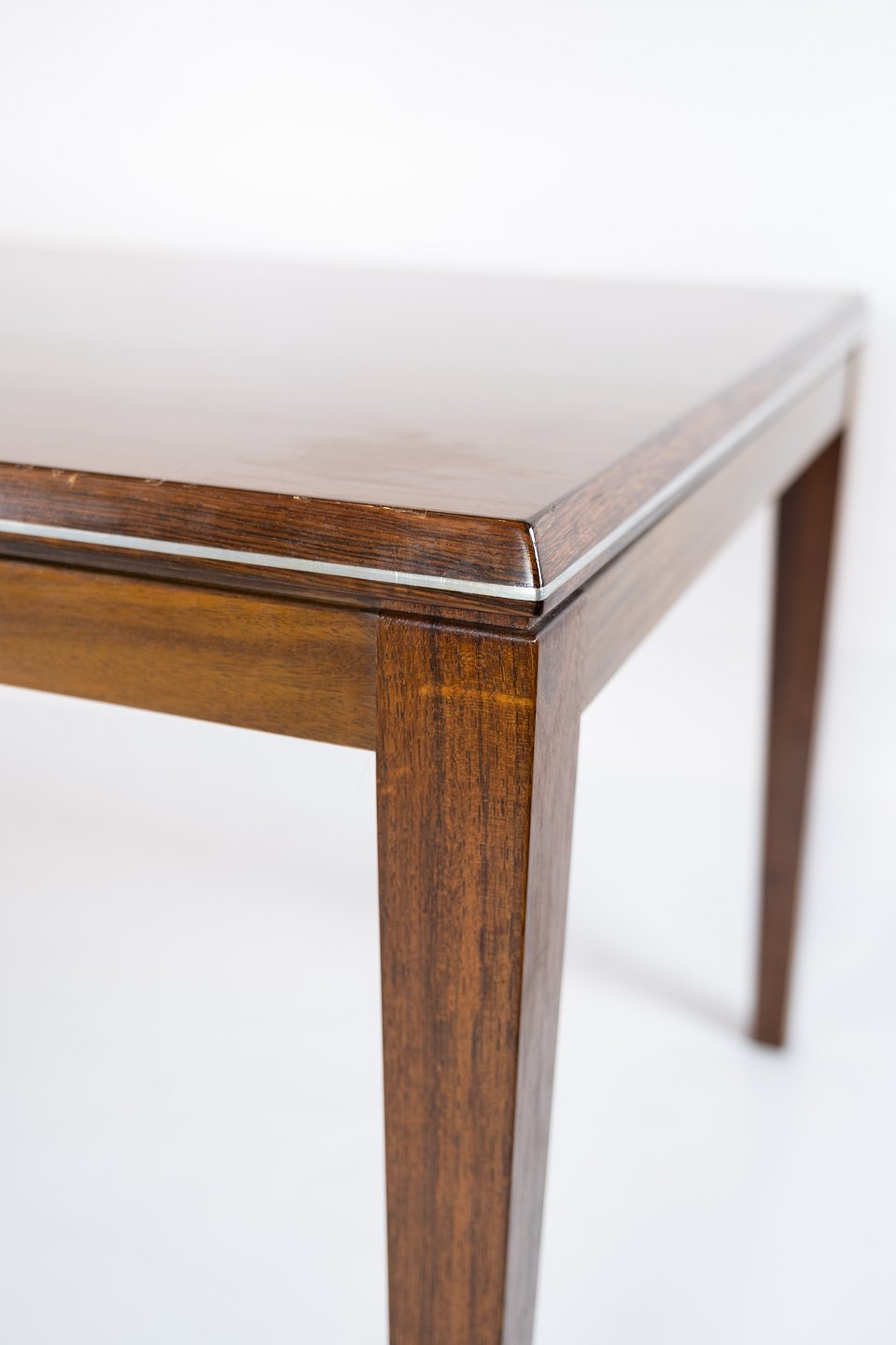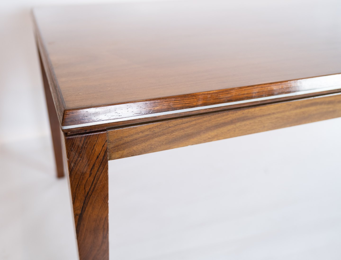Sofabord i palisander dekoreret med metalkant af dansk design fra 1960erne. Bordet er i flot brugt stand.
