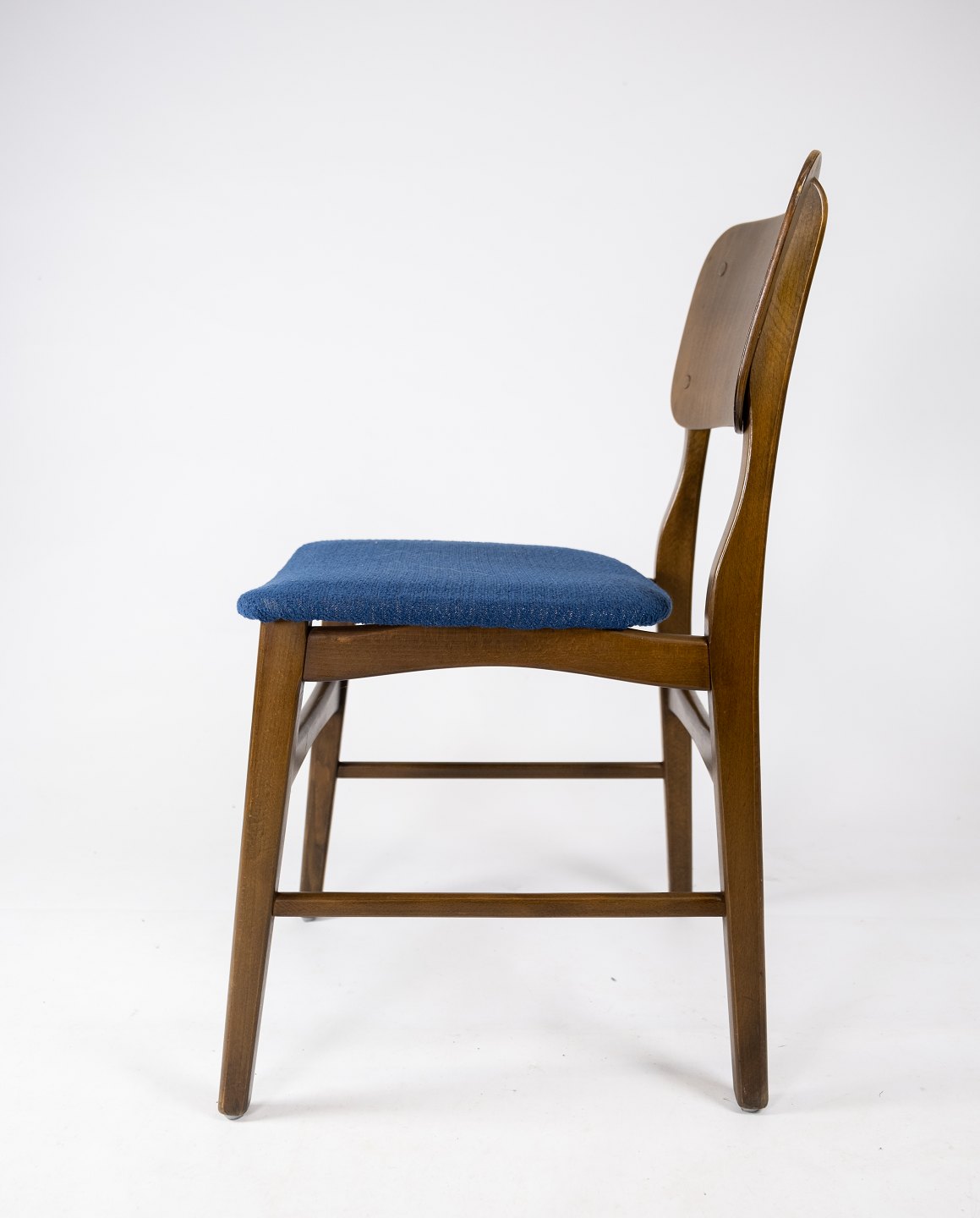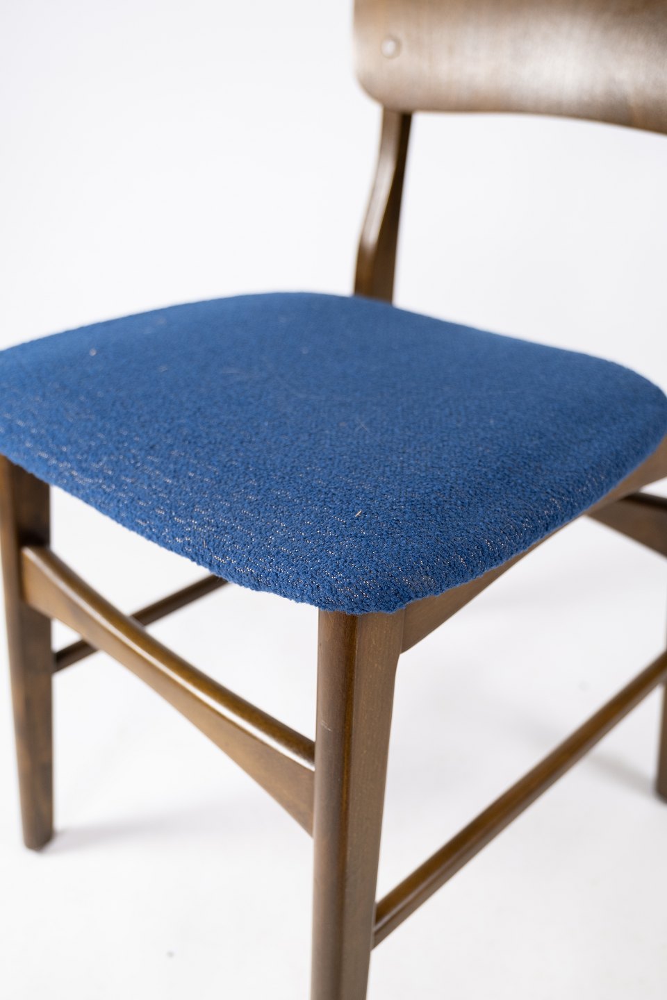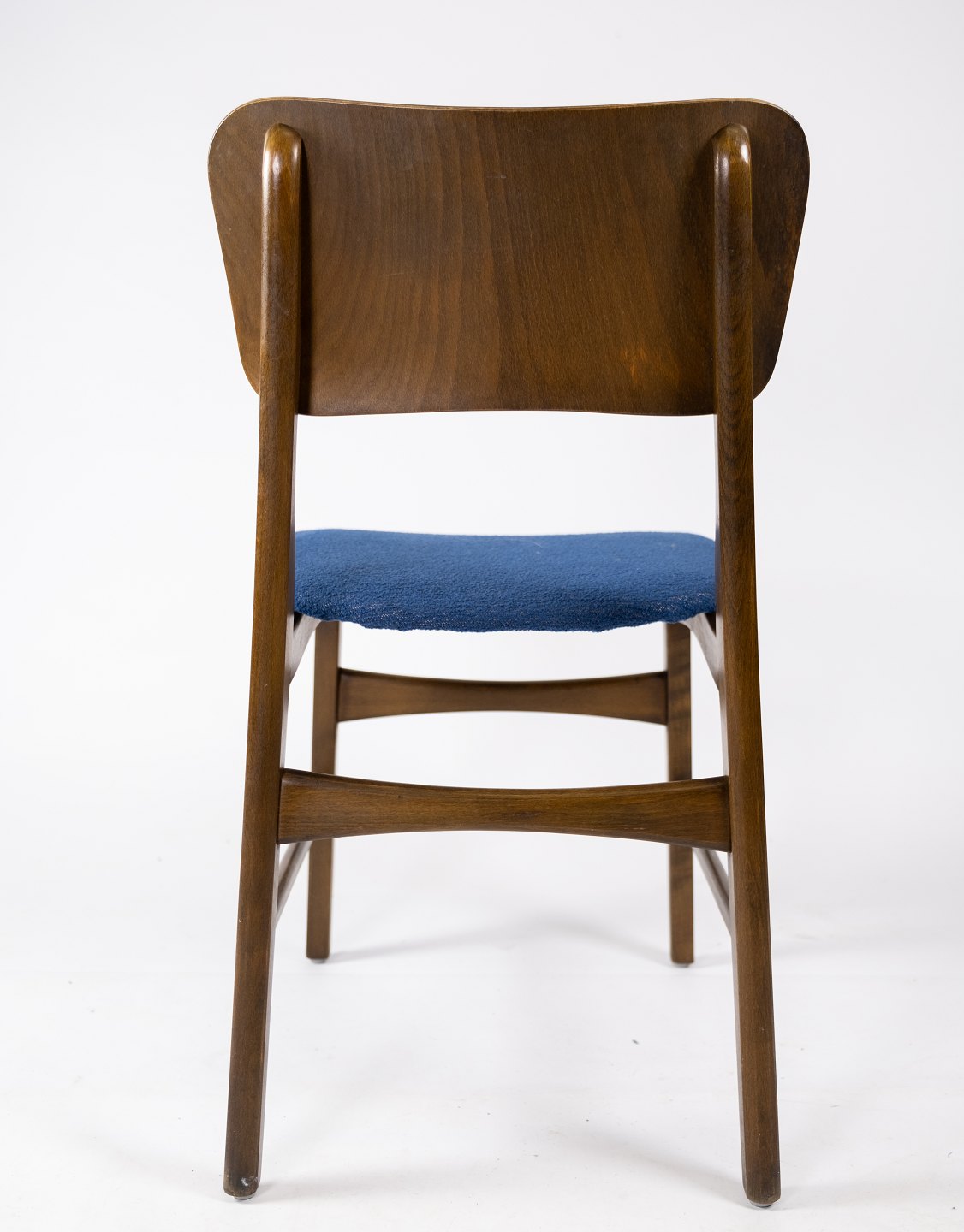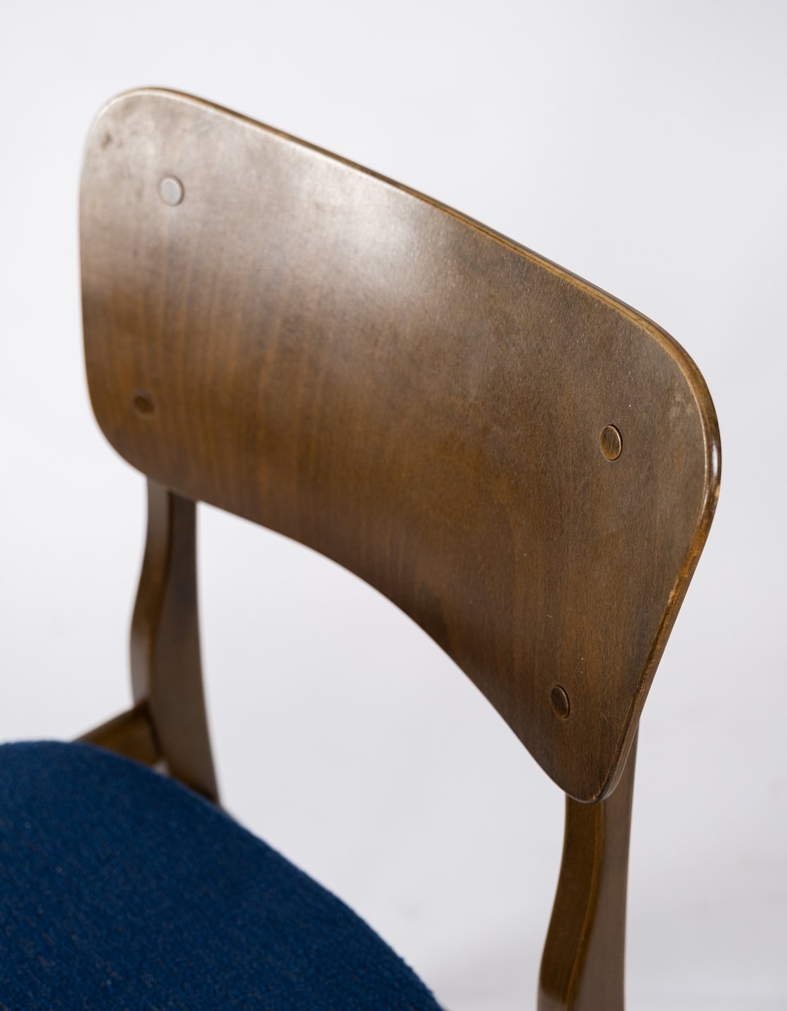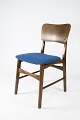 spisestuestole af mørkt træ og blåt stof af dansk design 1960erne.