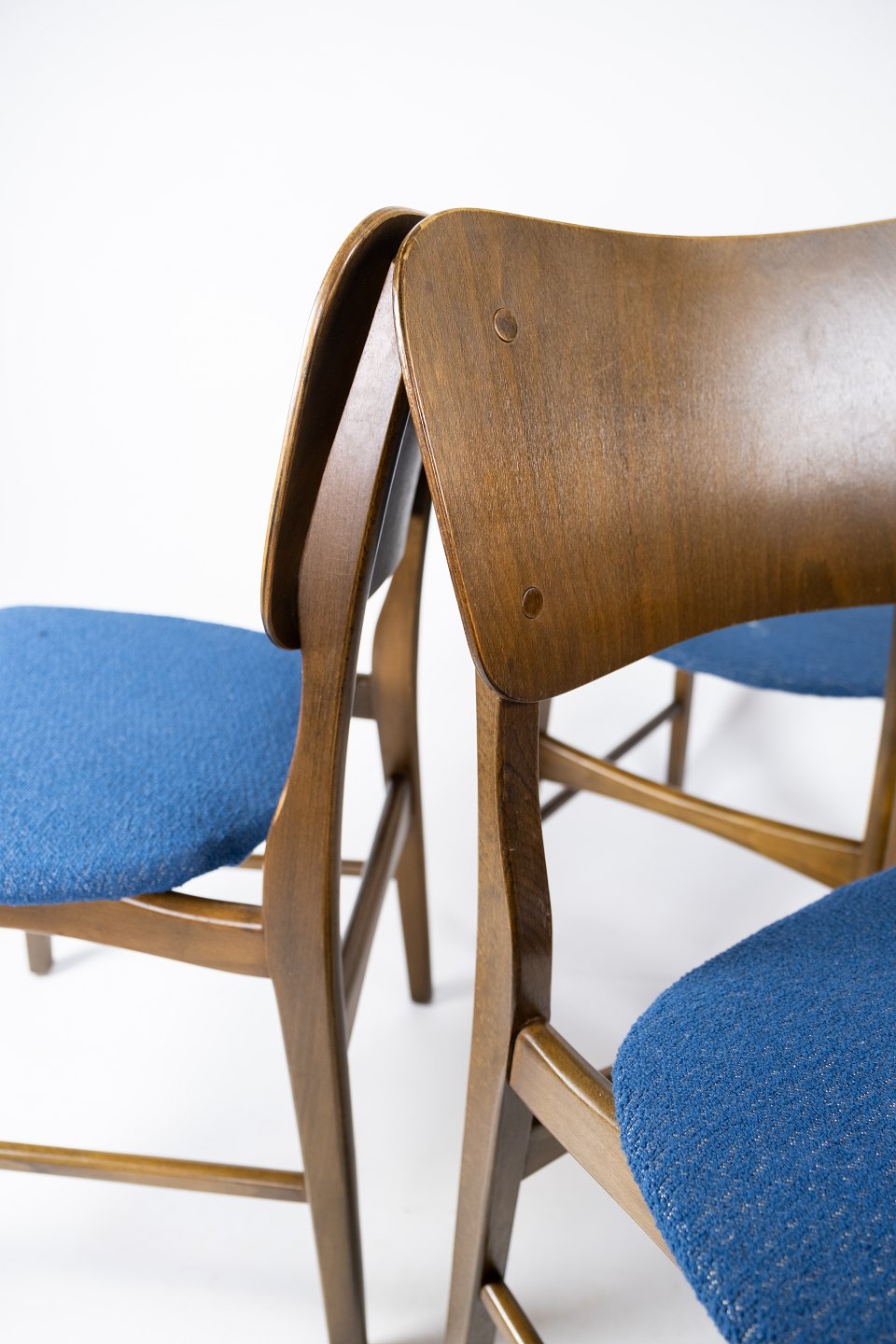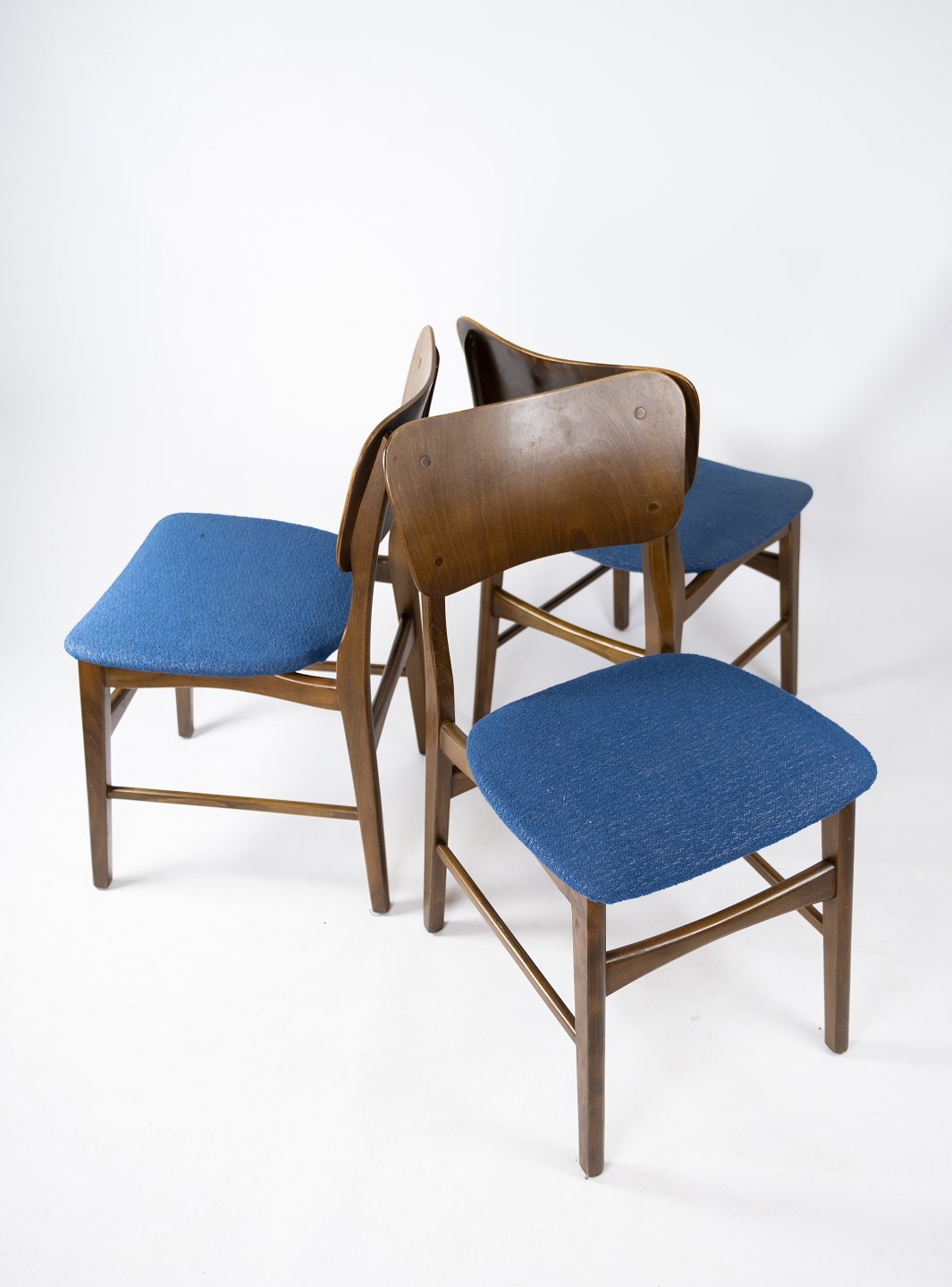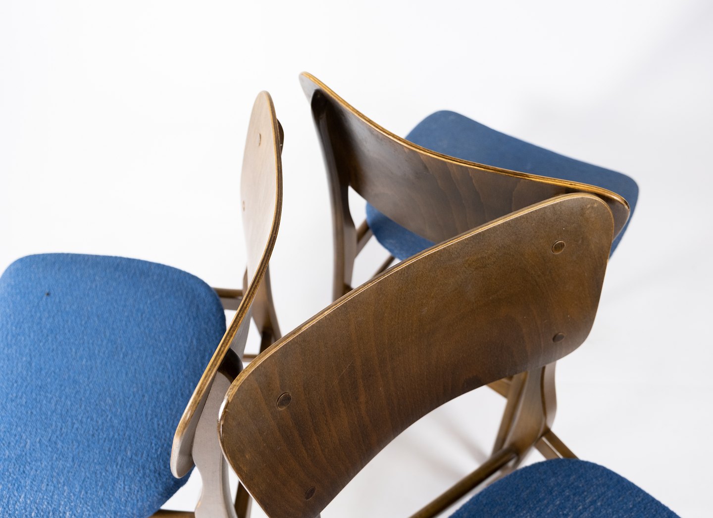 Sæt af tre spisestuestole af mørkt træ og blåt stof af dansk design 1960erne. Stolene er i flot brugt stand.