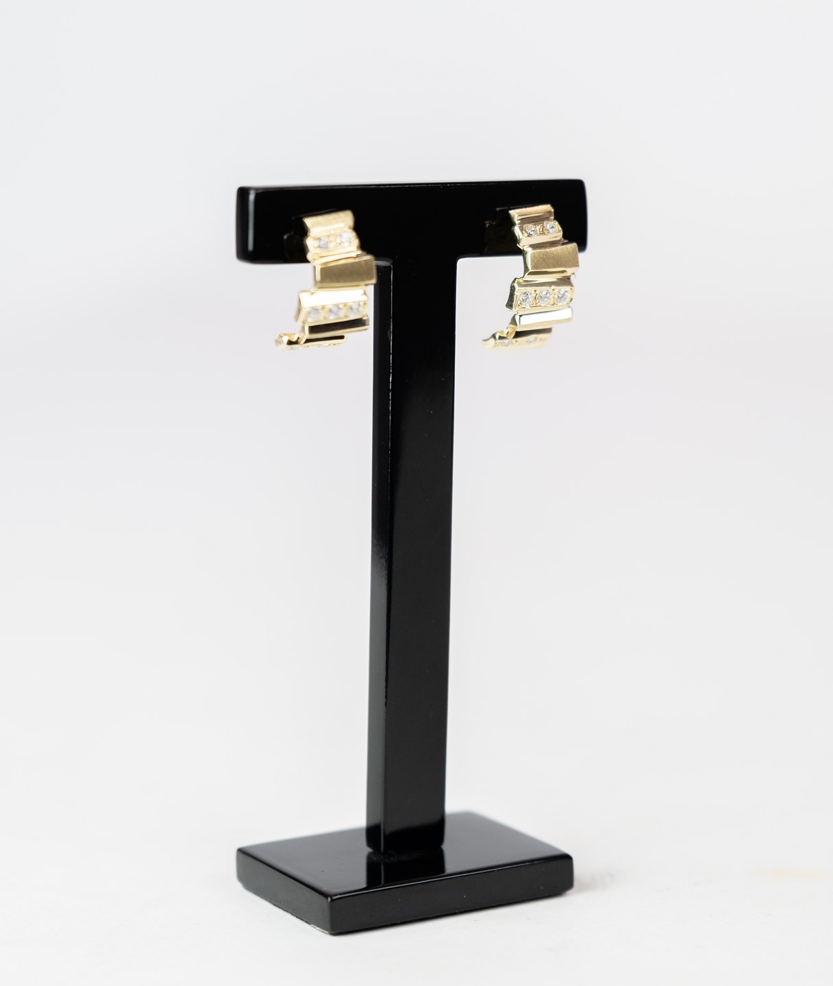 Set of earrings of 14 carat gold decorated with clear stones.