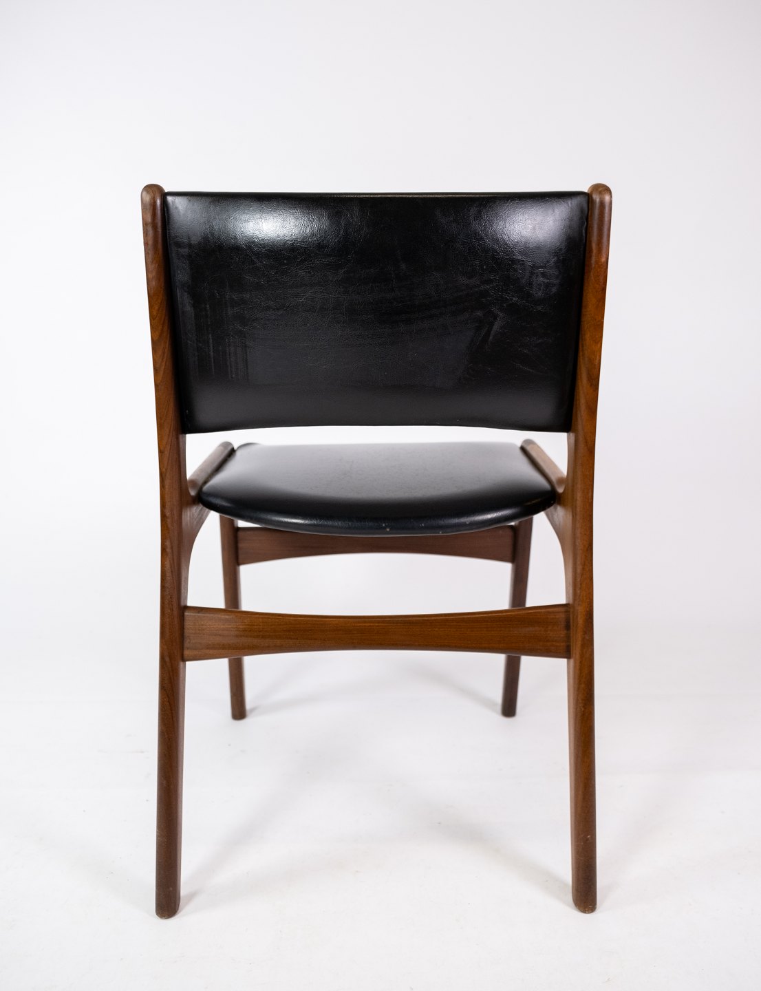 SolgtEt sæt stole i teak og med sort læder, designet af Erik Buch i 1960'erne, udstråler en tidløs elegance og funktionalitet. Disse stole er et smukt eksempel på dansk møbeldesign fra midten af det 20. århundrede og vil tilføre enhver indretning en sublim atmosfære.