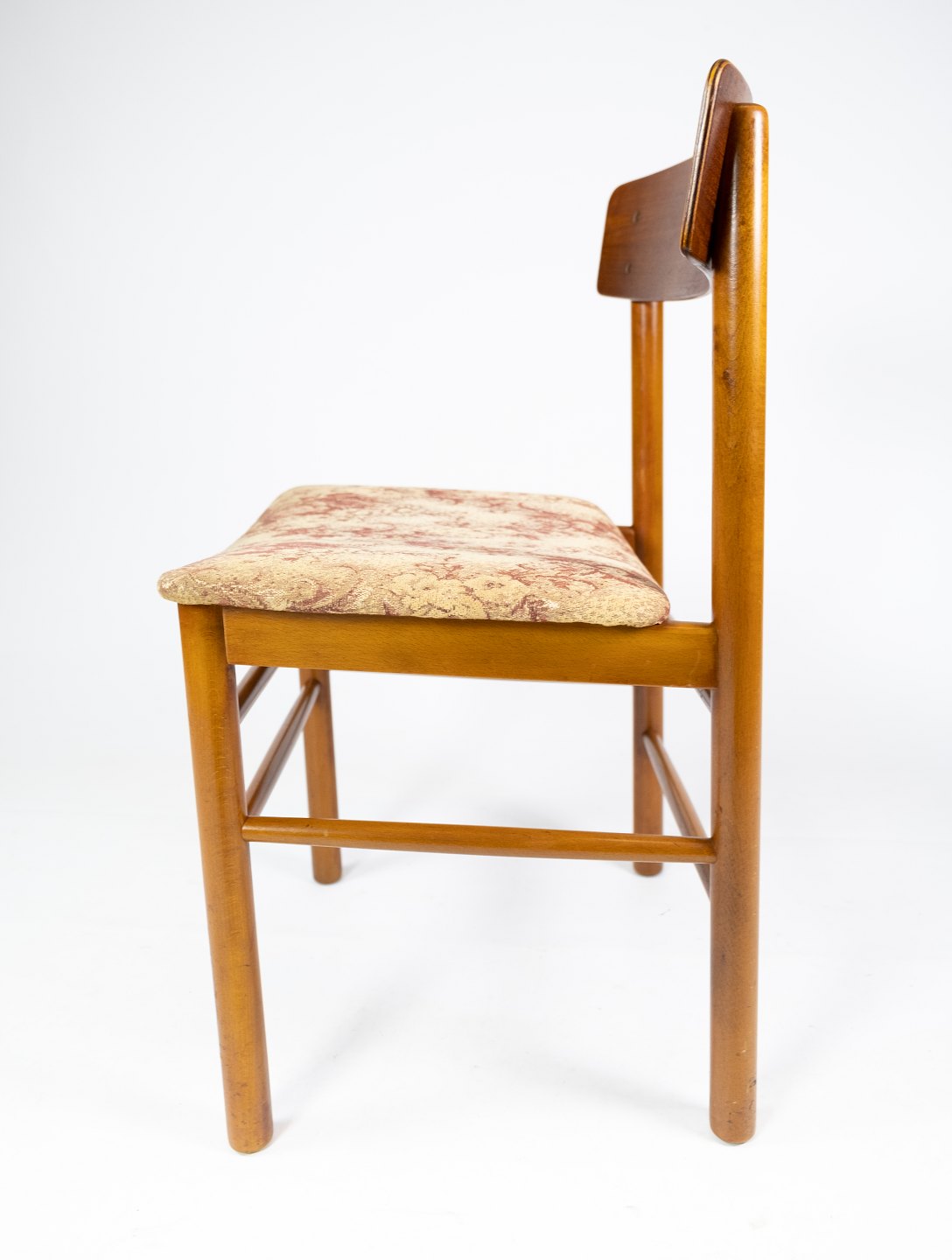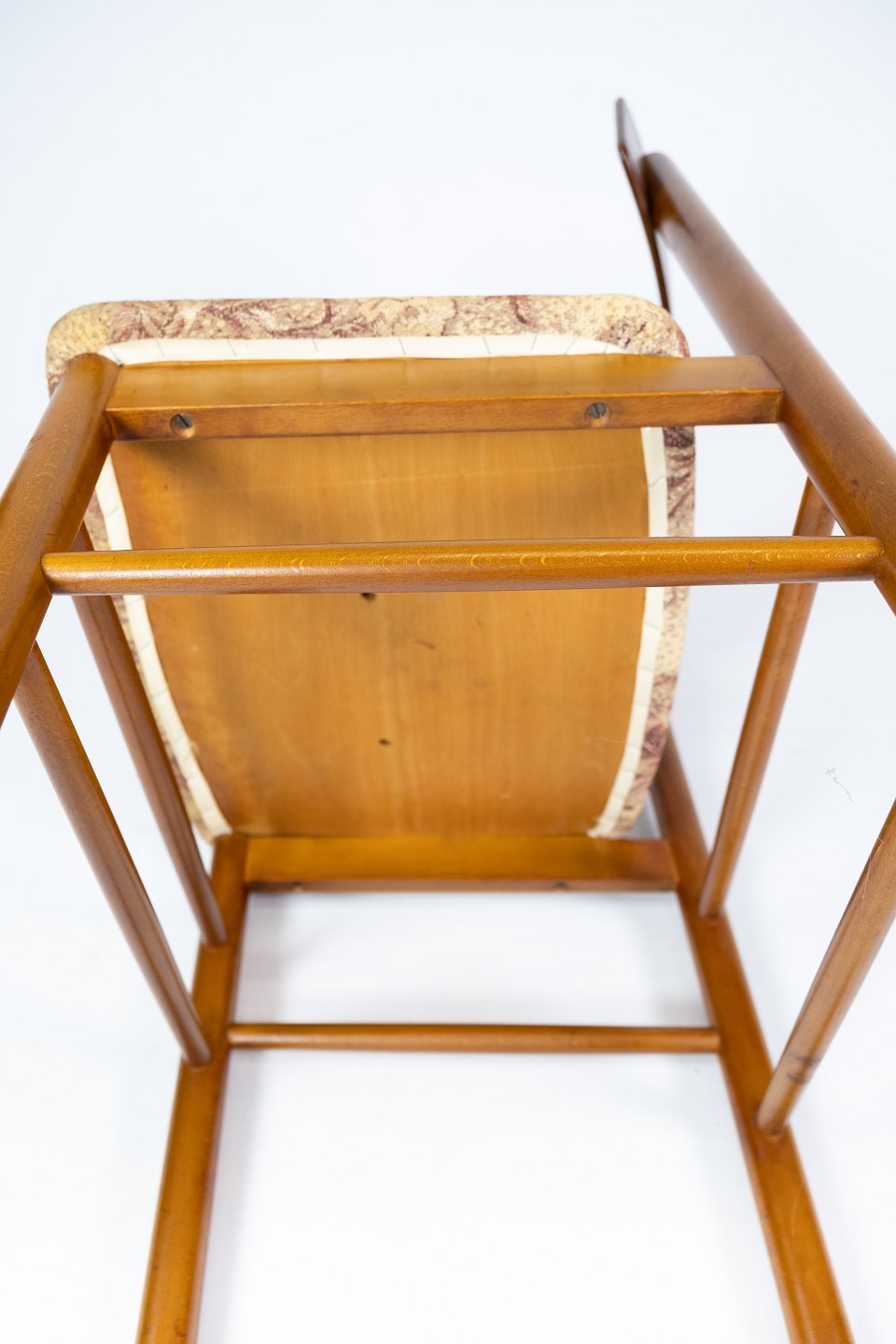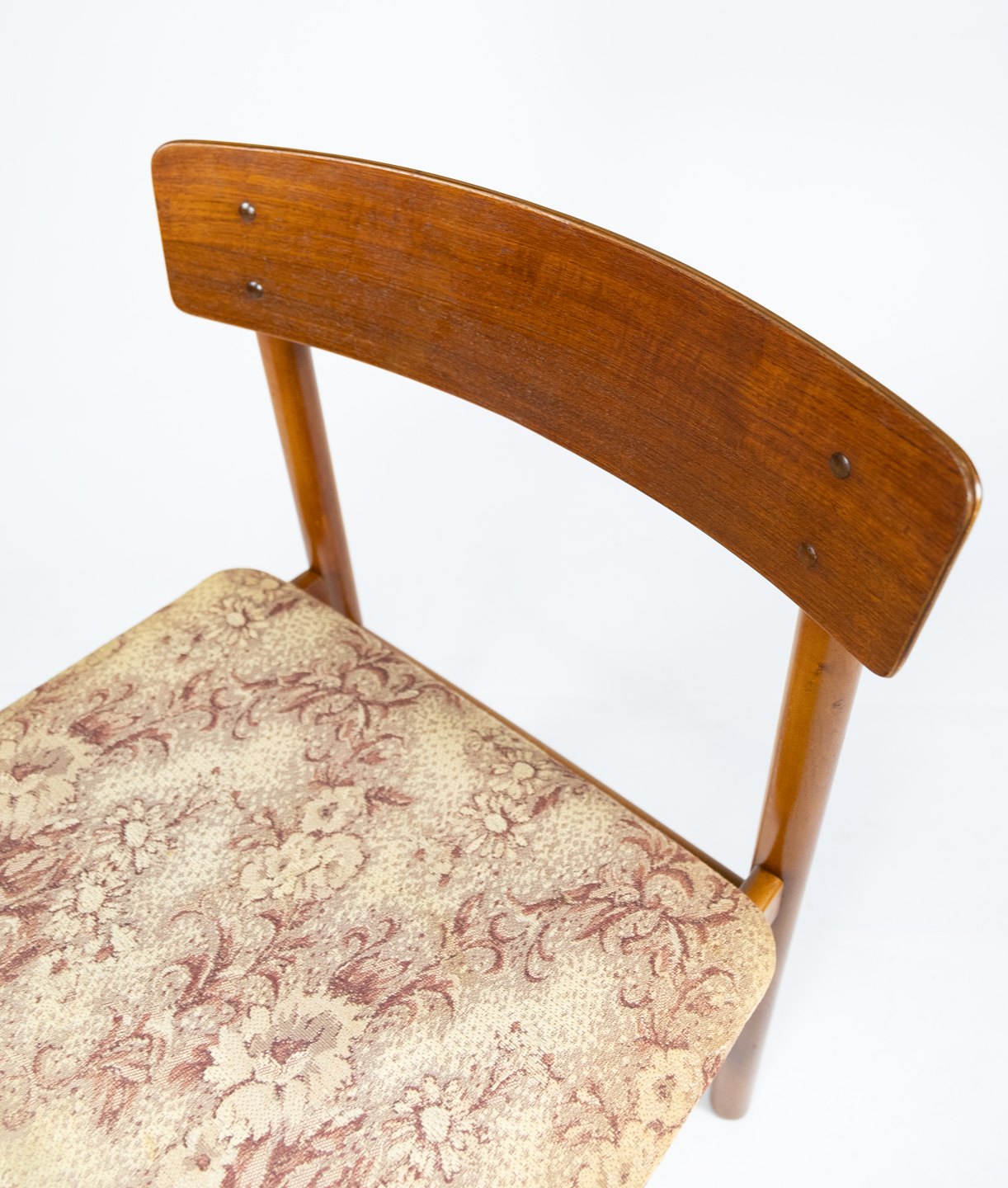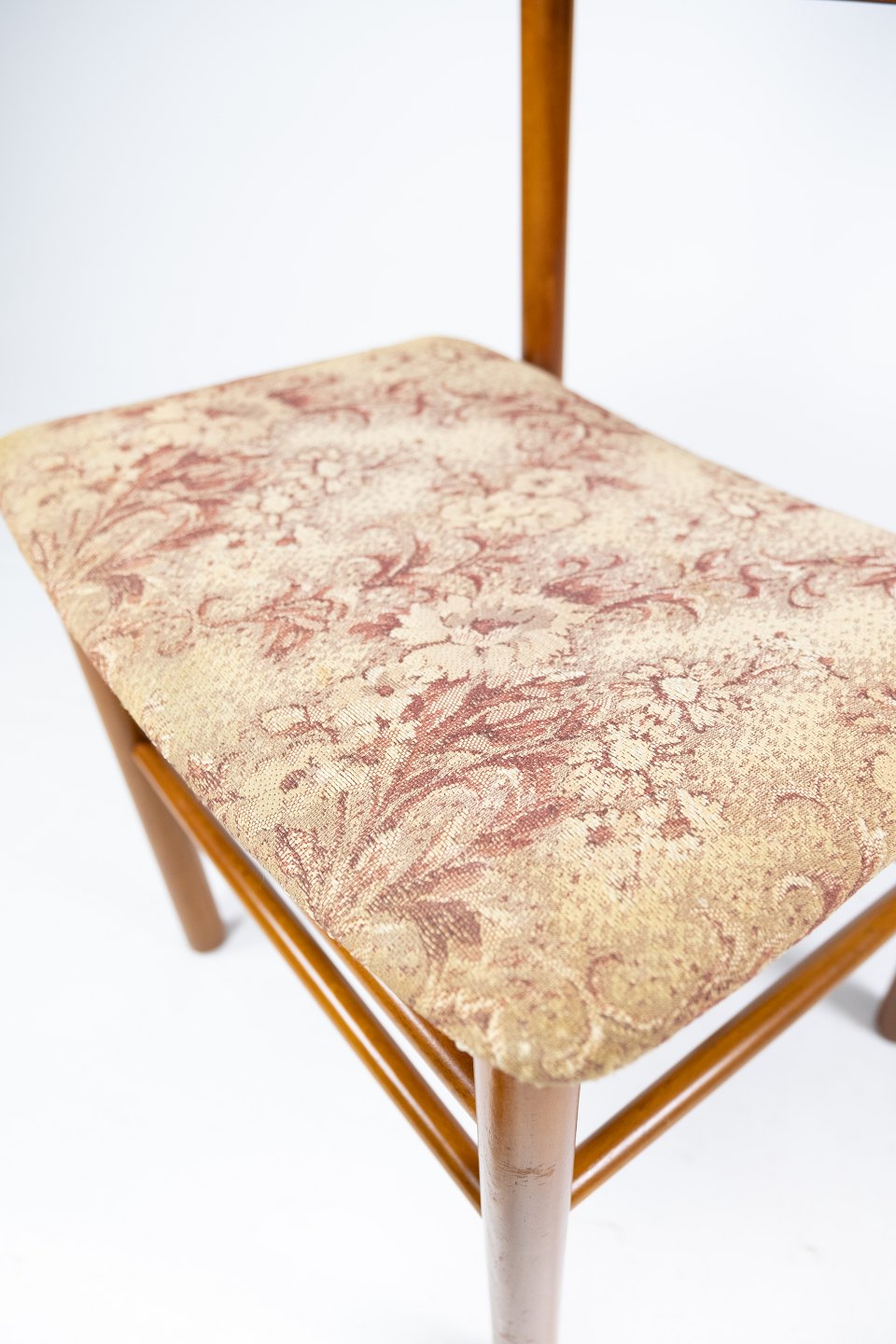 Den lyseblomstrede polstring tilføjer et strejf af elegance og charme til stolene, samtidig med at de bevarer deres autentiske retrostil. Med deres komfortable sæder og ryglæn er disse stole ikke kun smukke, men også yderst funktionelle og behagelige at sidde i under lange middage eller sociale sammenkomster.