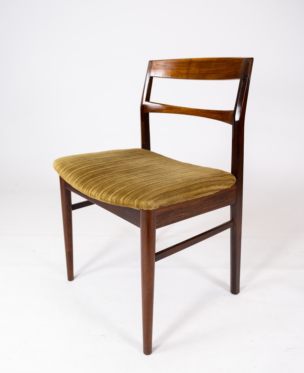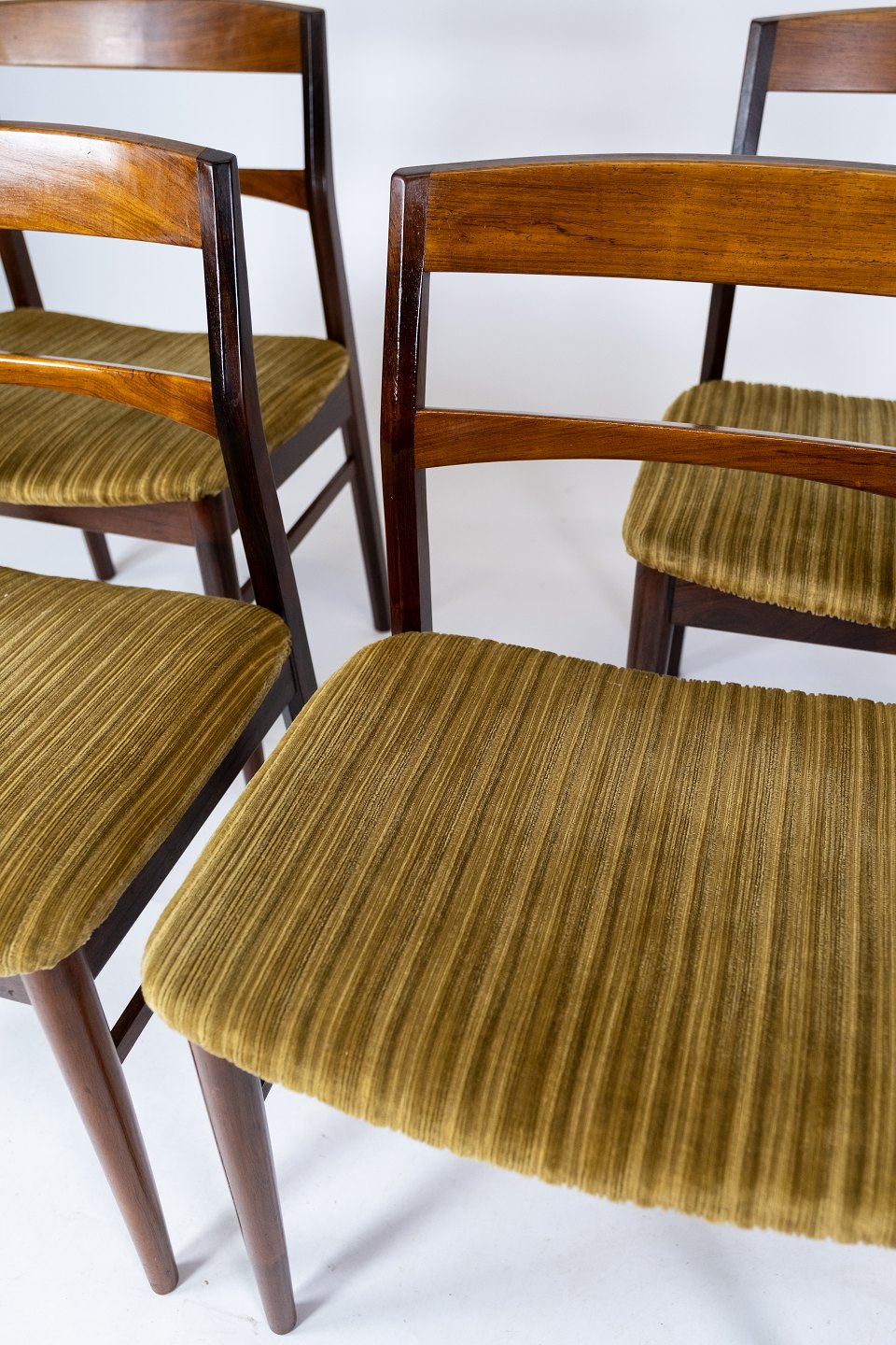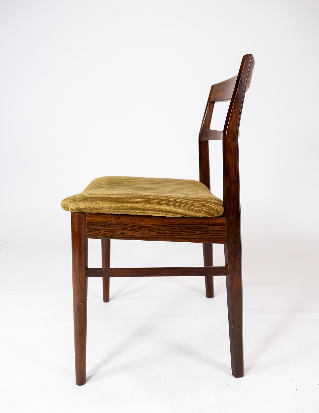 Et sæt spisestuestole i palisander og grønt stof, af dansk design fra 1960'erne, udstråler en tidløs elegance og enkelhed, der kendetegner den skandinaviske designtradition fra denne periode.
