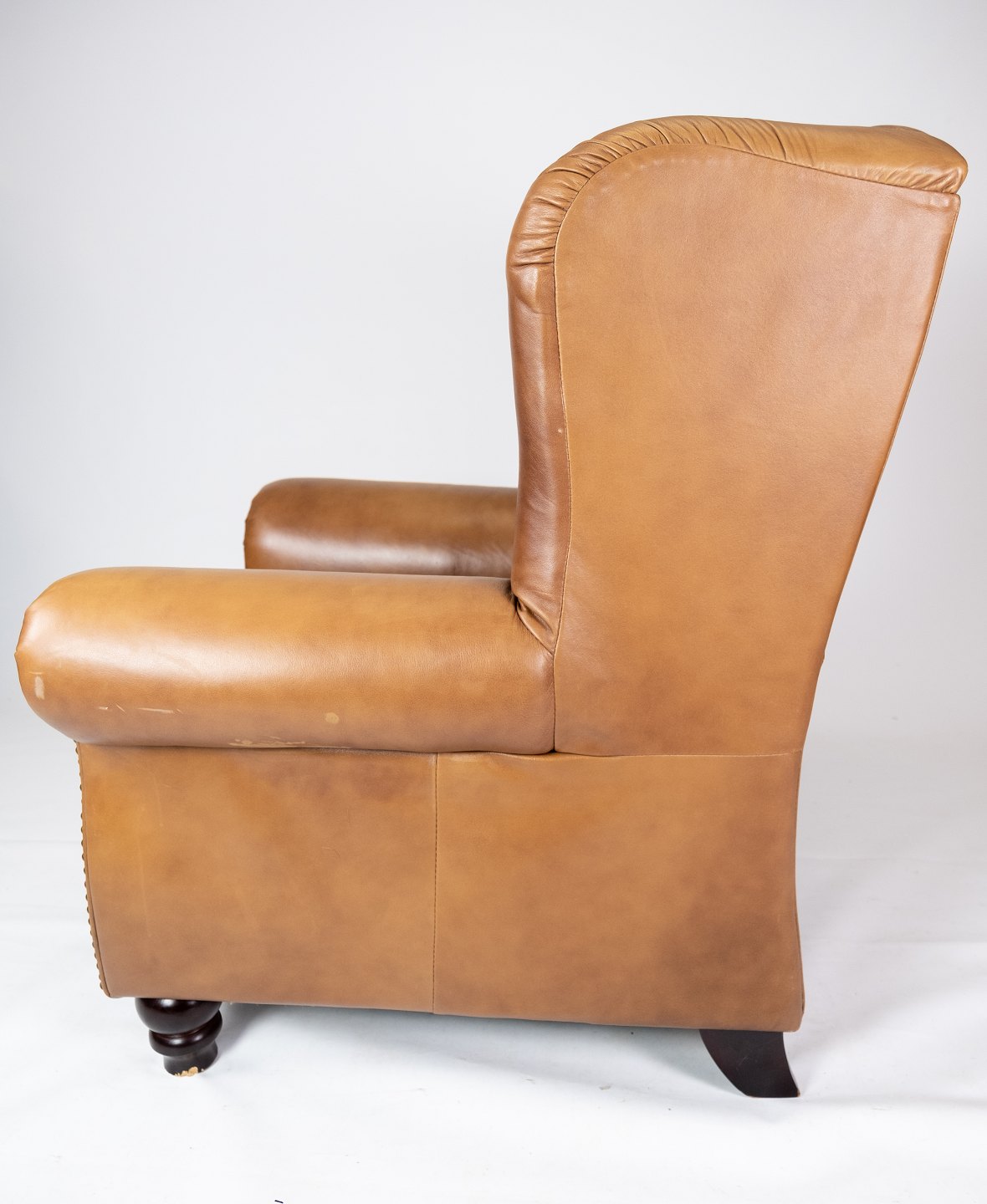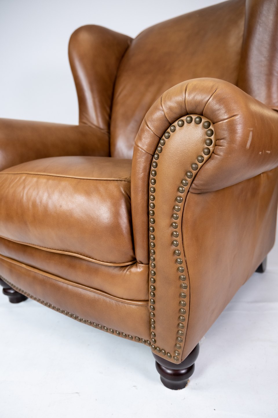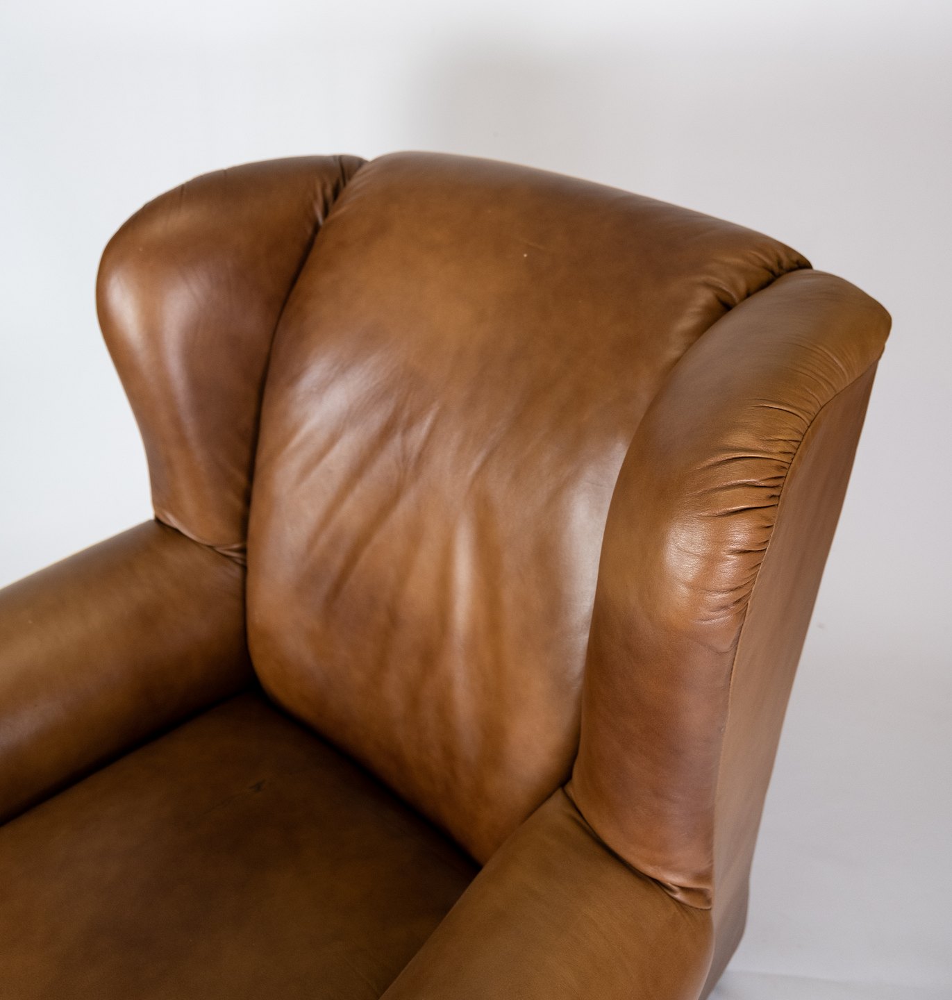 SolgtStor hvilestole/øreklapstol i cognacfarvet læder. Stolen er i flot brugt stand.