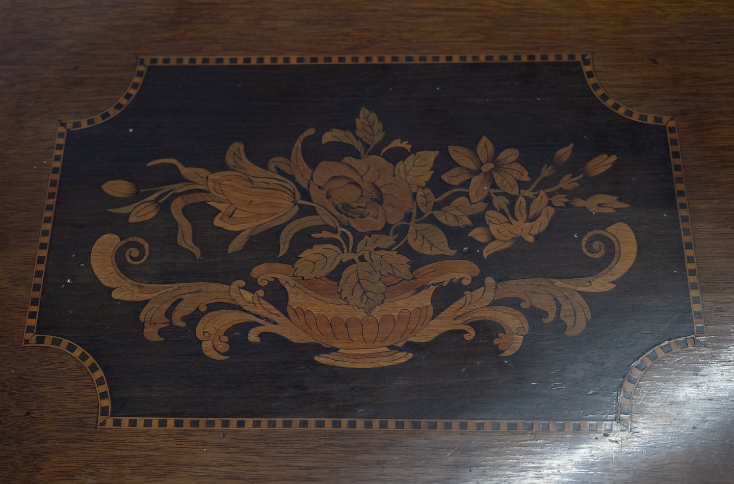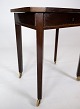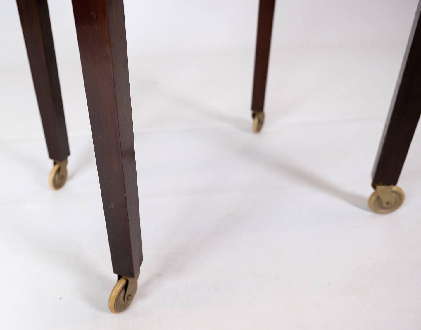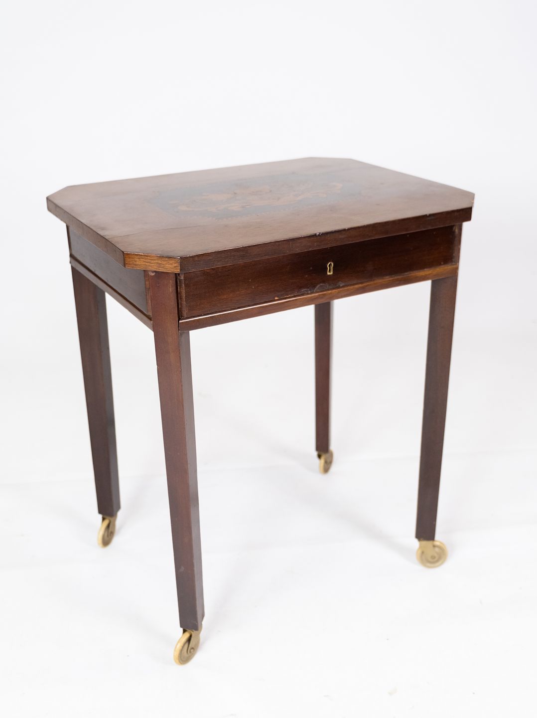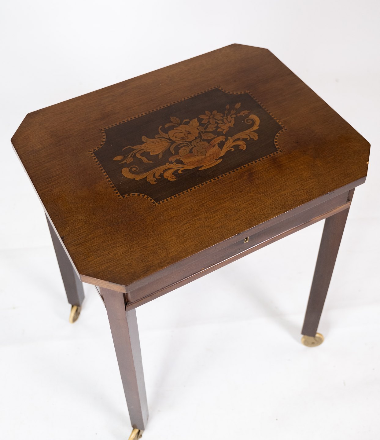 Sidebord af mahogni med intarsia og på hjul fra 1890erne. Bordet er i flot brugt stand.