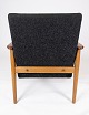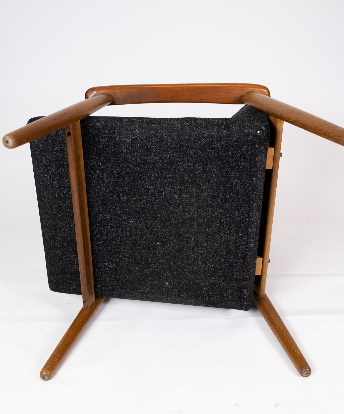 Lænestol med skammel i teak og mørkt uldstof af dansk design fra 1960erne. Sættet er i flot brugt stand.