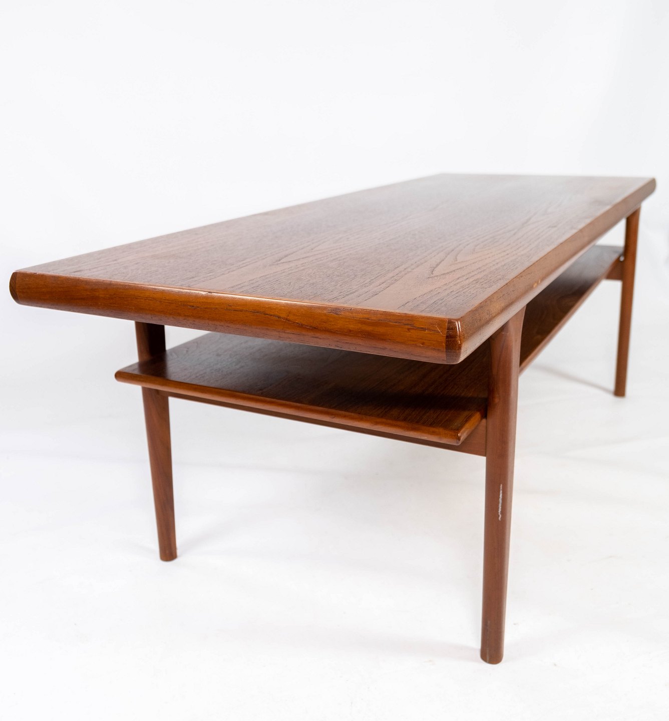 SolgtSofabord med underhylde teak af dansk design fra 1960erne. Bordet er i flot brugt stand.