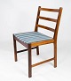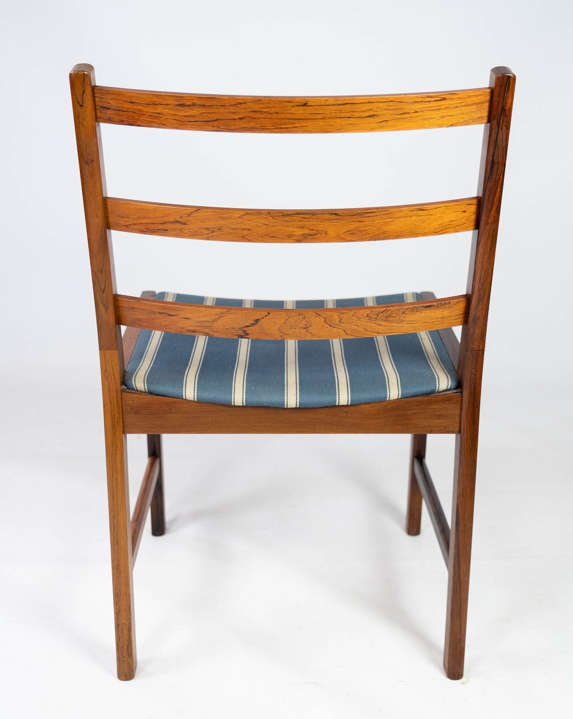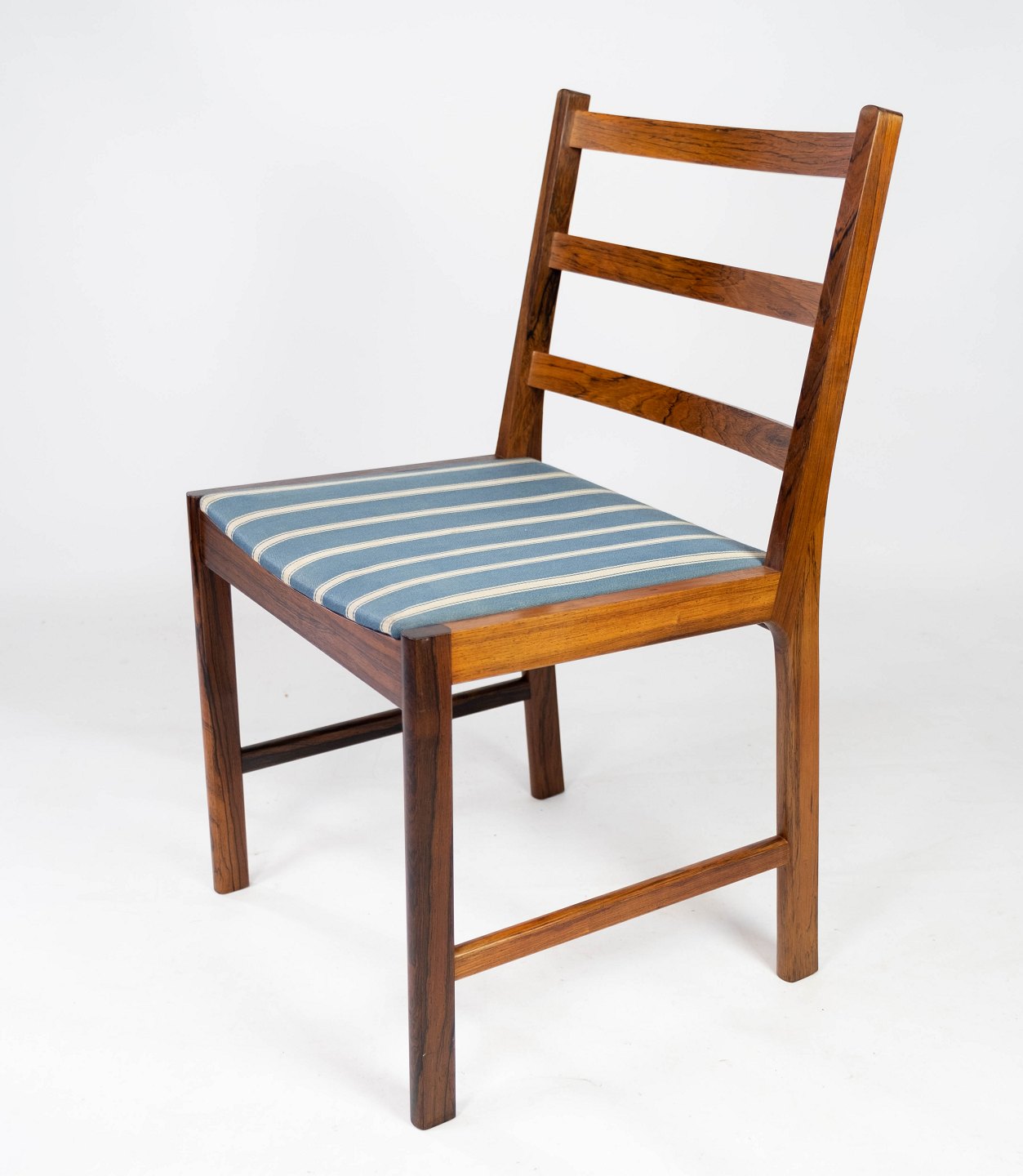 SoldA set of four dining chairs in rosewood and seats upholstered with blue striped fabric, of danish design from the 1960s. The chairs are in great vintage condition.