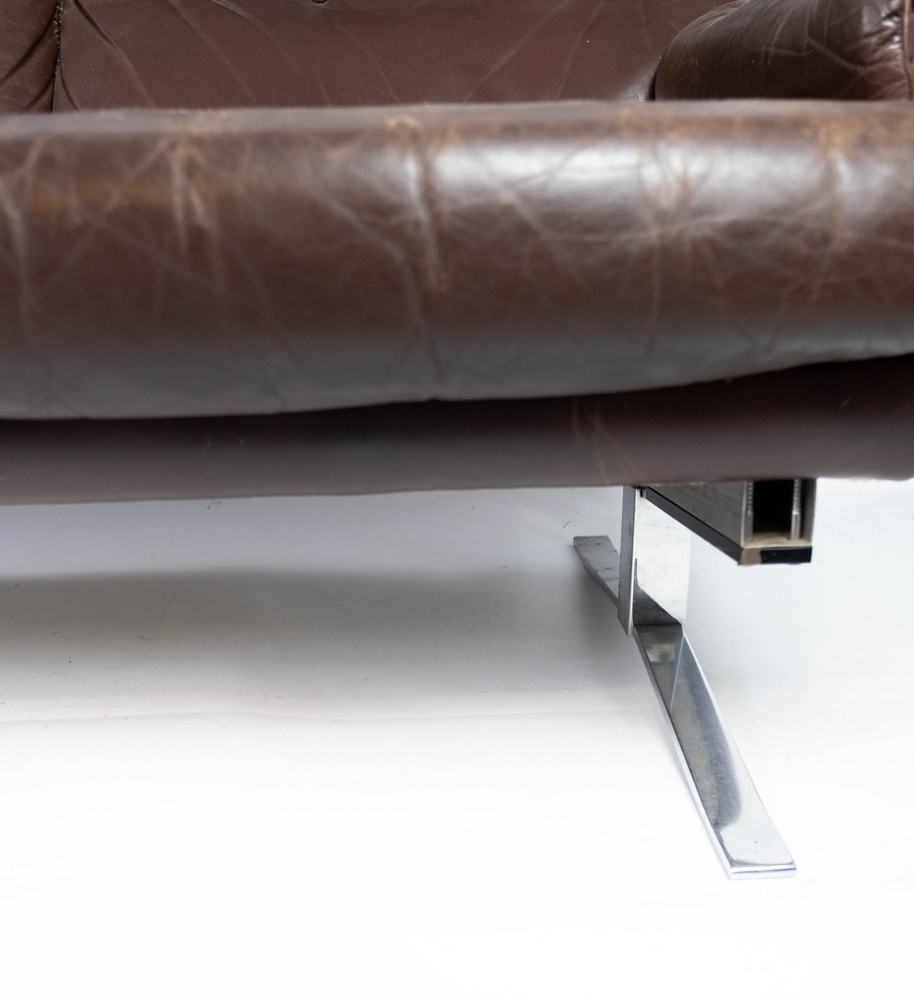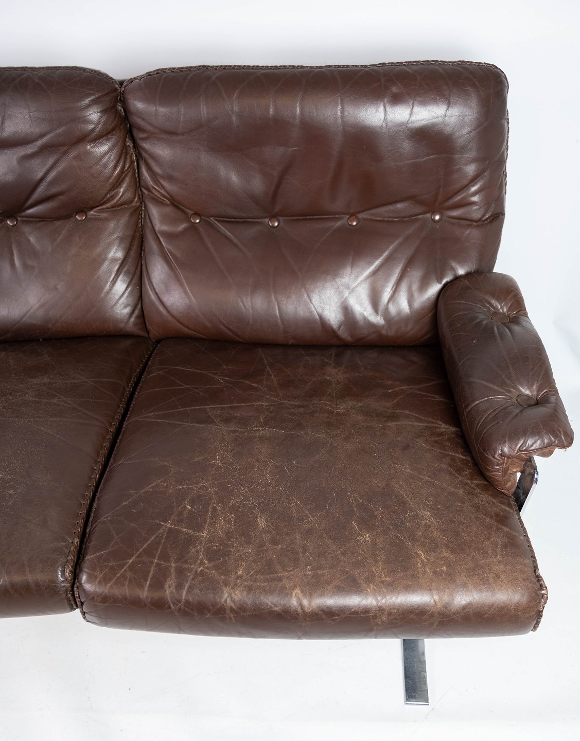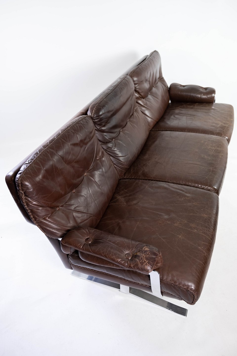 Den tre-personers sofa i brunt patineret læder med et stel i metal, designet af Arne Norell i 1970, er et karakteristisk eksempel på skandinavisk møbeldesign fra det 20. århundrede. Norell var kendt for sit talent for at skabe møbler, der kombinerede komfort, funktionalitet og enestående æstetik, og denne sofa er ingen undtagelse.