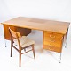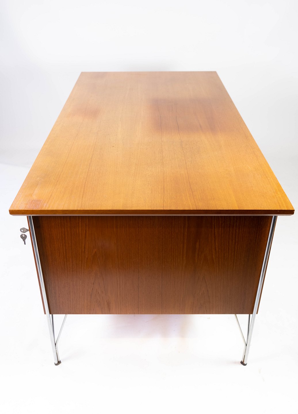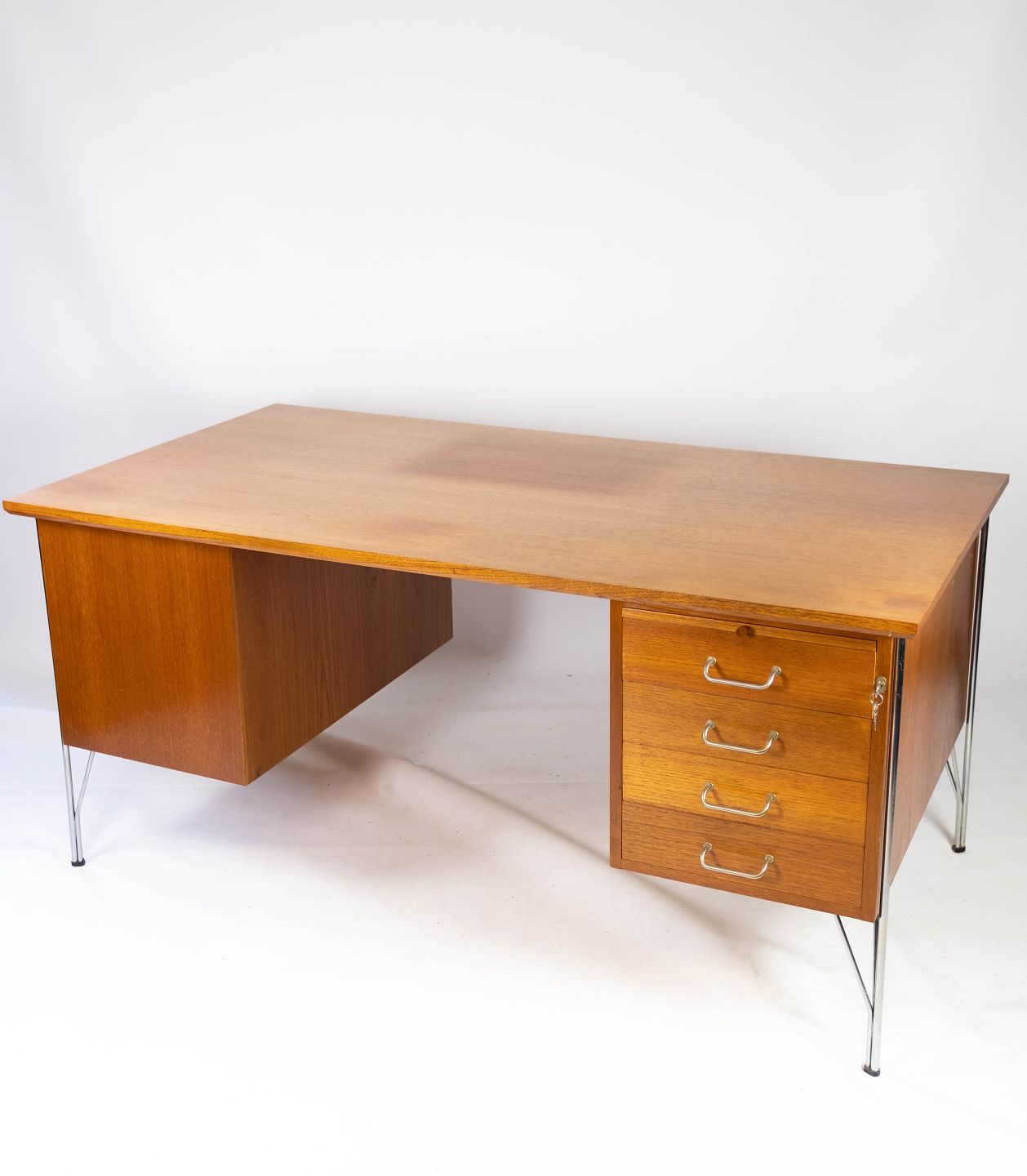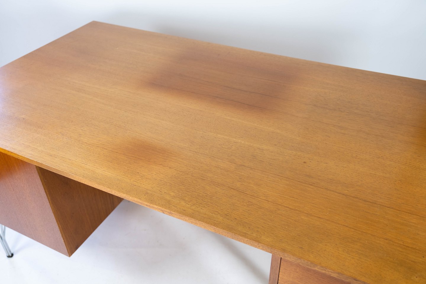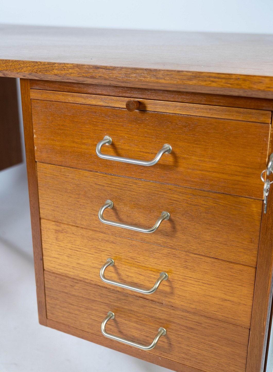 This desk is an example of Danish design from the 1970s and is made of teak wood, which gives it a natural and timeless look. The warm color and the characteristic wood patterns add a unique aesthetic to the room. The desk has a simple and elegant design that fits in well with both modern and classic interiors.