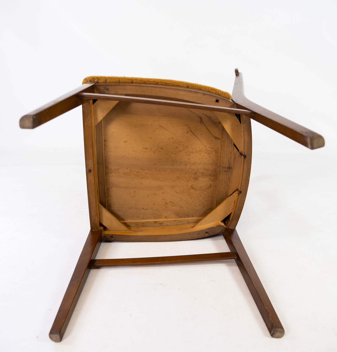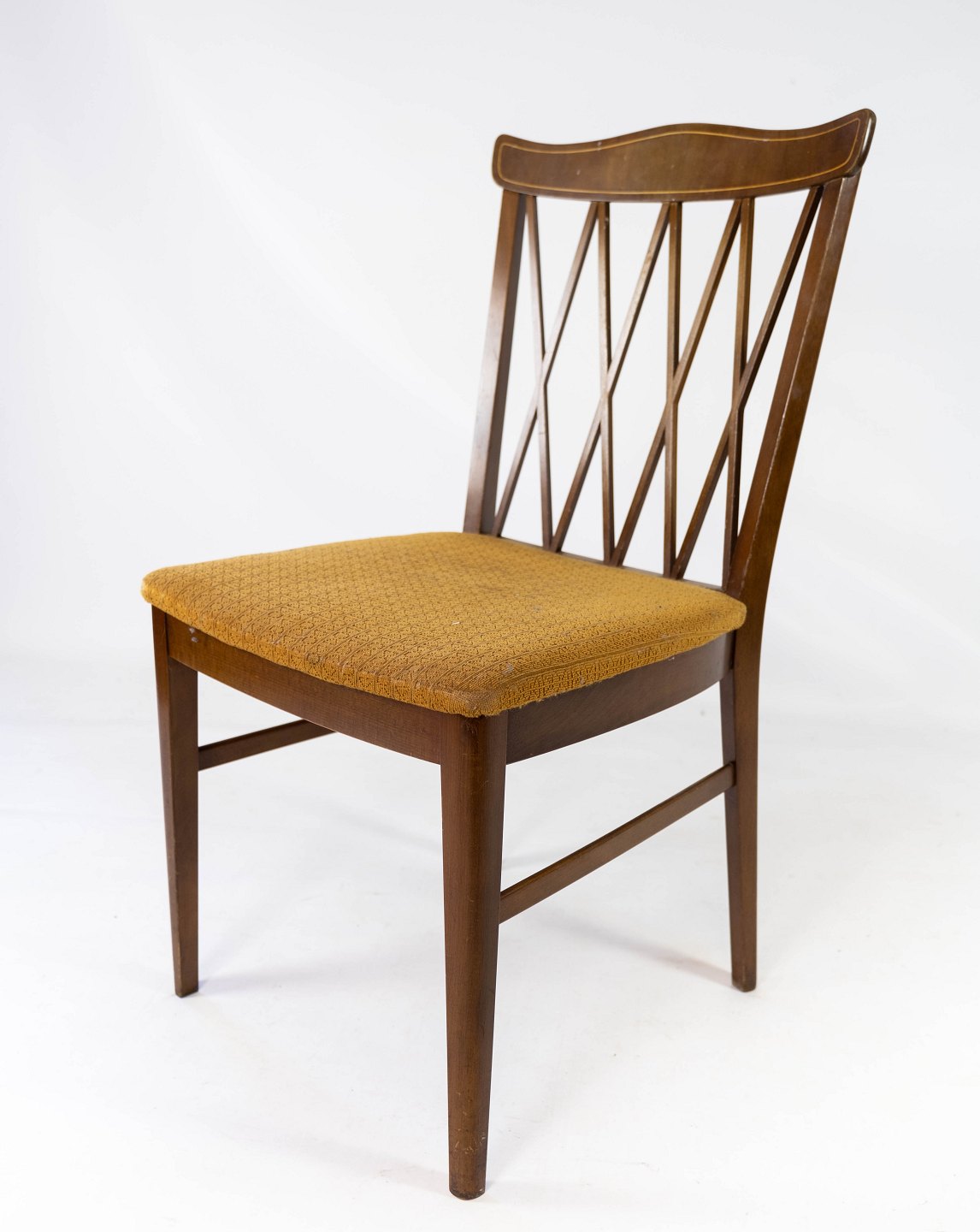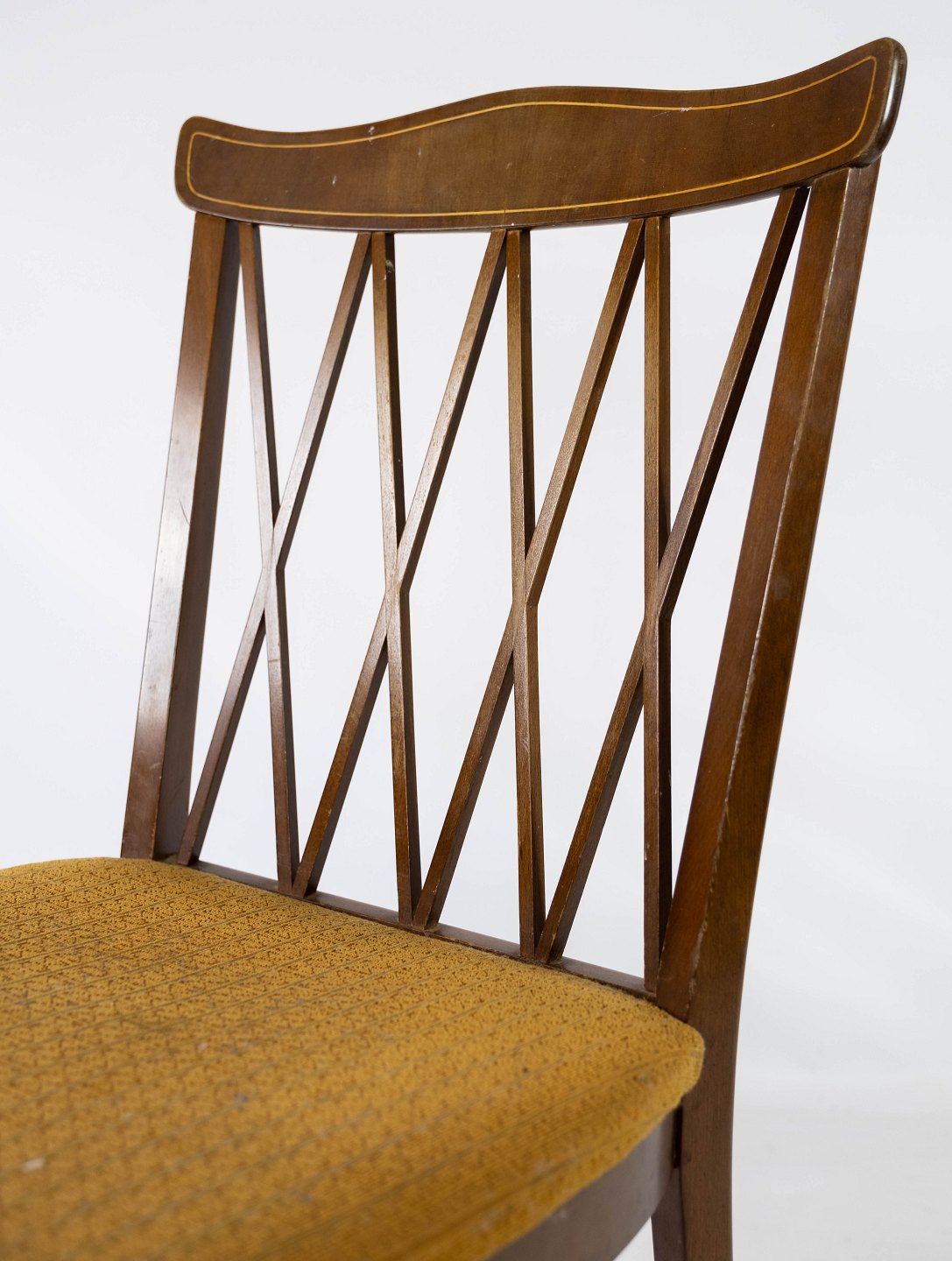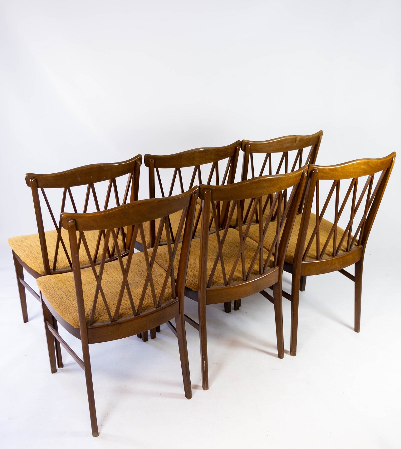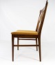 Sæt af seks spisestuestole af nøddetræ og polstret med mørkt stof fra 1940erne. Stolene er i flot brugt stand.