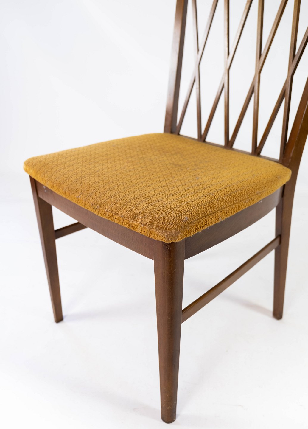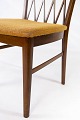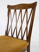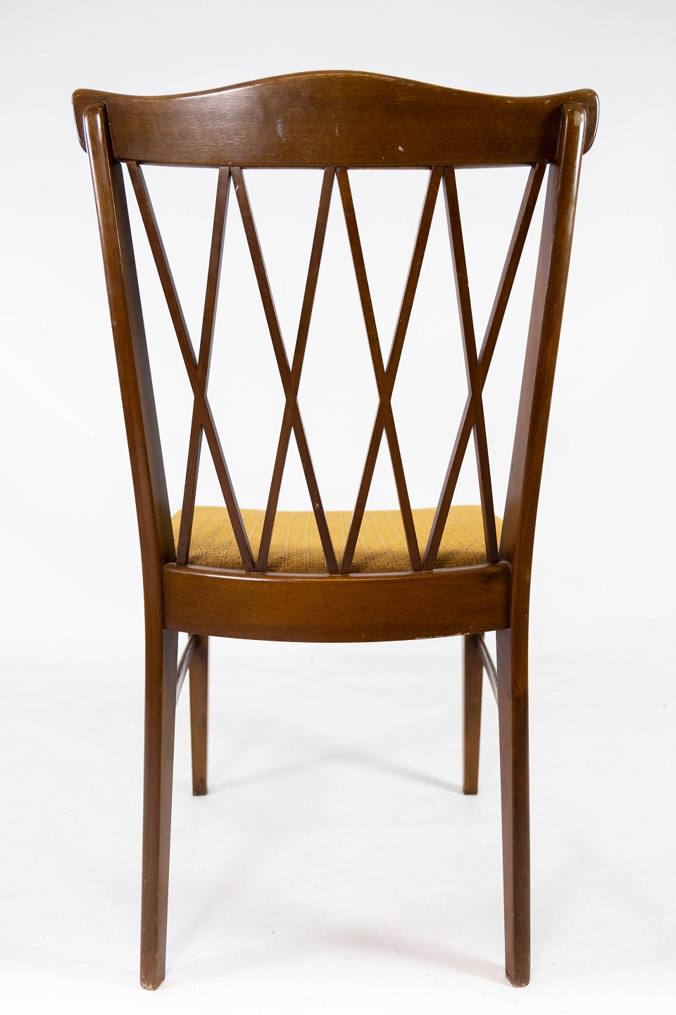 Sæt af seks spisestuestole af nøddetræ og polstret med mørkt stof fra 1940erne.