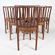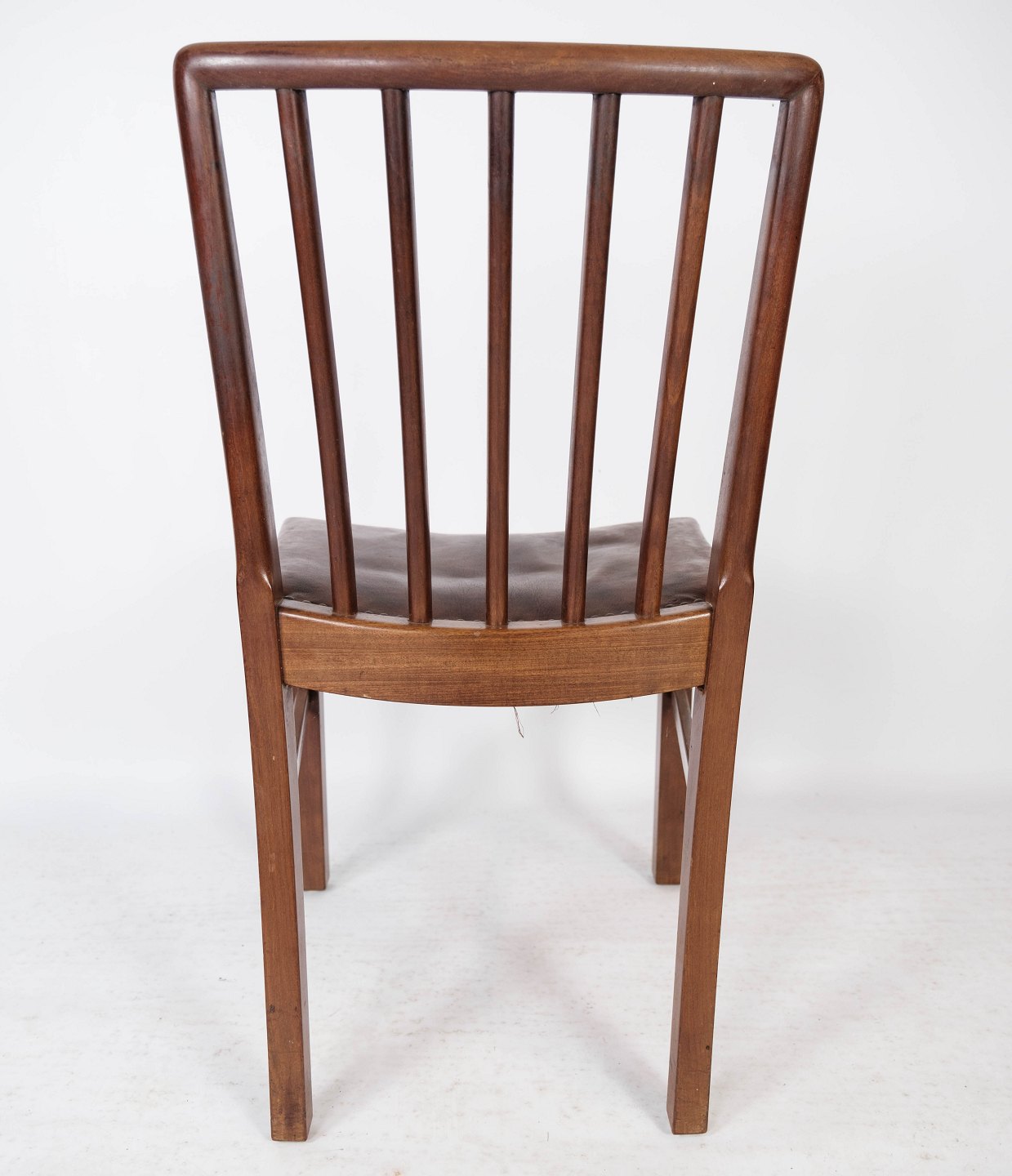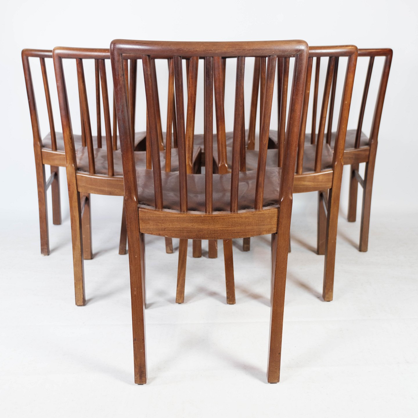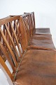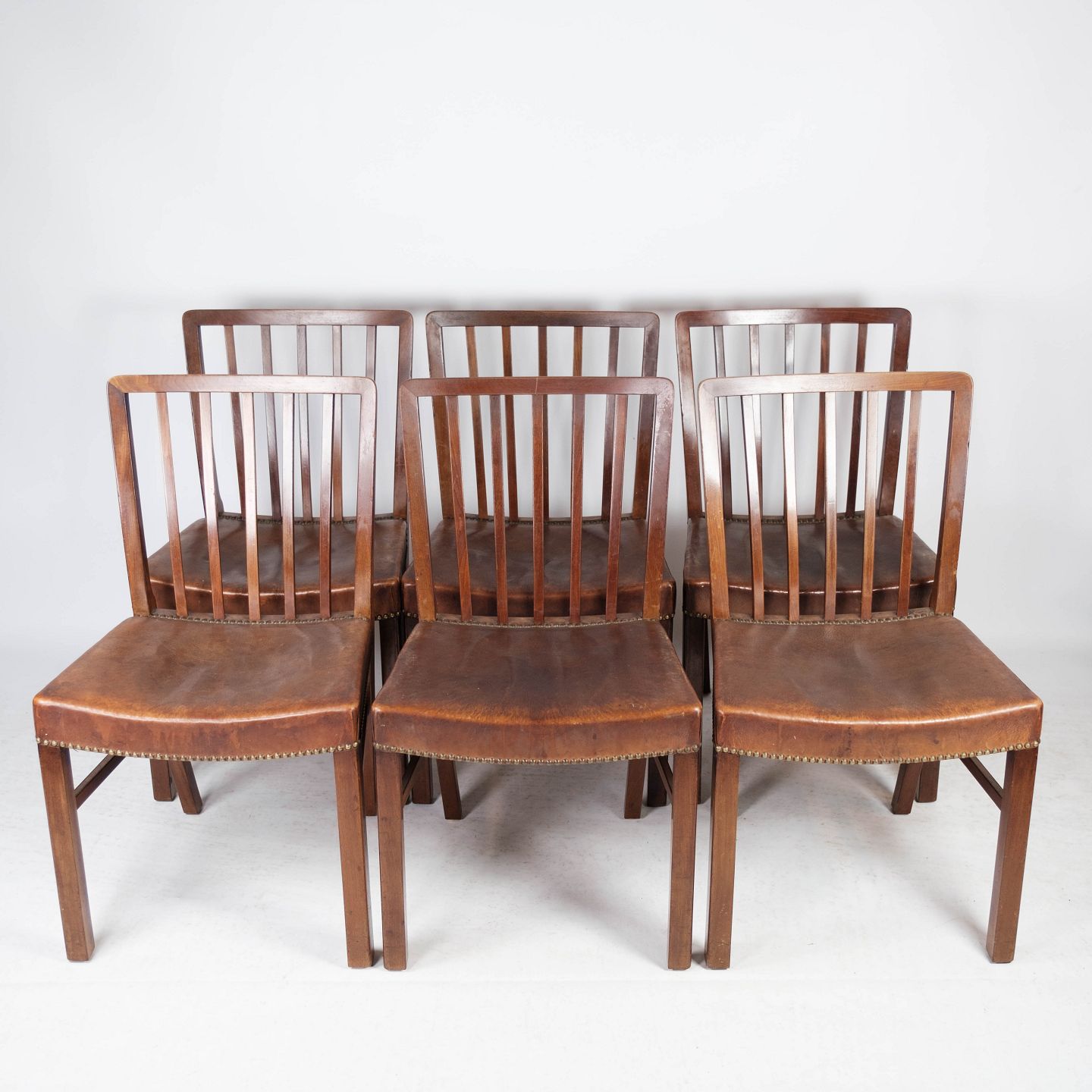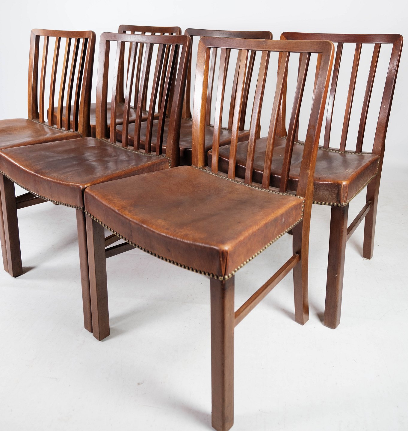 Set of six dining room chairs of mahogany and upholstered with brown patinated leather manufactured by Fritz Hansen in the 1940s.
