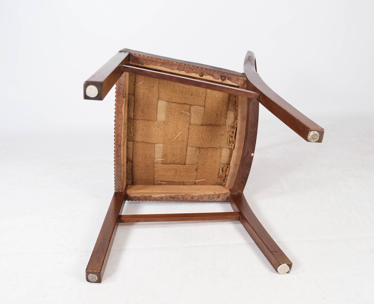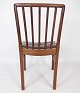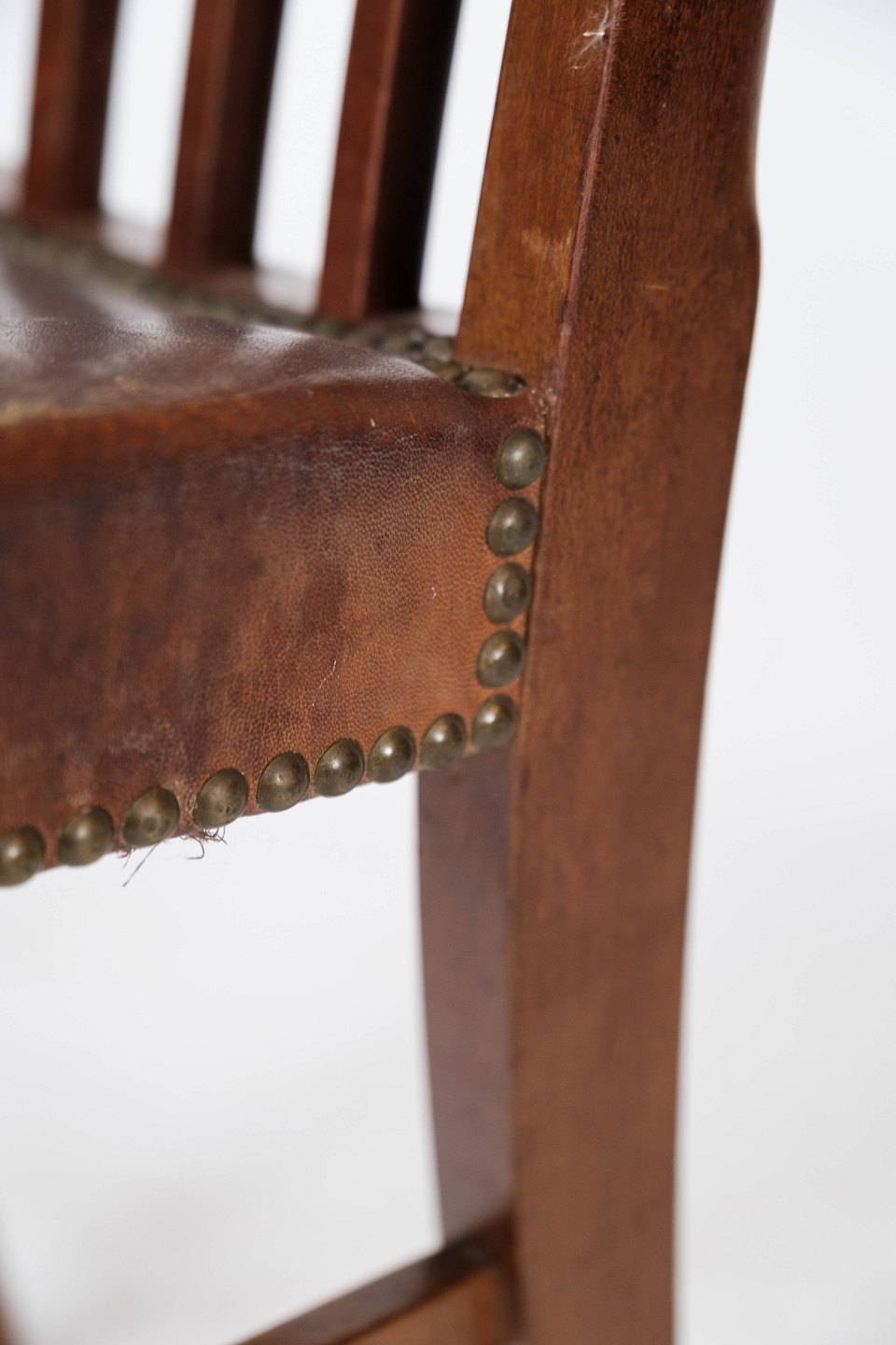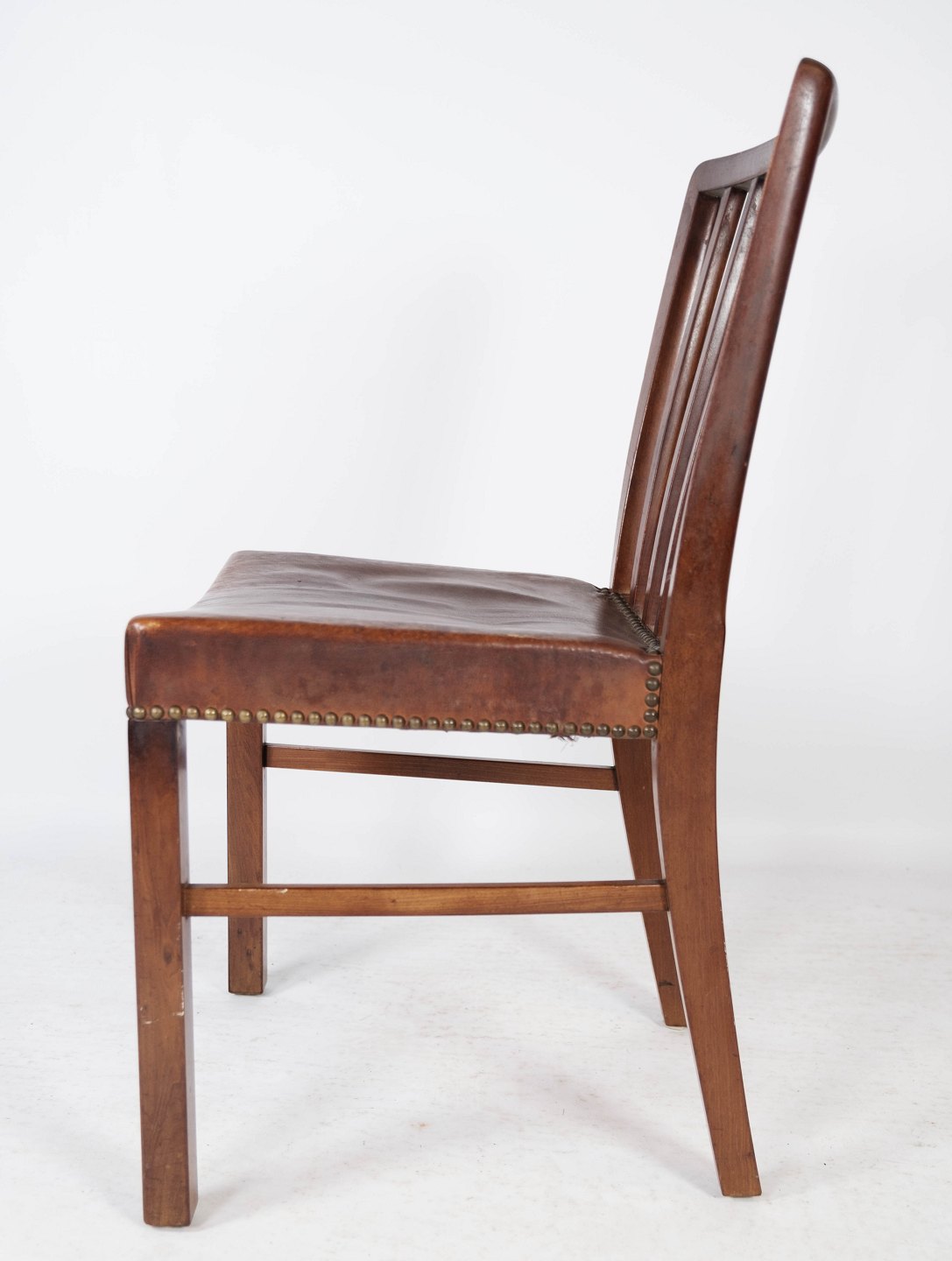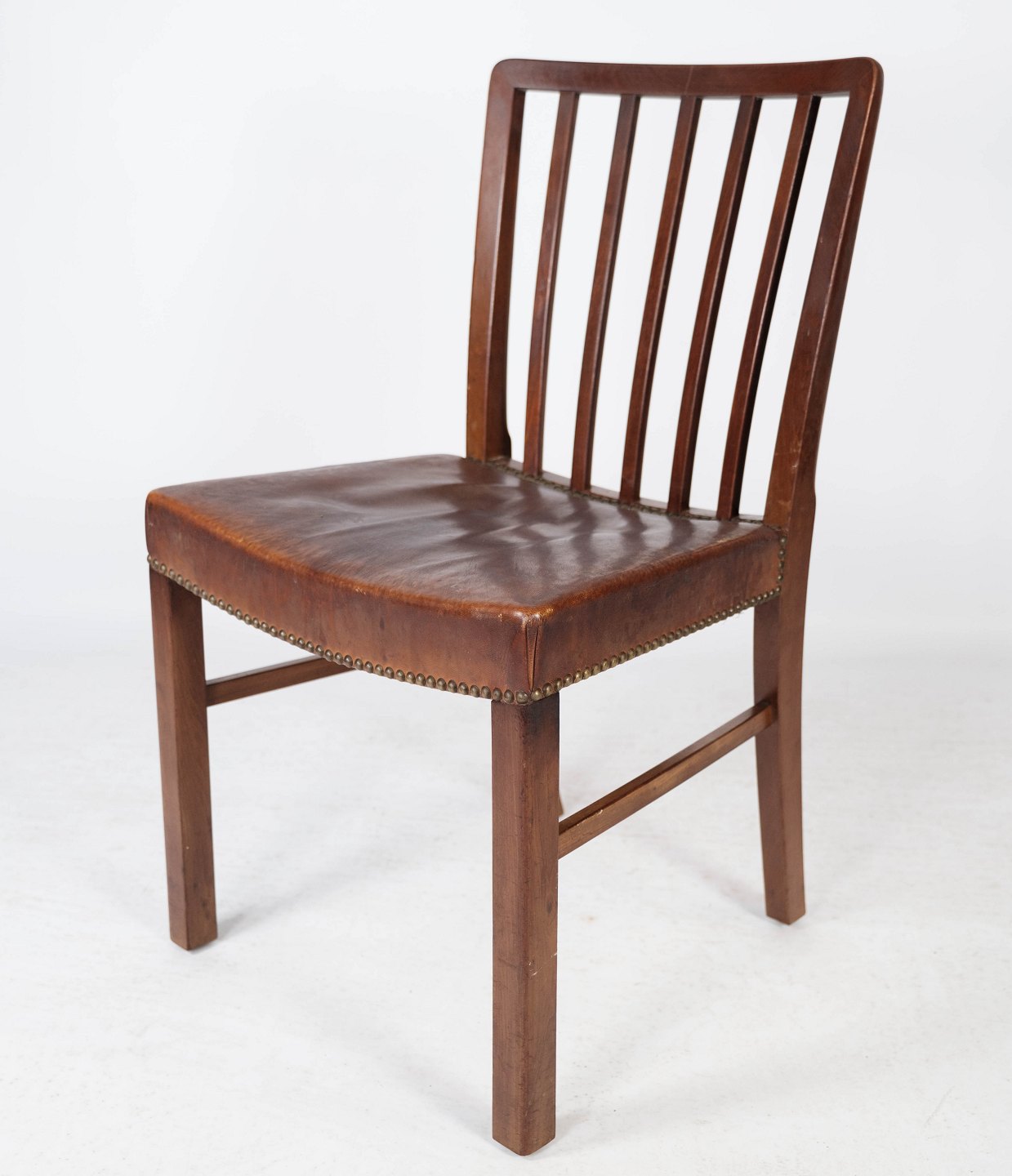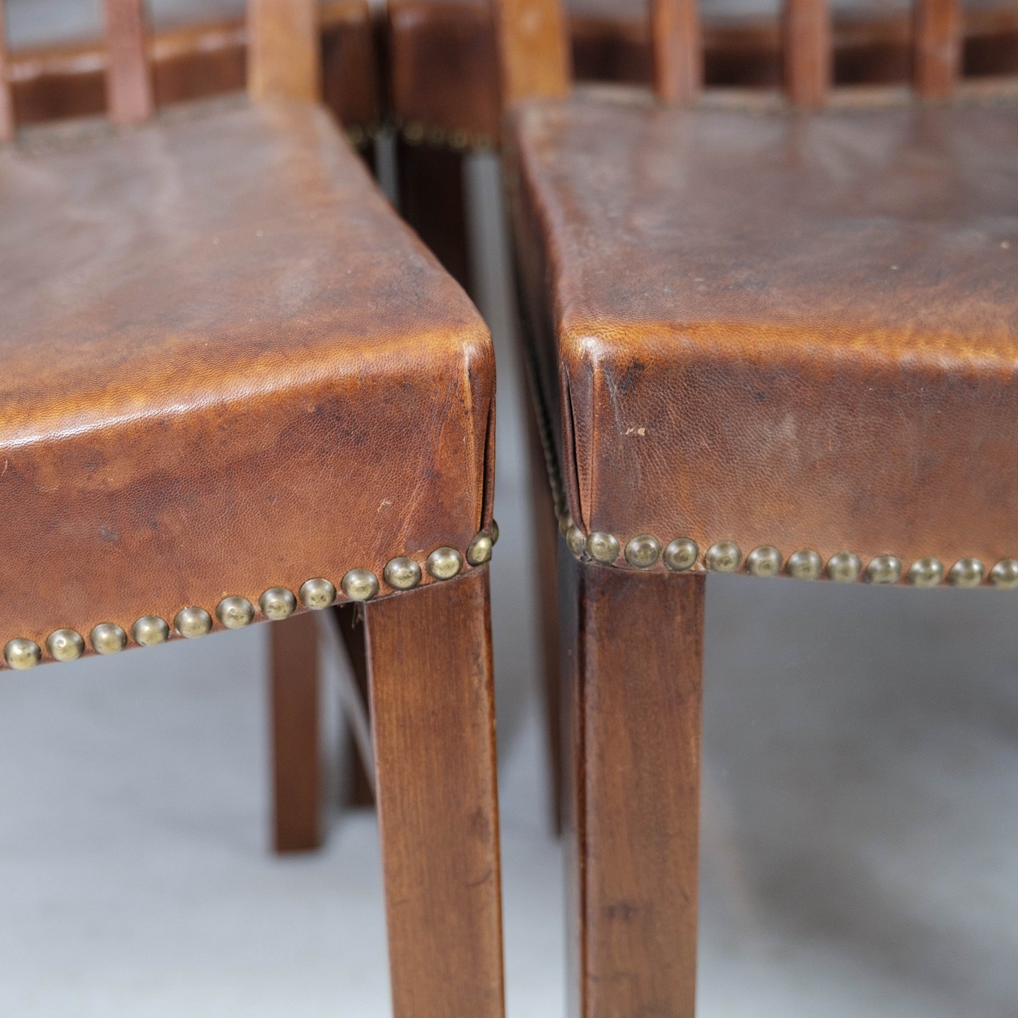 Set of six dining room chairs of mahogany and upholstered with brown patinated leather manufactured by Fritz Hansen in the 1940s.
