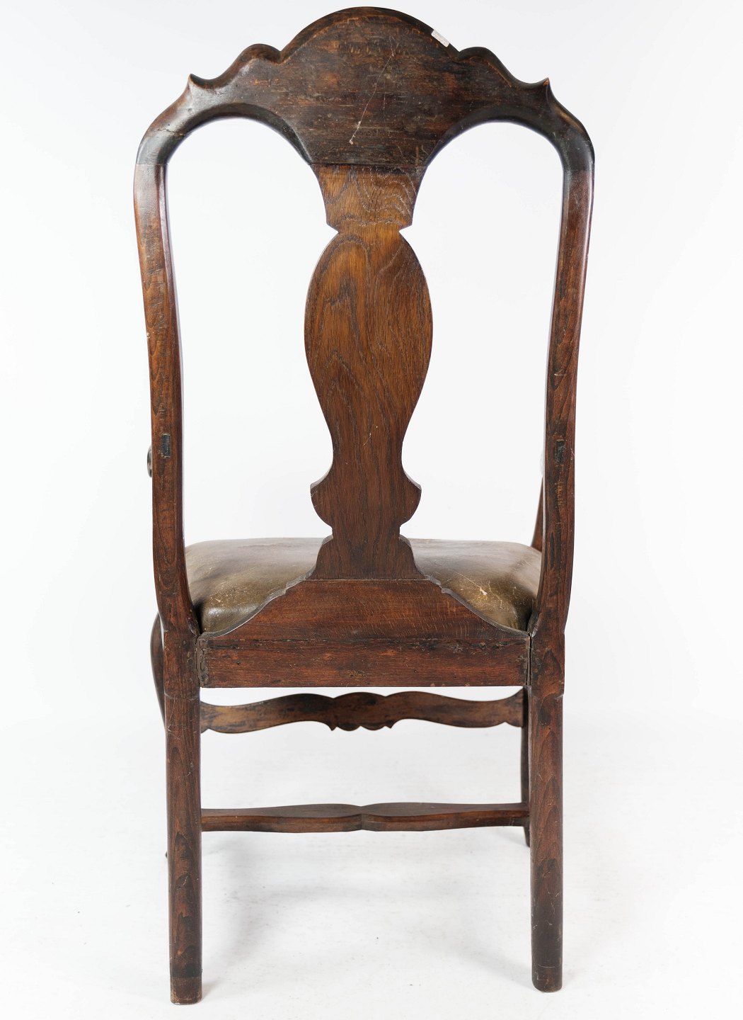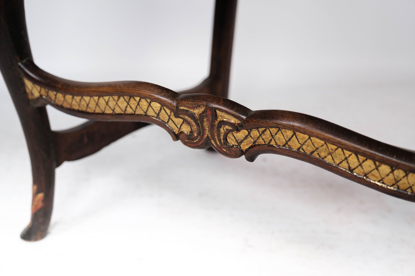 Baroque armchair of dark wood decorated with gold leaf and upholstered with dark leather from 1860.