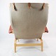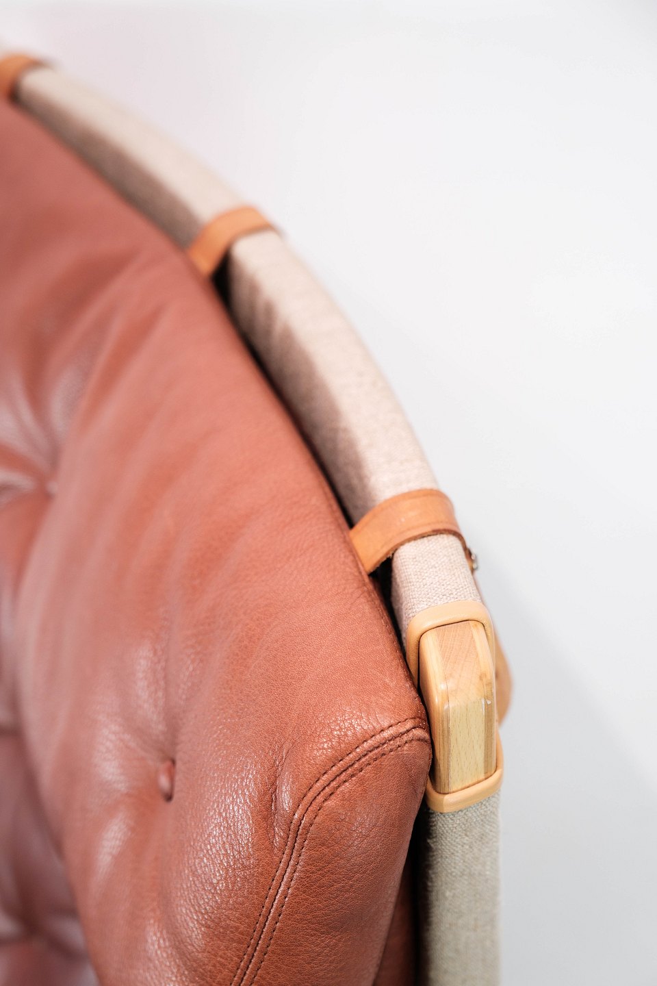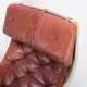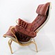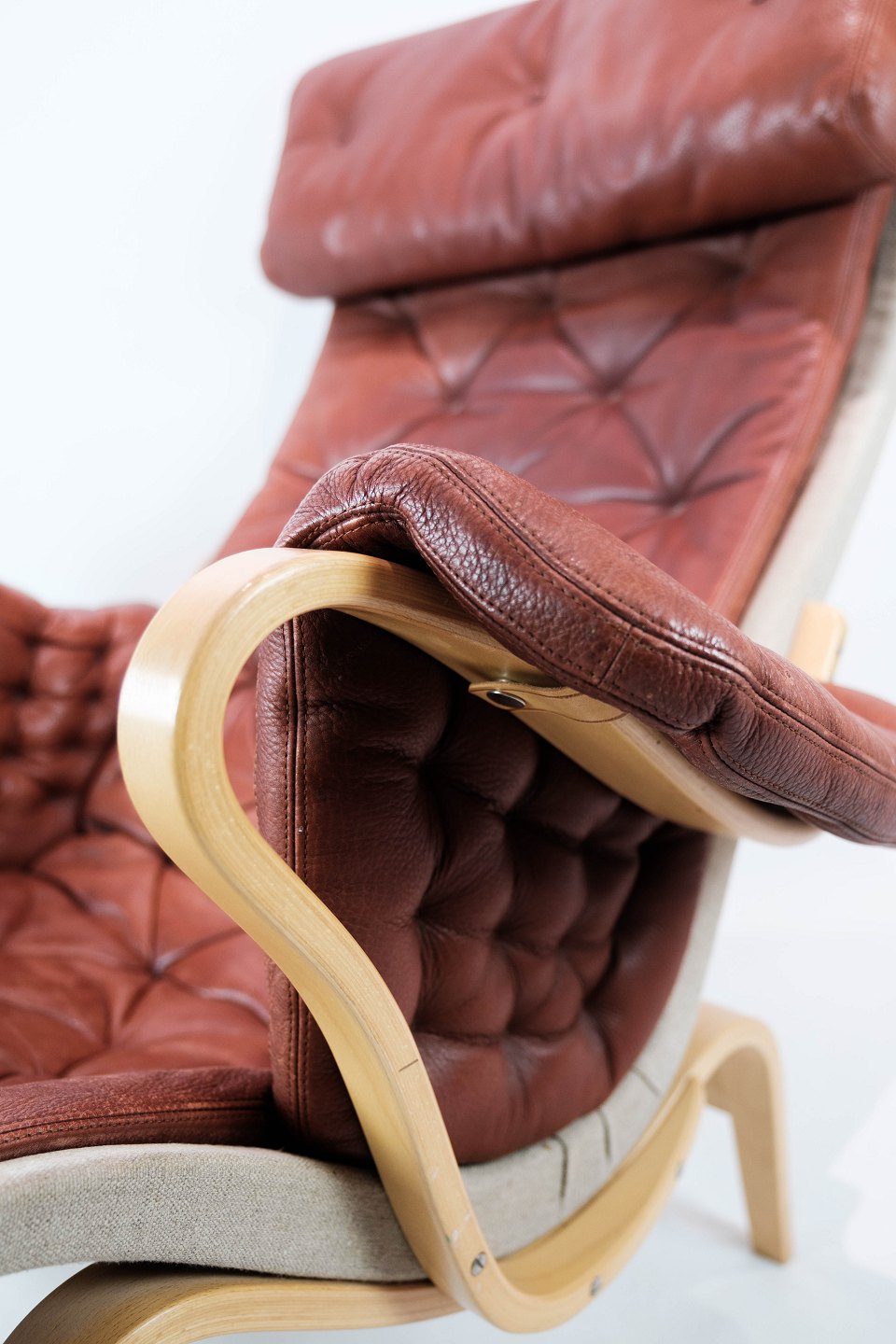 Pernilla easy chair with stool of beech and upholstered with red leather designed by Bruno Mathsson and manufactured by Dux in the 1970s.