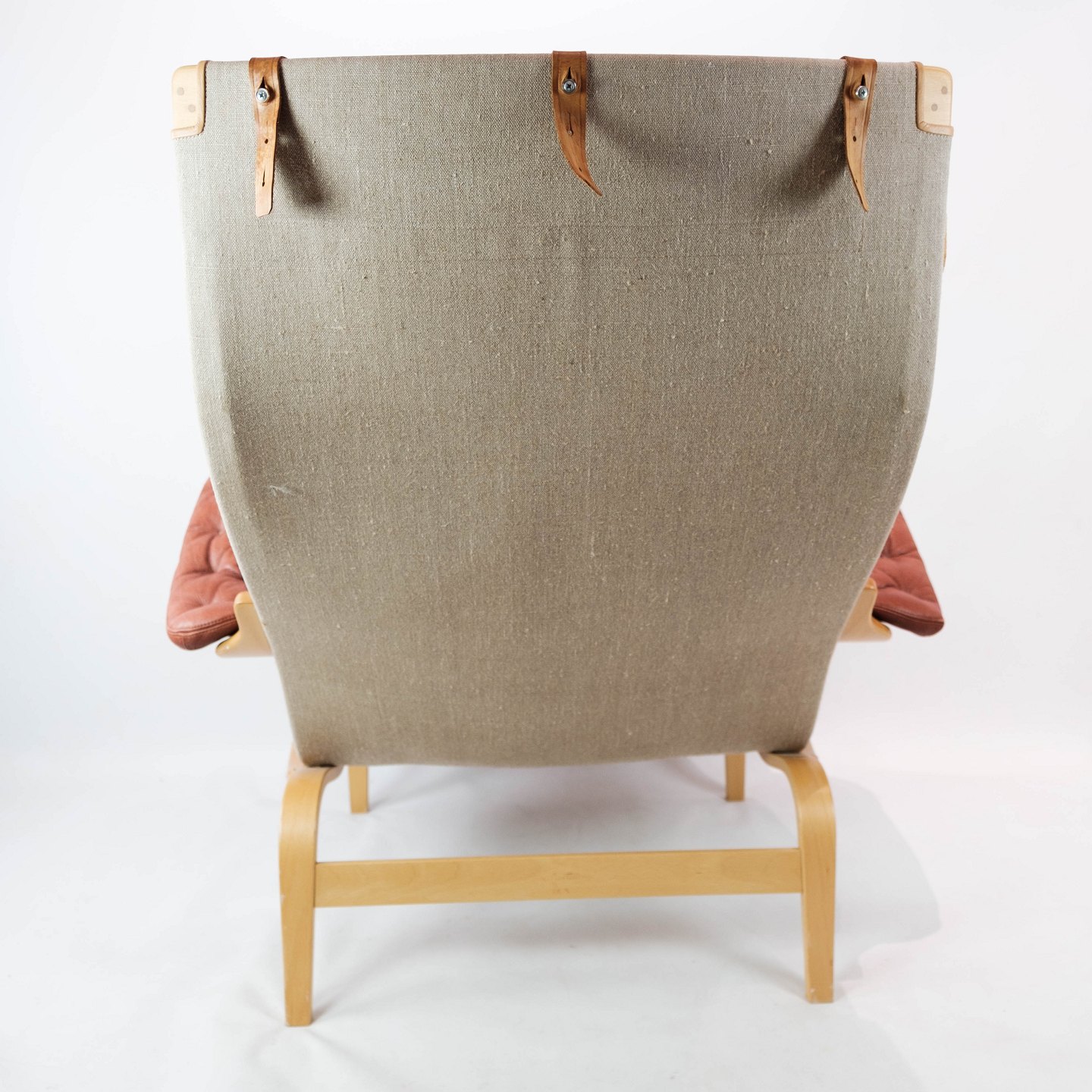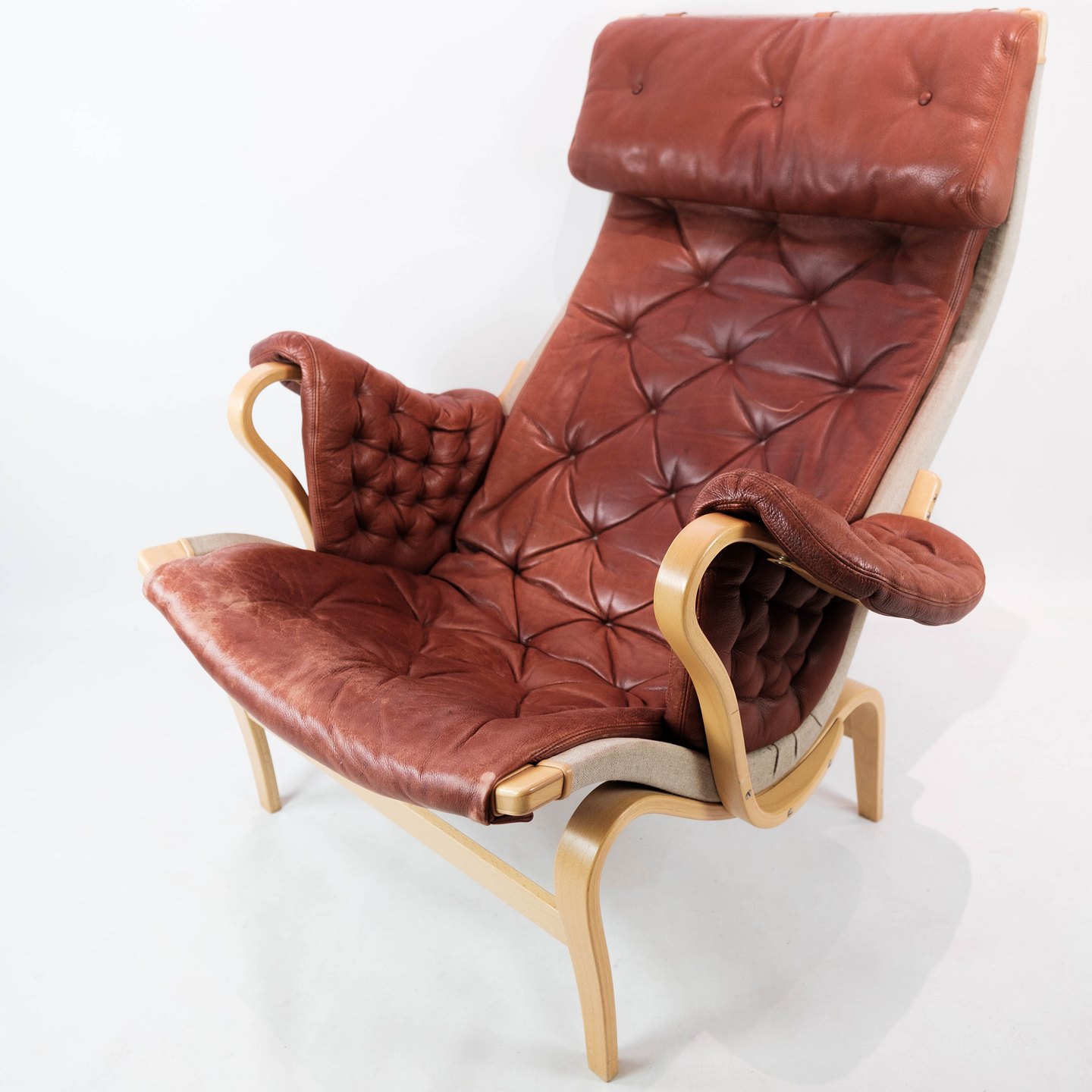 Pernilla easy chair with stool of beech and upholstered with red leather designed by Bruno Mathsson and manufactured by Dux in the 1970s. The chair is in great vintage condition.