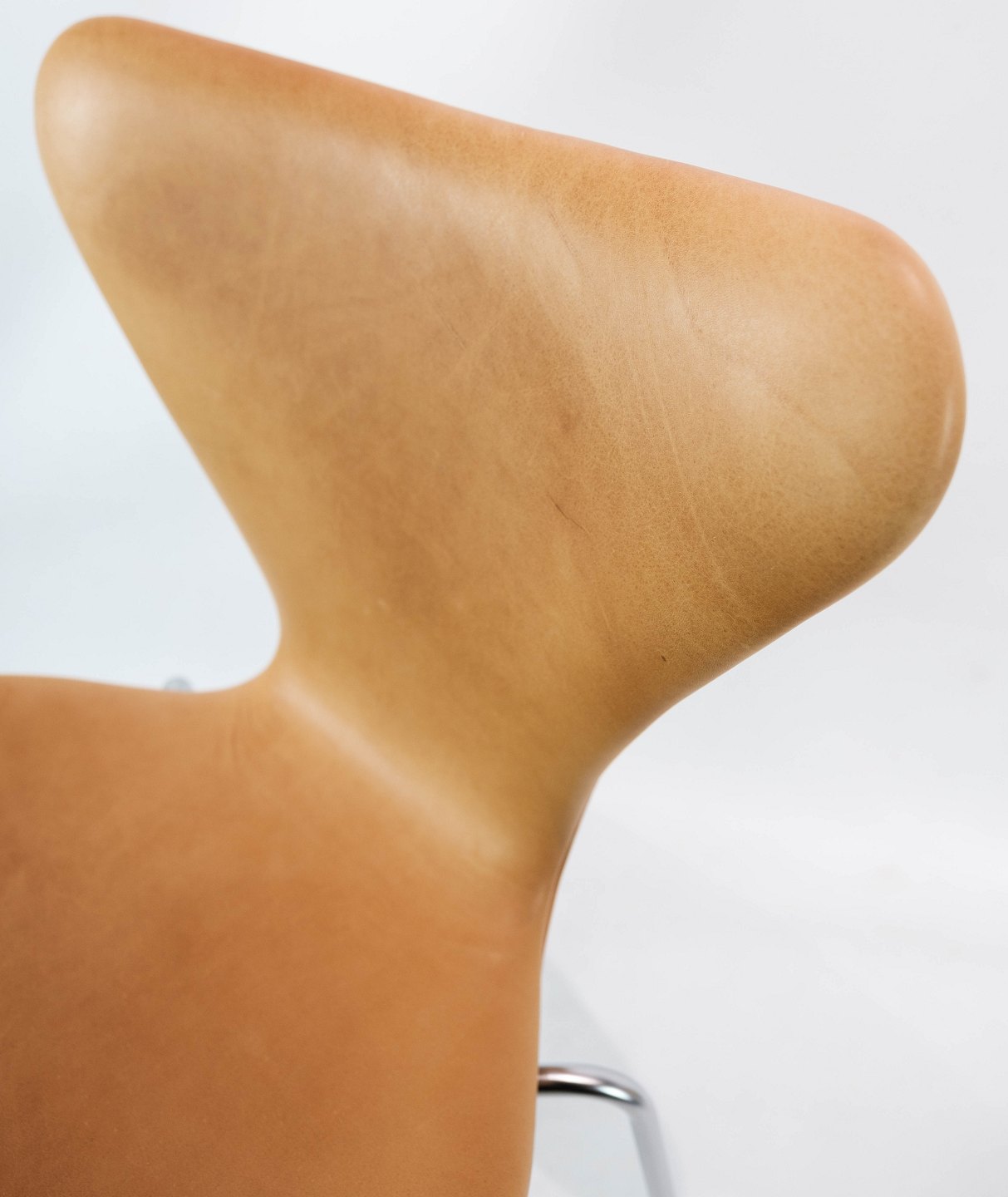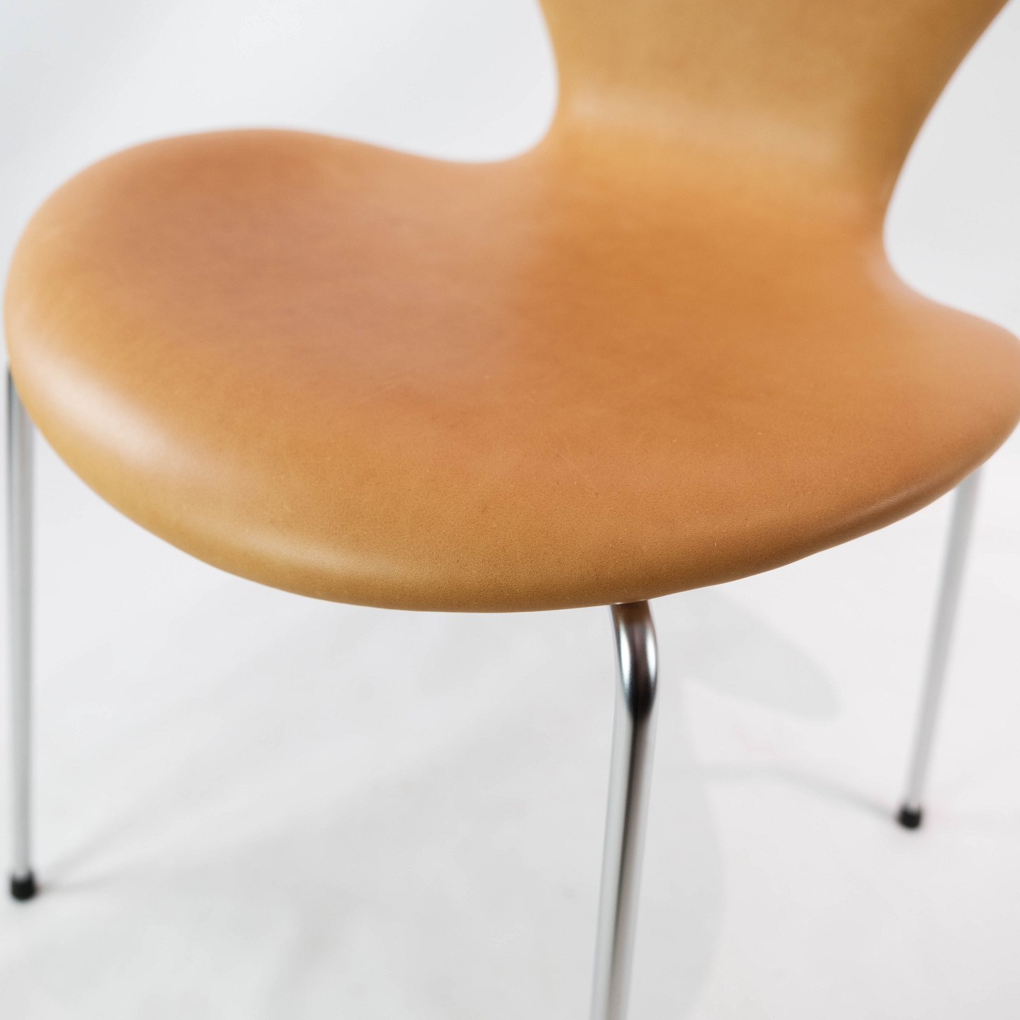 This set of four Seven chairs, also known as Model 3107, is an example of Danish design by Arne Jacobsen and manufactured by Fritz Hansen. The chairs are upholstered in patinated cognac leather, which adds a warm and welcoming atmosphere to any room.
